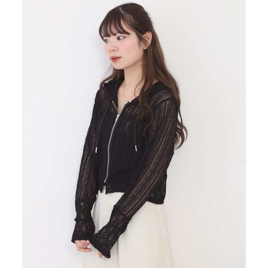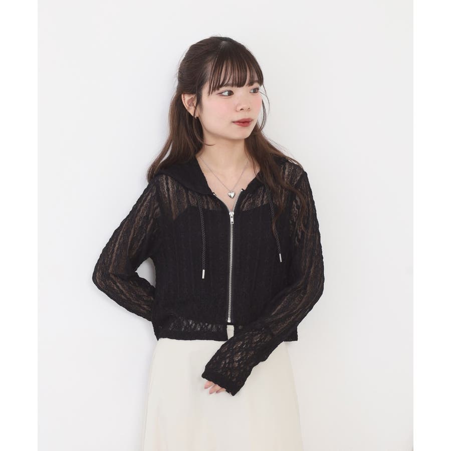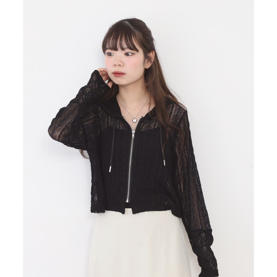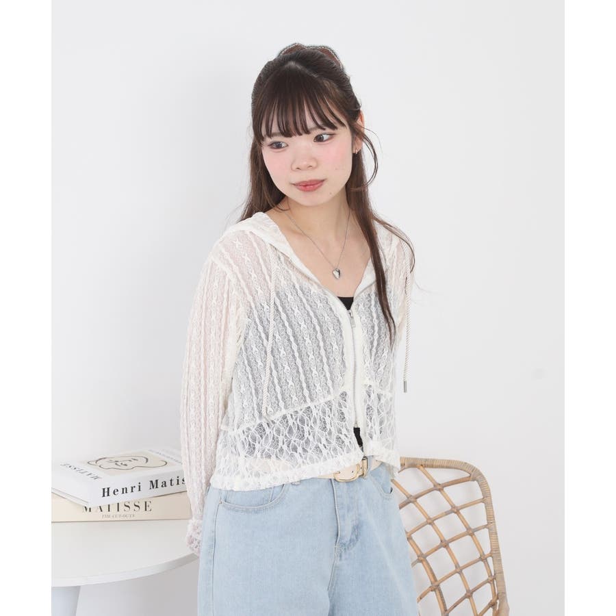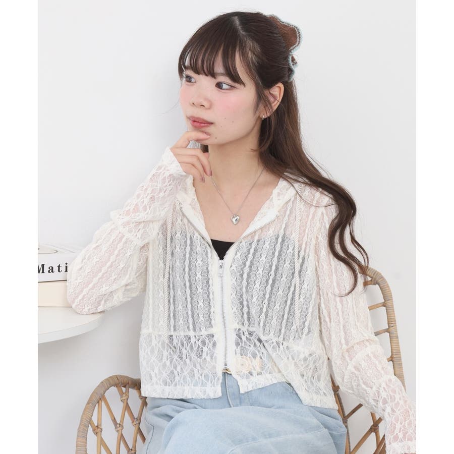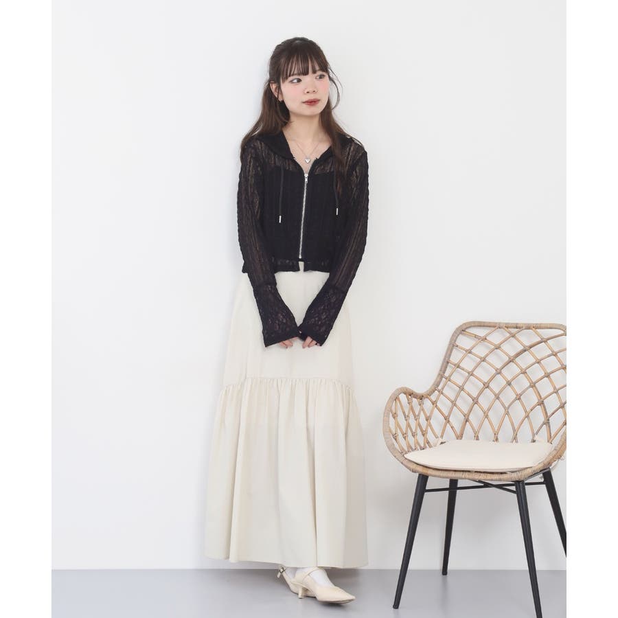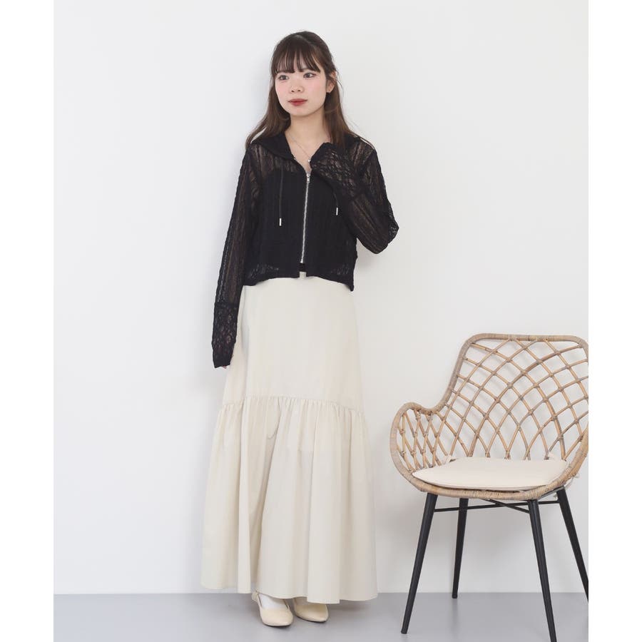 トップスはリブタンクをインナーに仕込み、その上からブルゾンを羽織ることでレースの透け感が自然に際立つ。