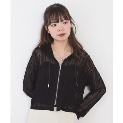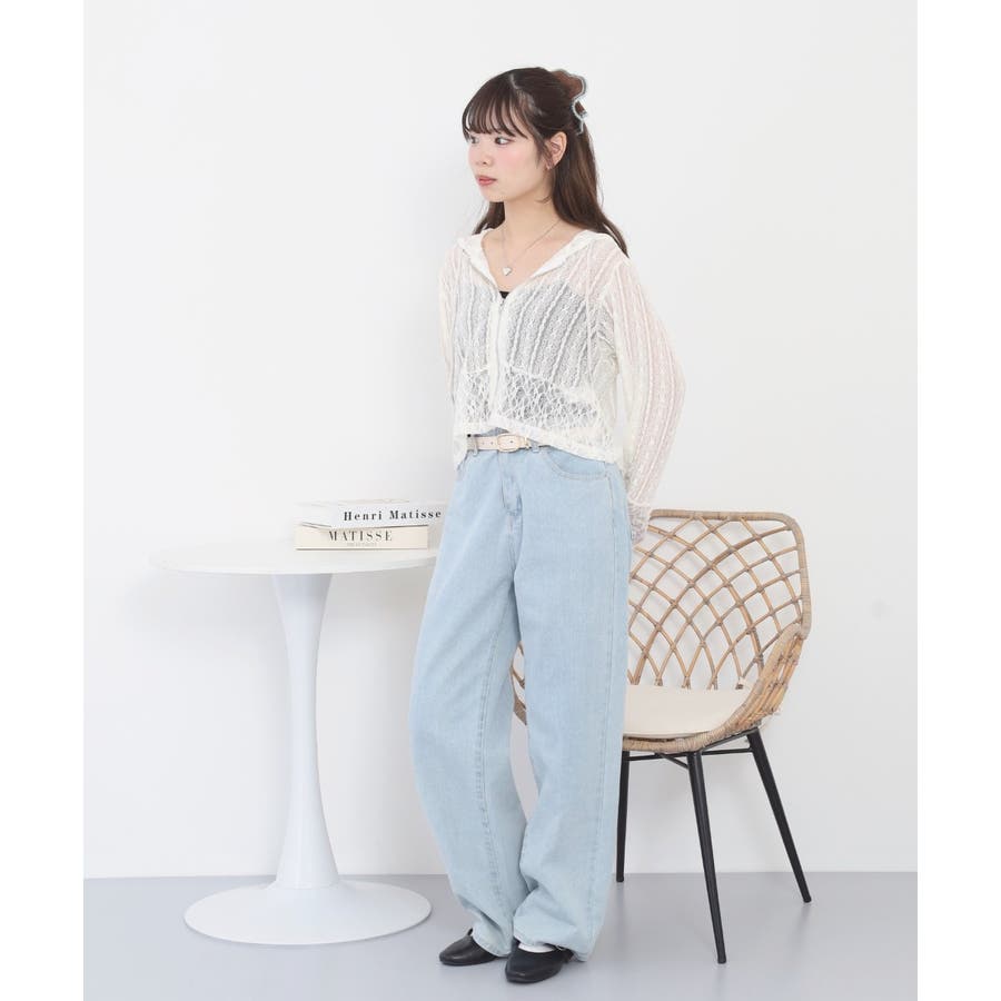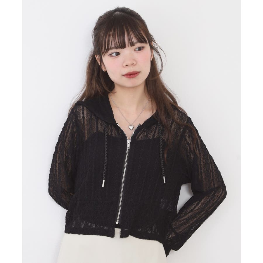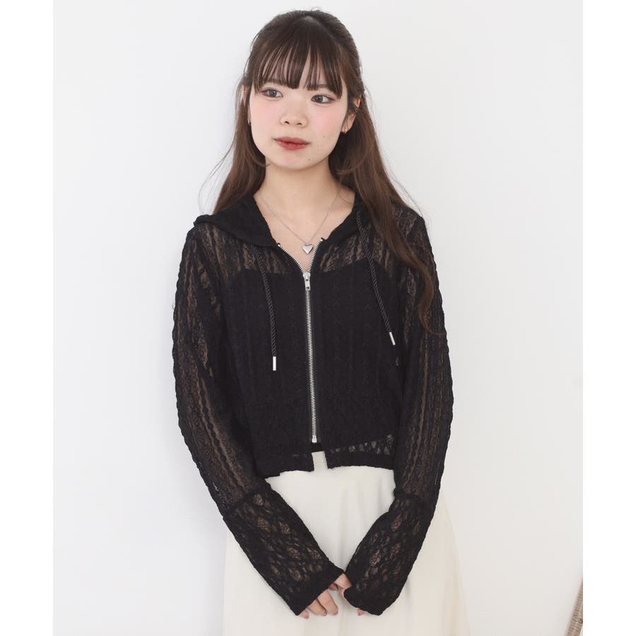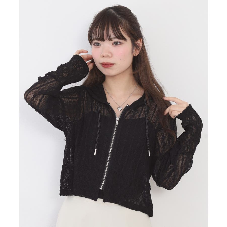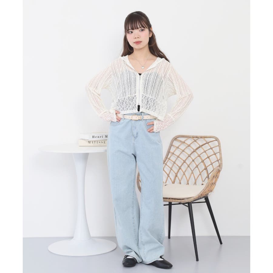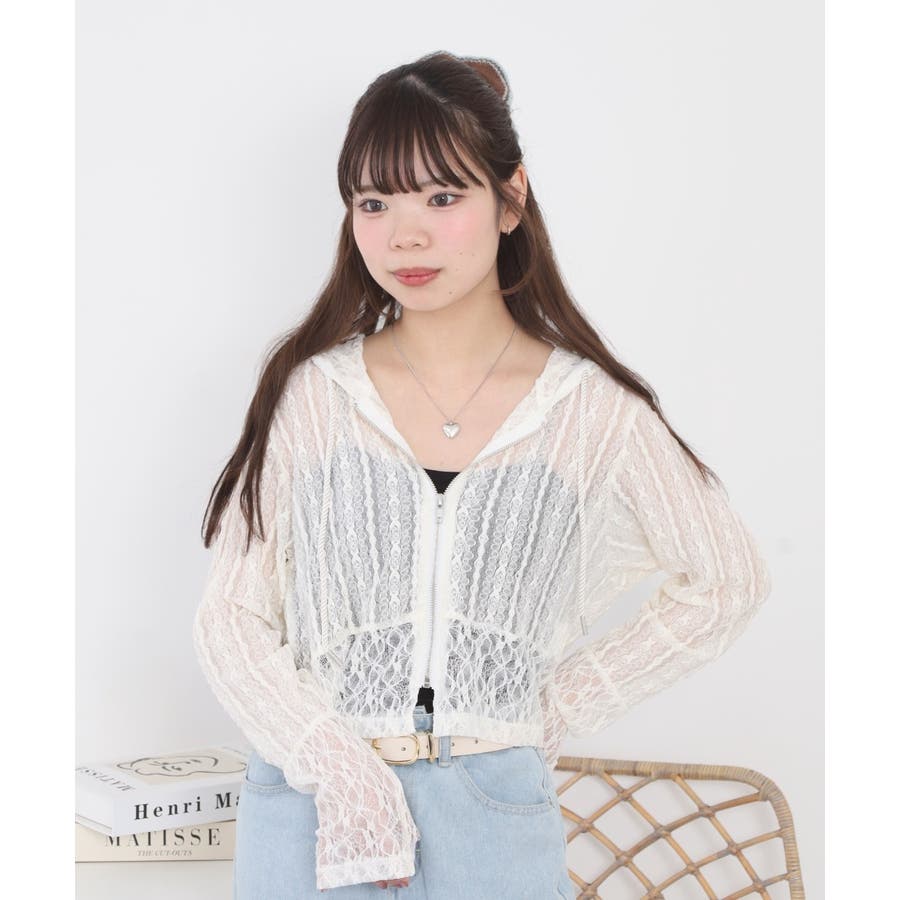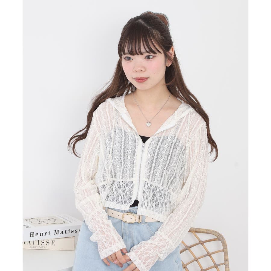 トップスはリブタンクをインナーに仕込み、その上からブルゾンを羽織ることでレースの透け感が自然に際立つ。