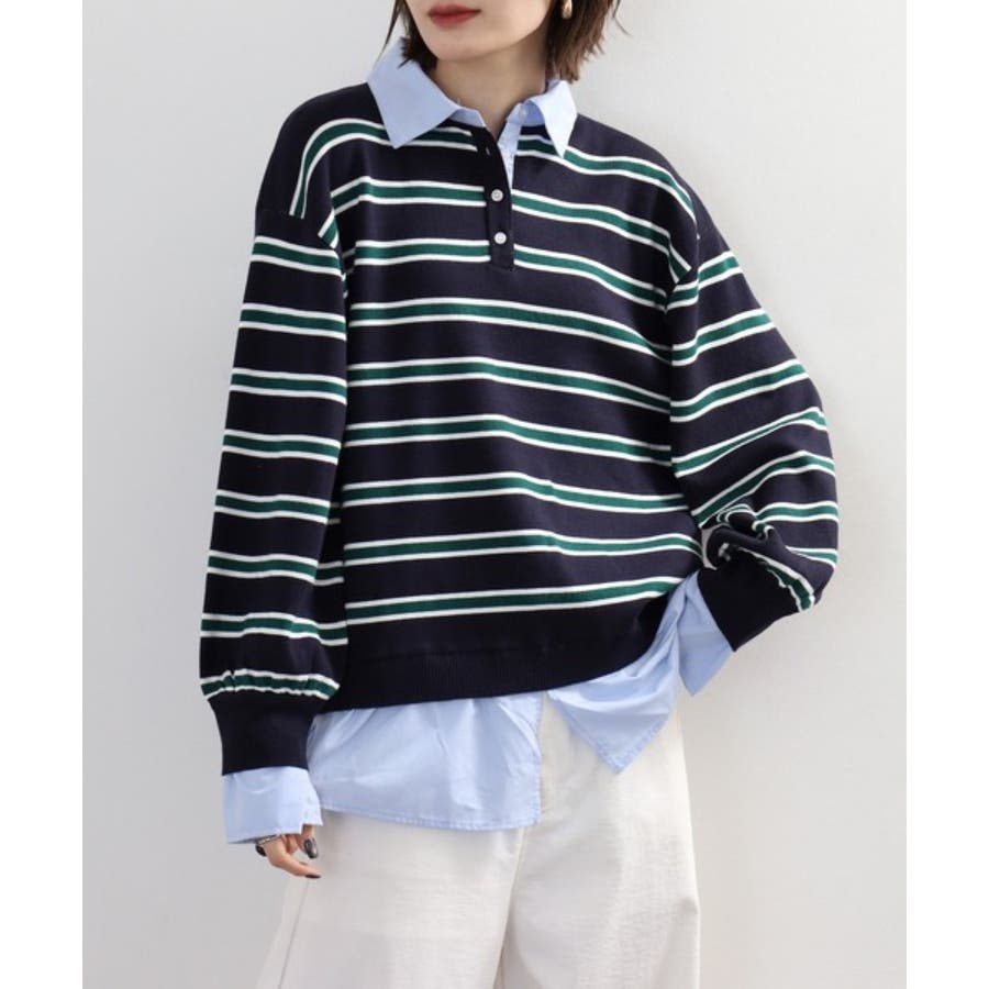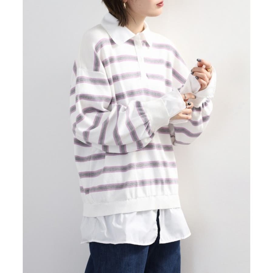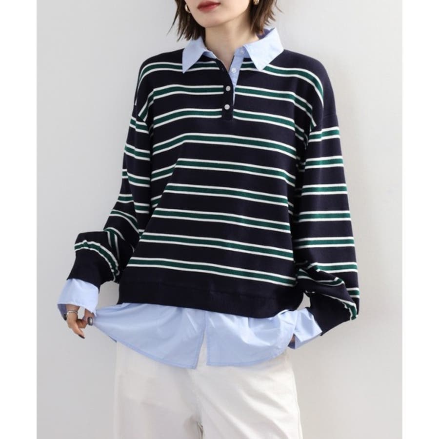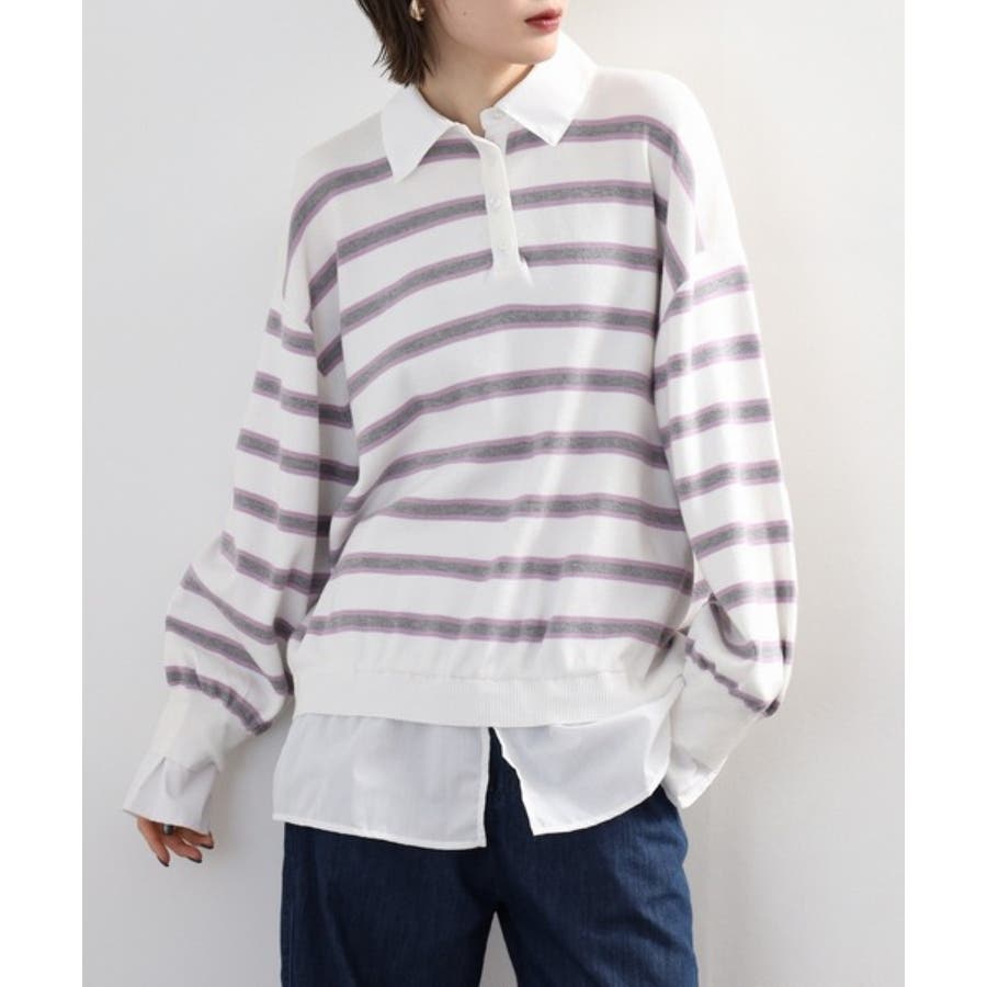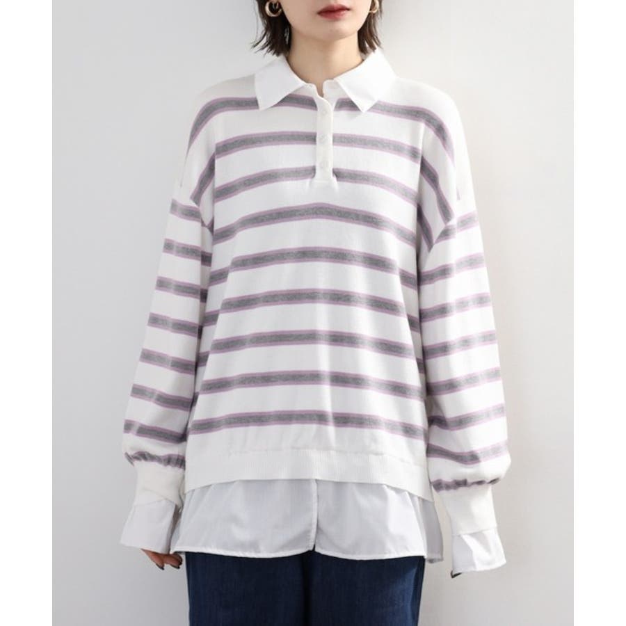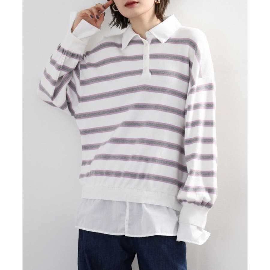 シャツドッキングレイヤード風ランダムボーダーニットプルオーバー
