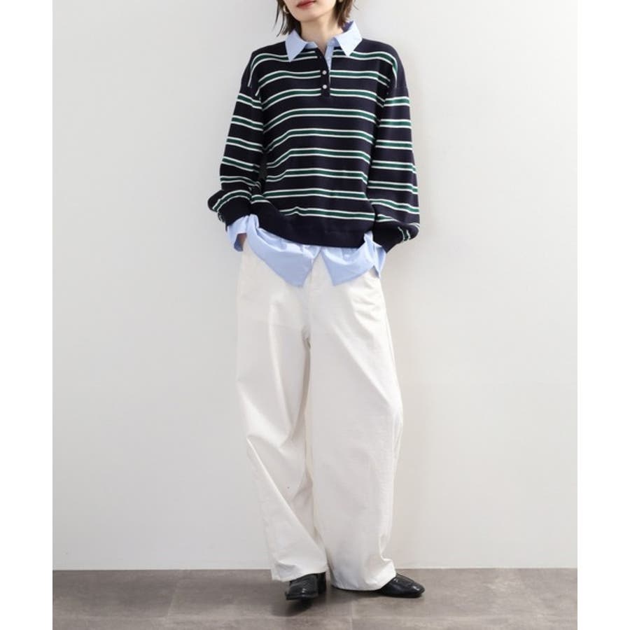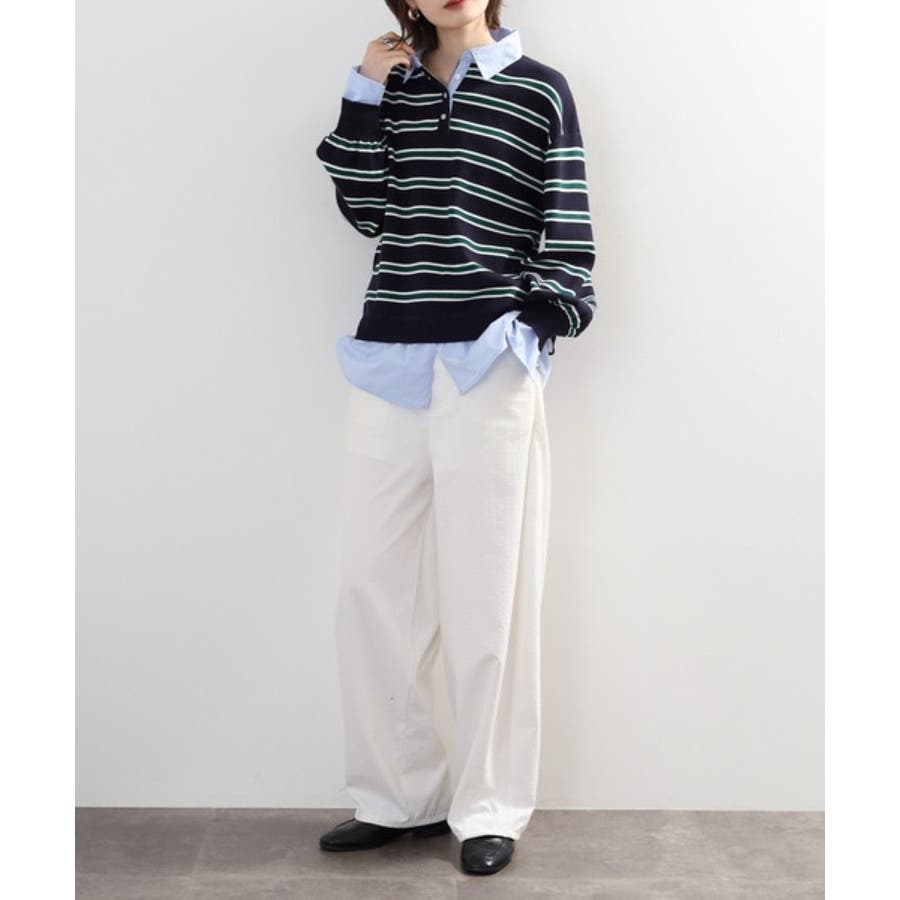ニットの下にはあえてインナーを入れず、ボトムにセンタープレス入りのテーパードパンツを合わせると、ランダムボーダーの遊び心とシャツのきちんと感が絶妙に調和します。