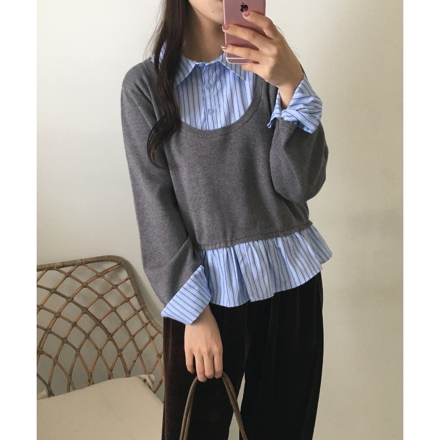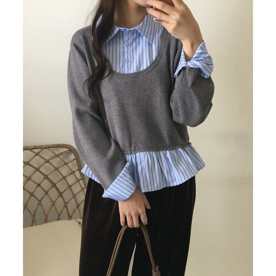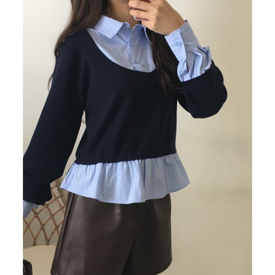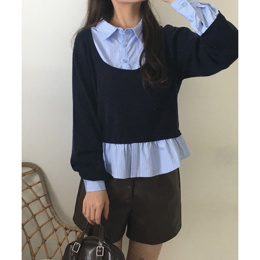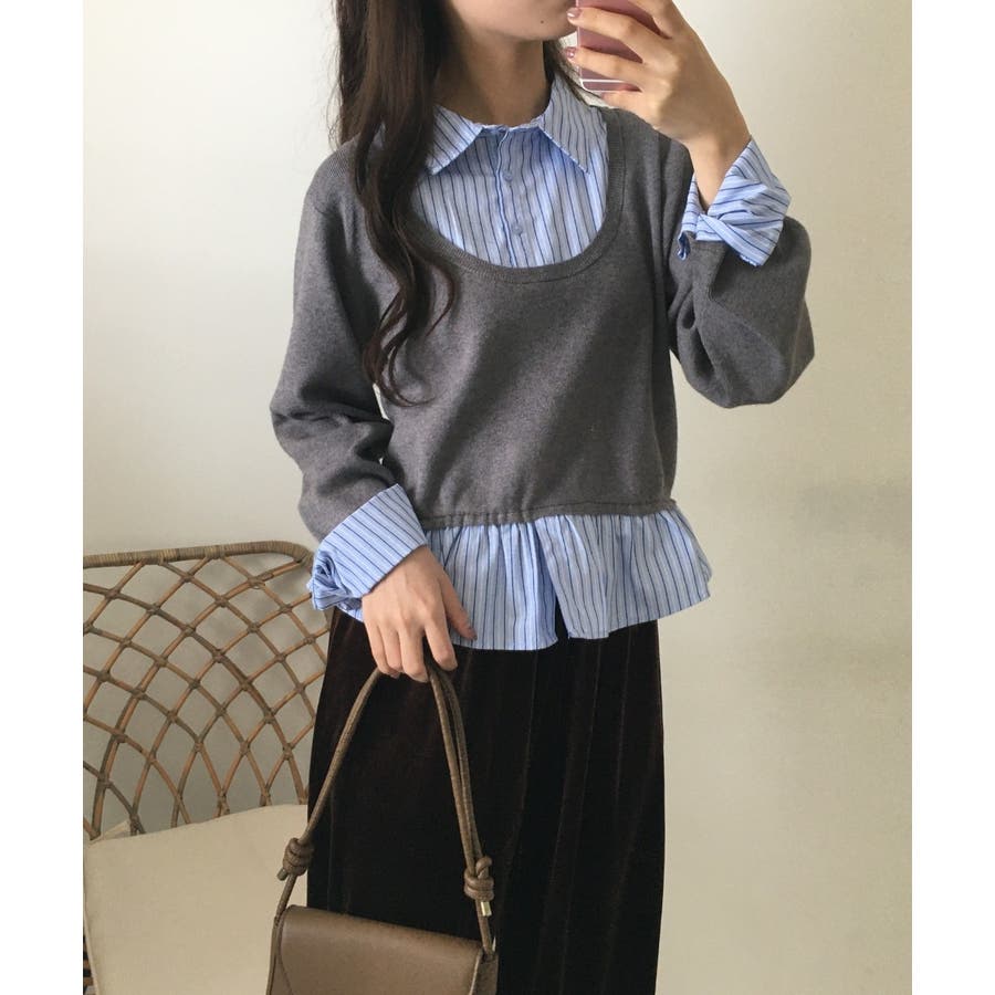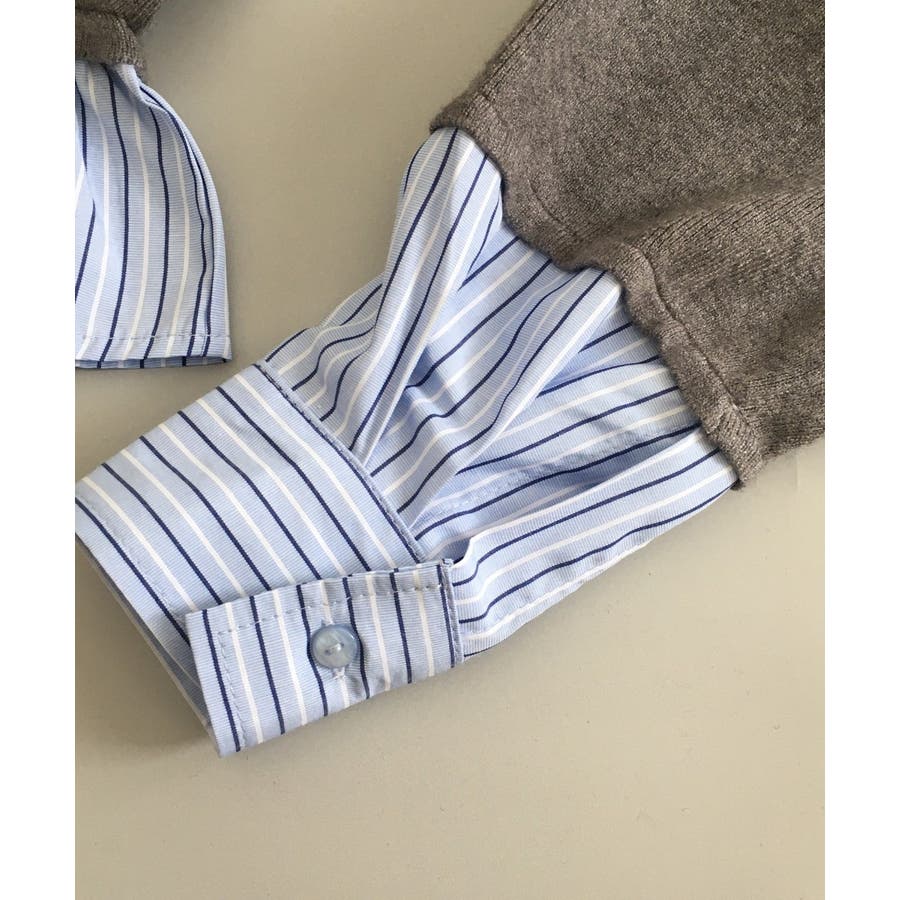 ニットとストライプシャツを重ねたように見えるレイヤード風デザインが、1枚でこなれ感をつくるトップス。