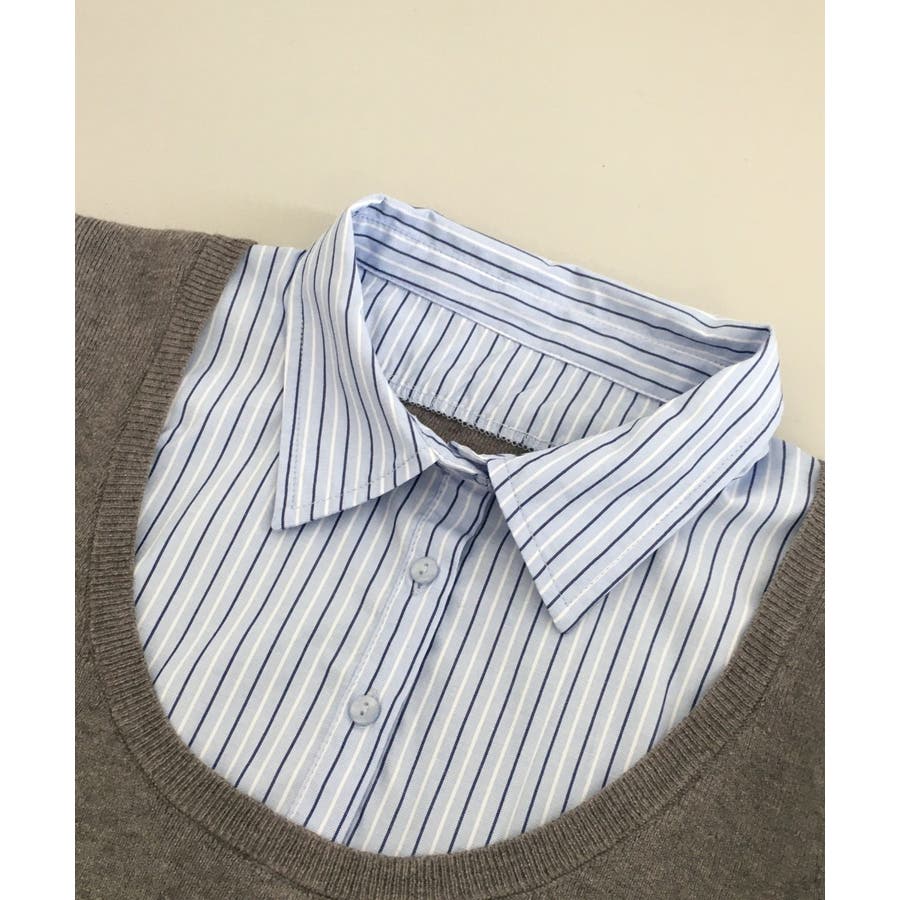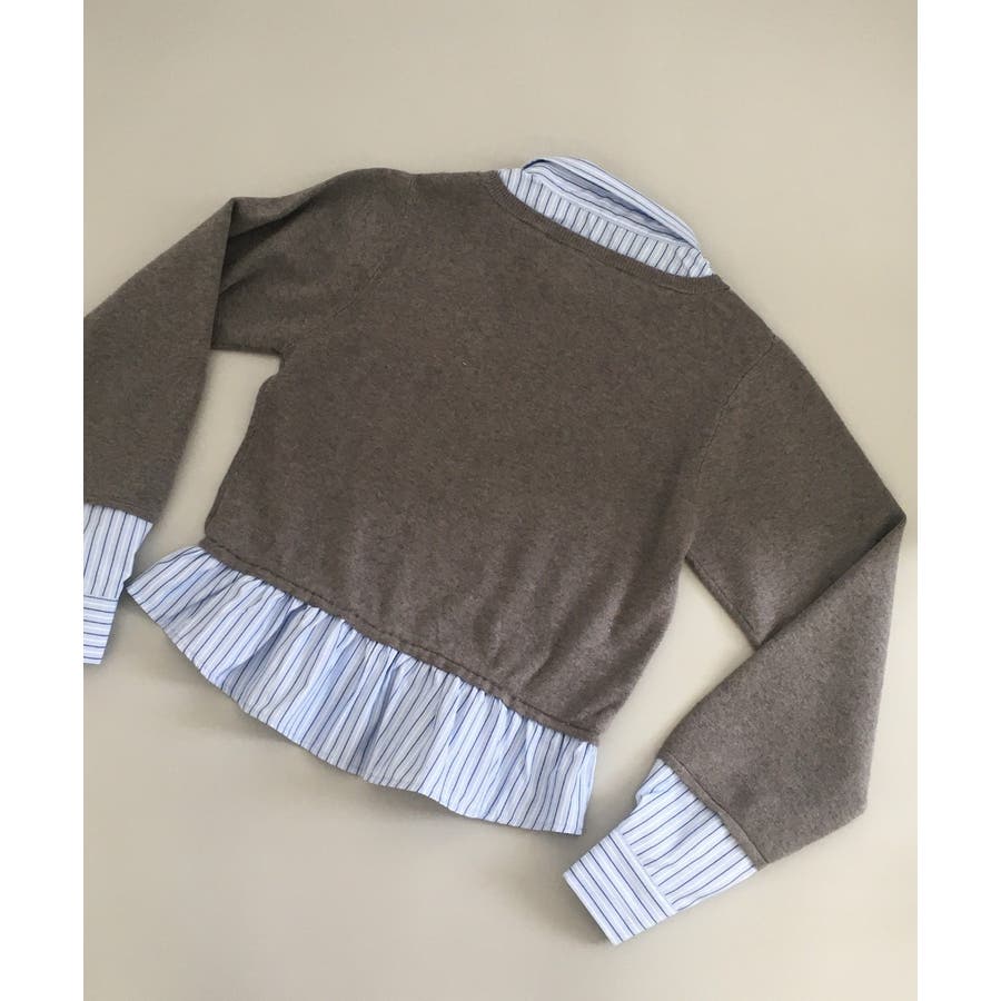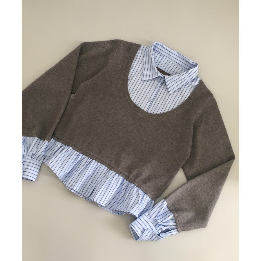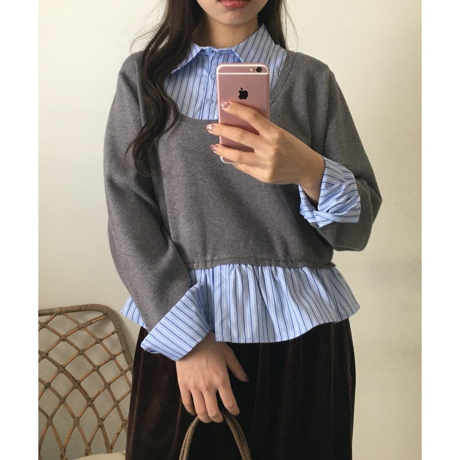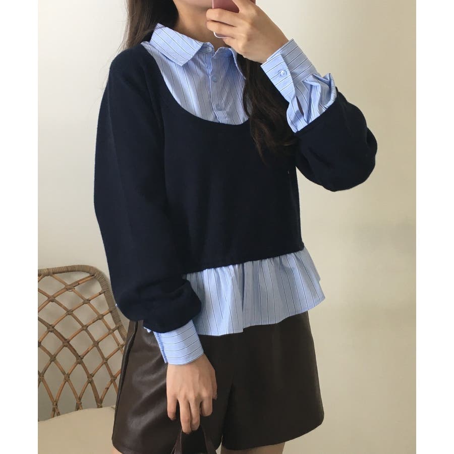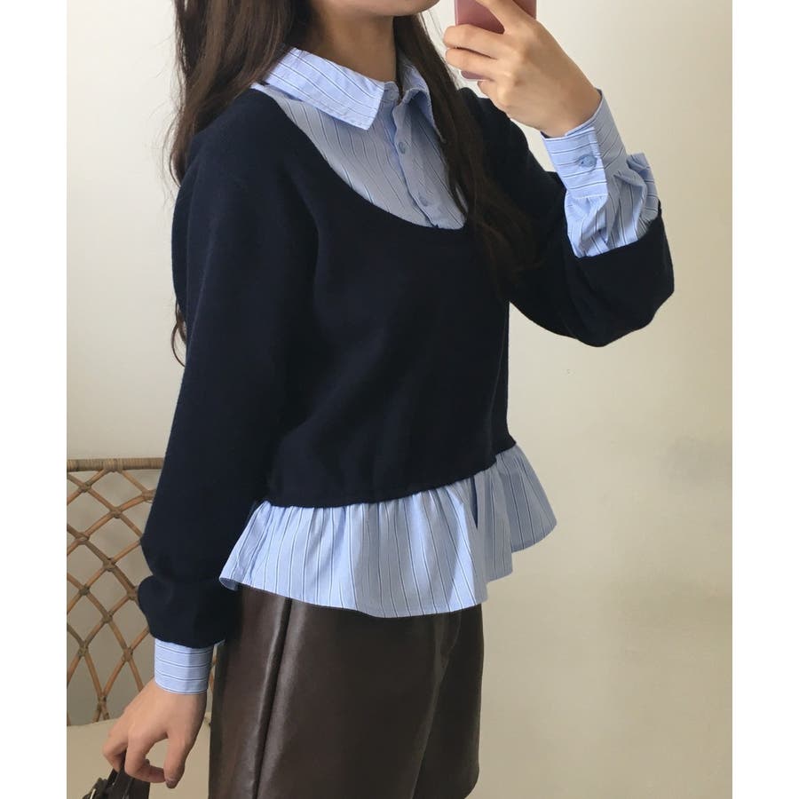 ニットとストライプシャツを重ねたように見えるレイヤード風デザインが、1枚でこなれ感をつくるトップス。