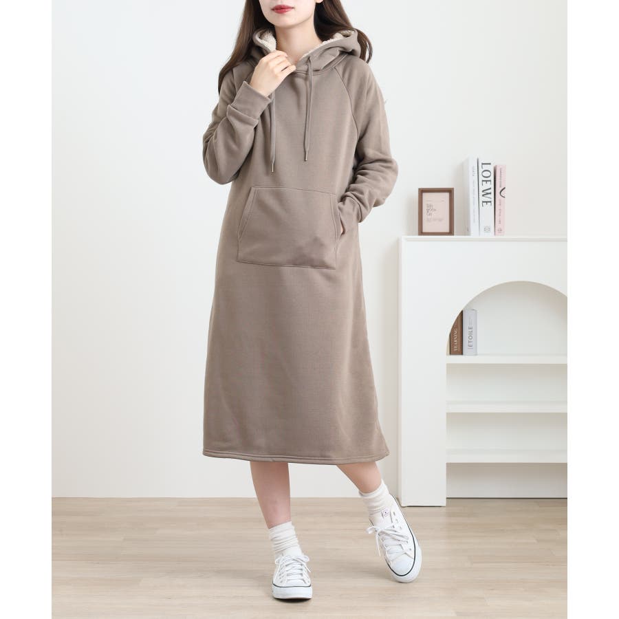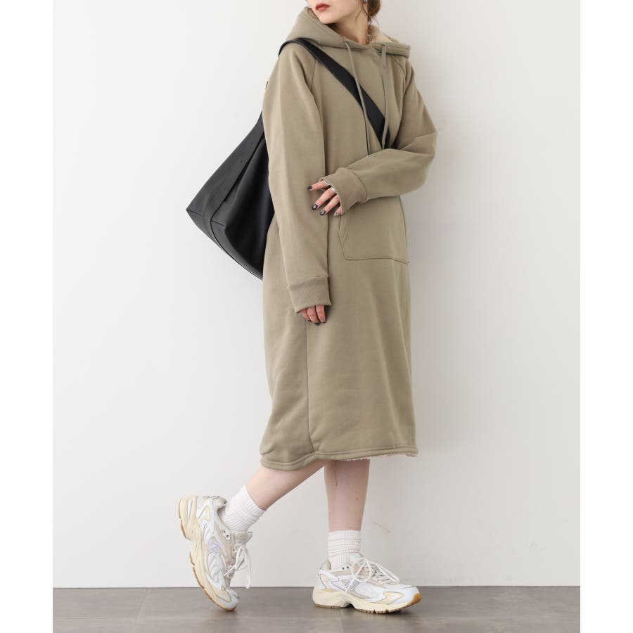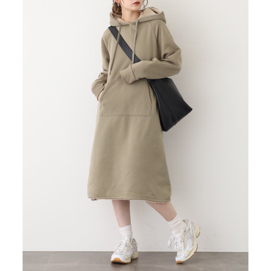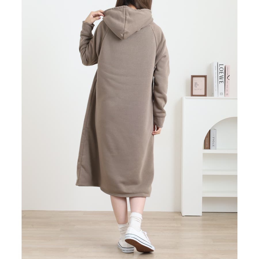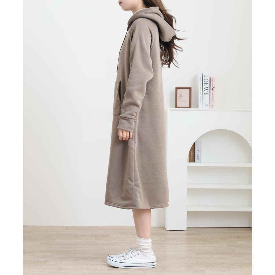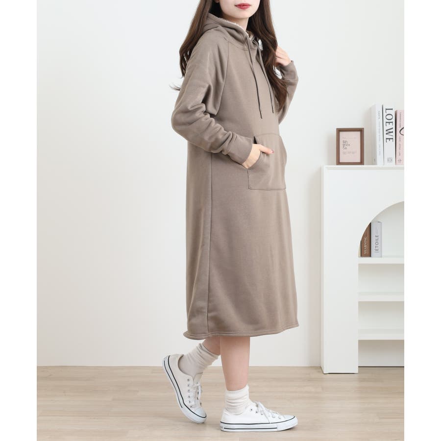 袖は裏起毛で着ぶくれしにくく、冬の一枚着としても重宝するパーカーワンピースです。