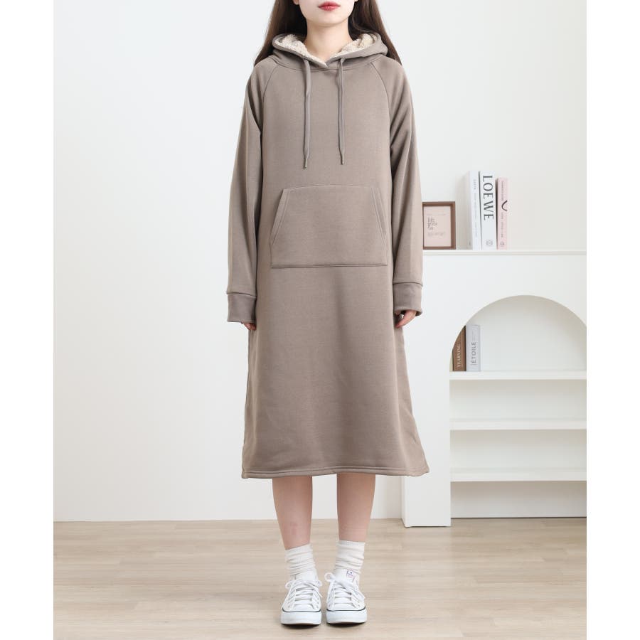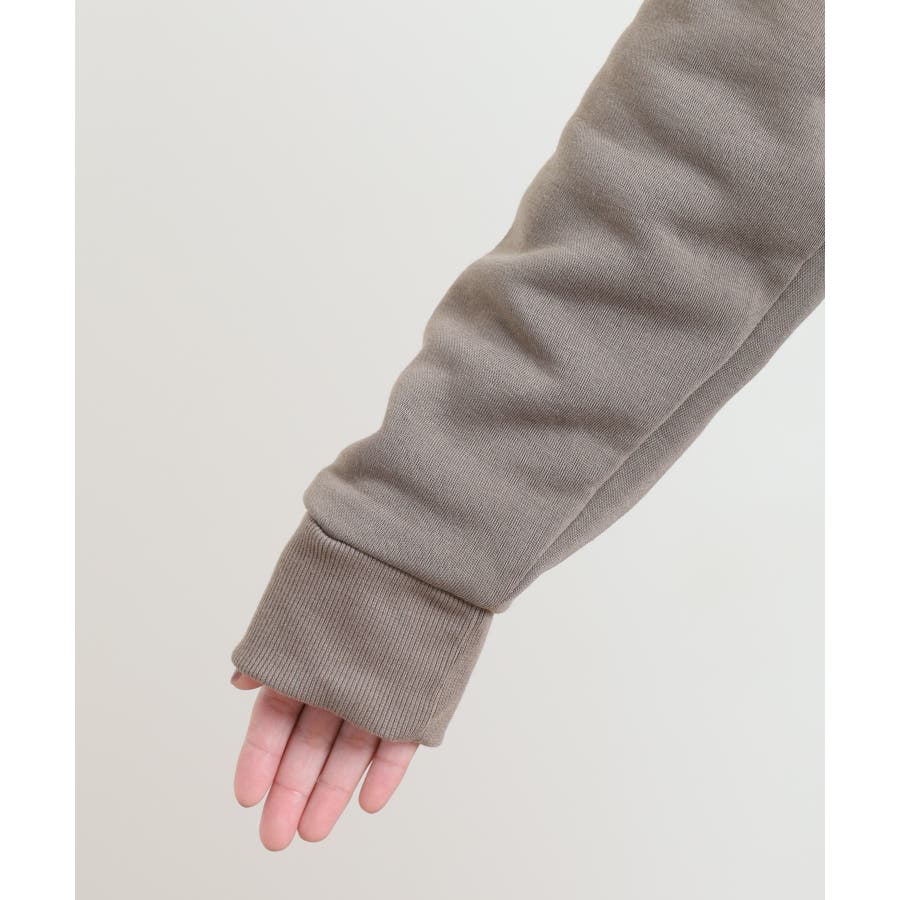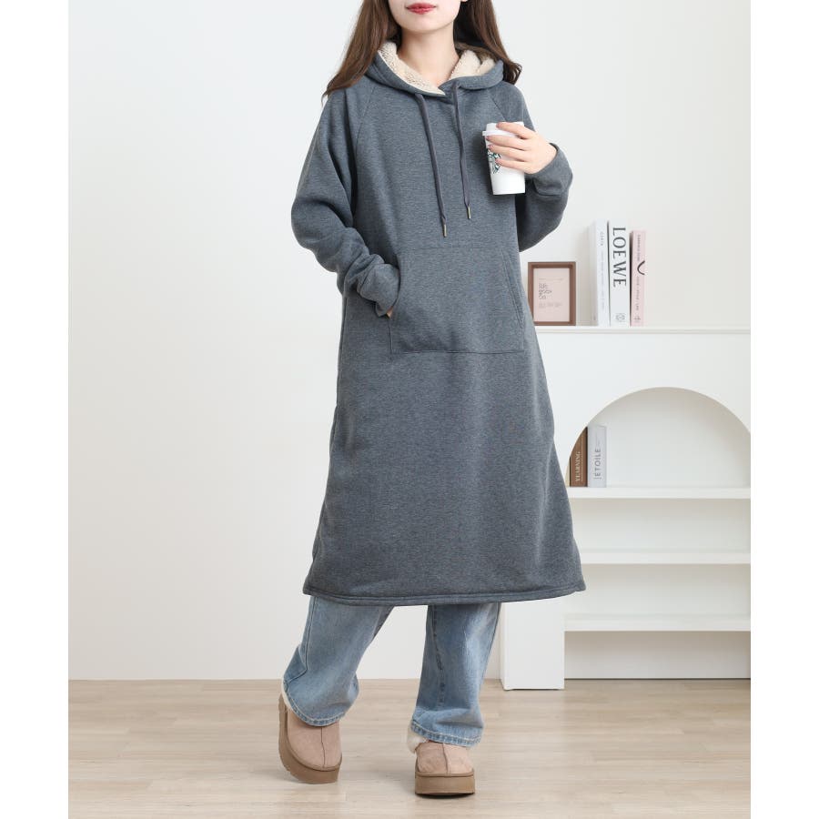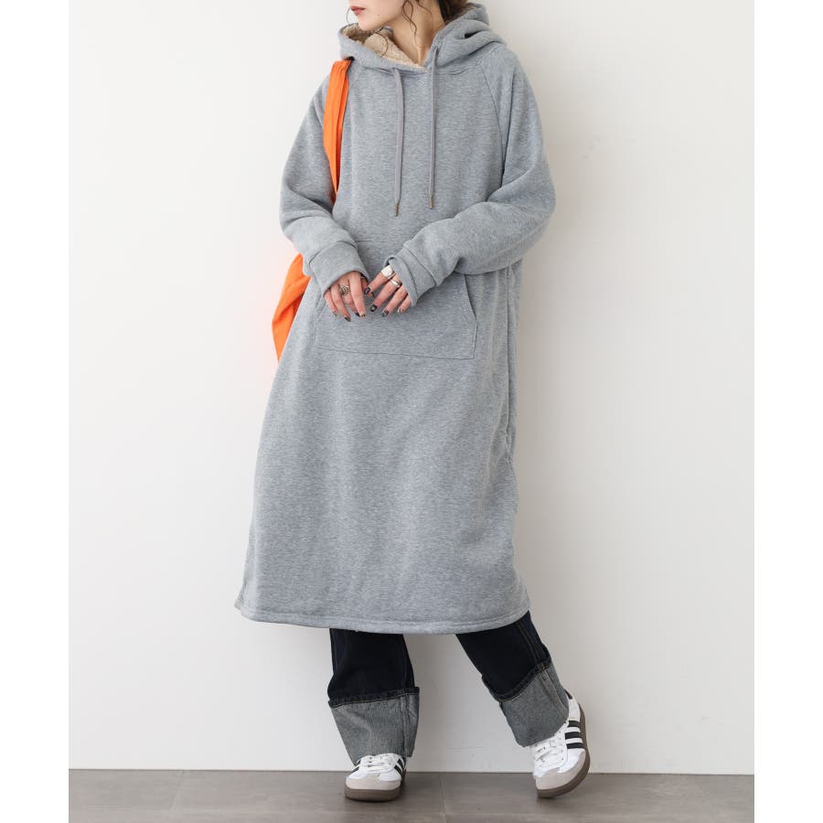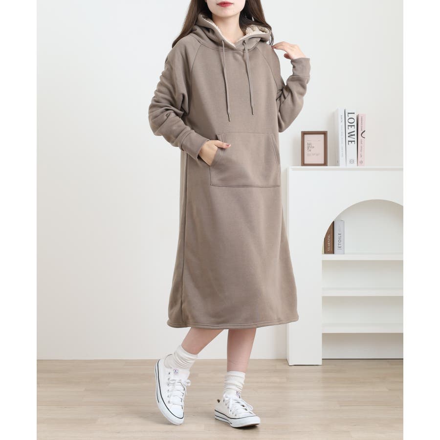 袖は裏起毛で着ぶくれしにくく、冬の一枚着としても重宝するパーカーワンピースです。