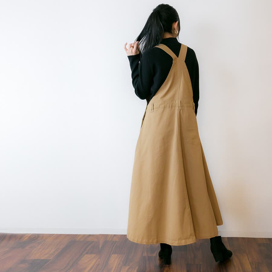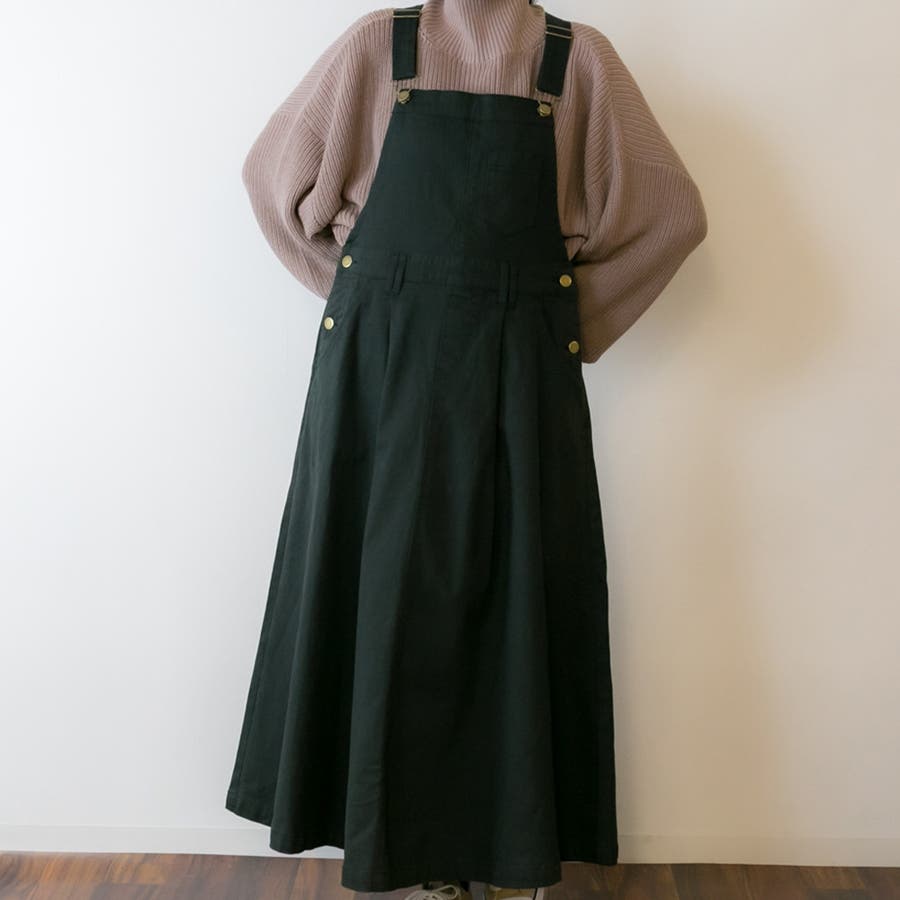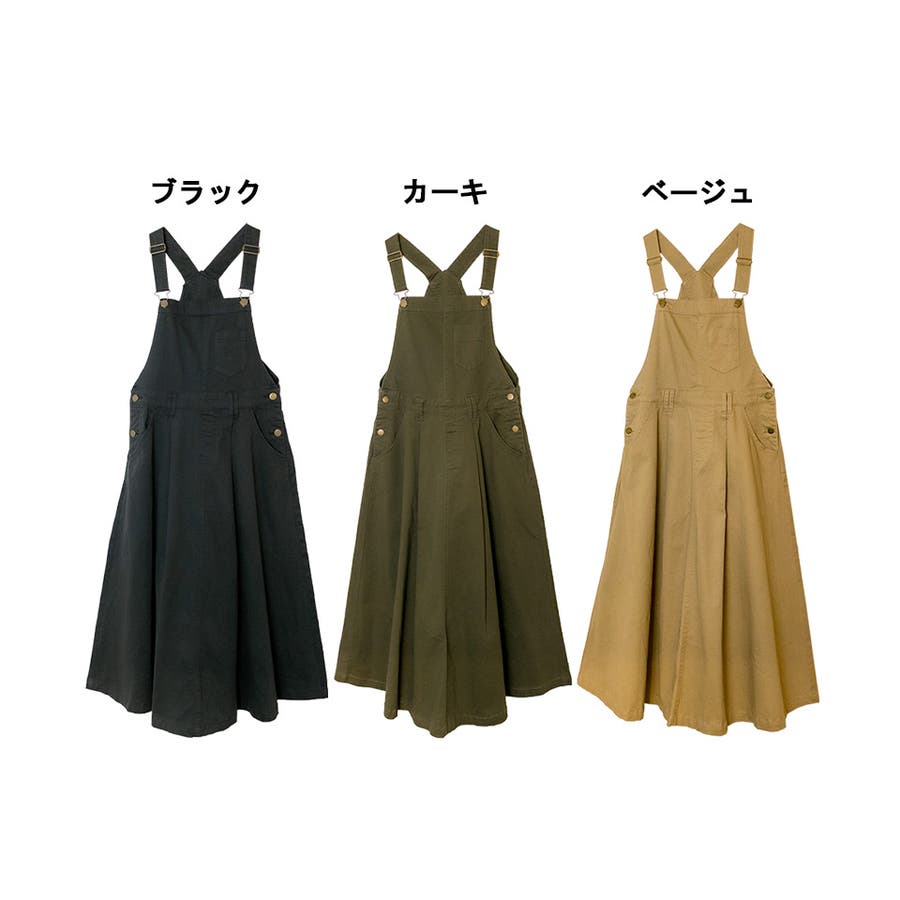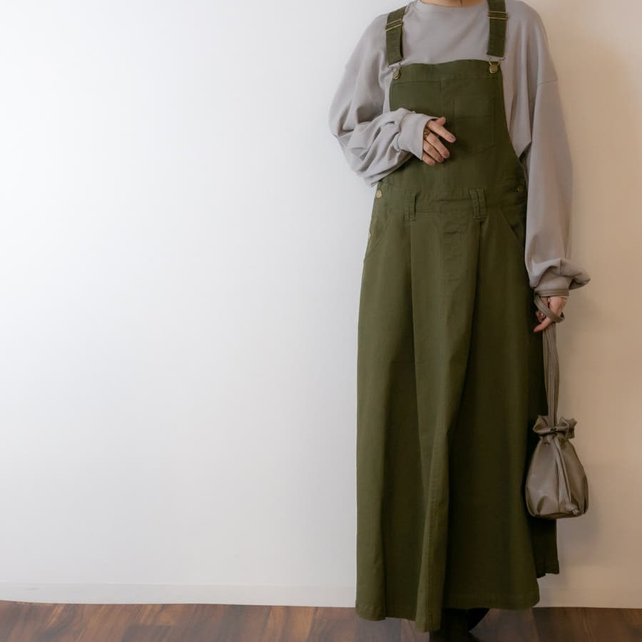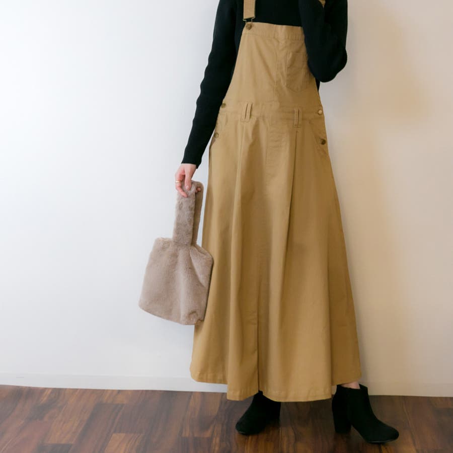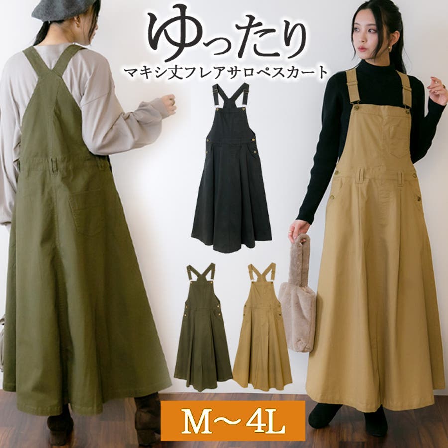 ウエスト周りがカバーできる、ゆったりサイズのサロペットスカート。