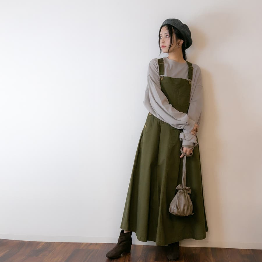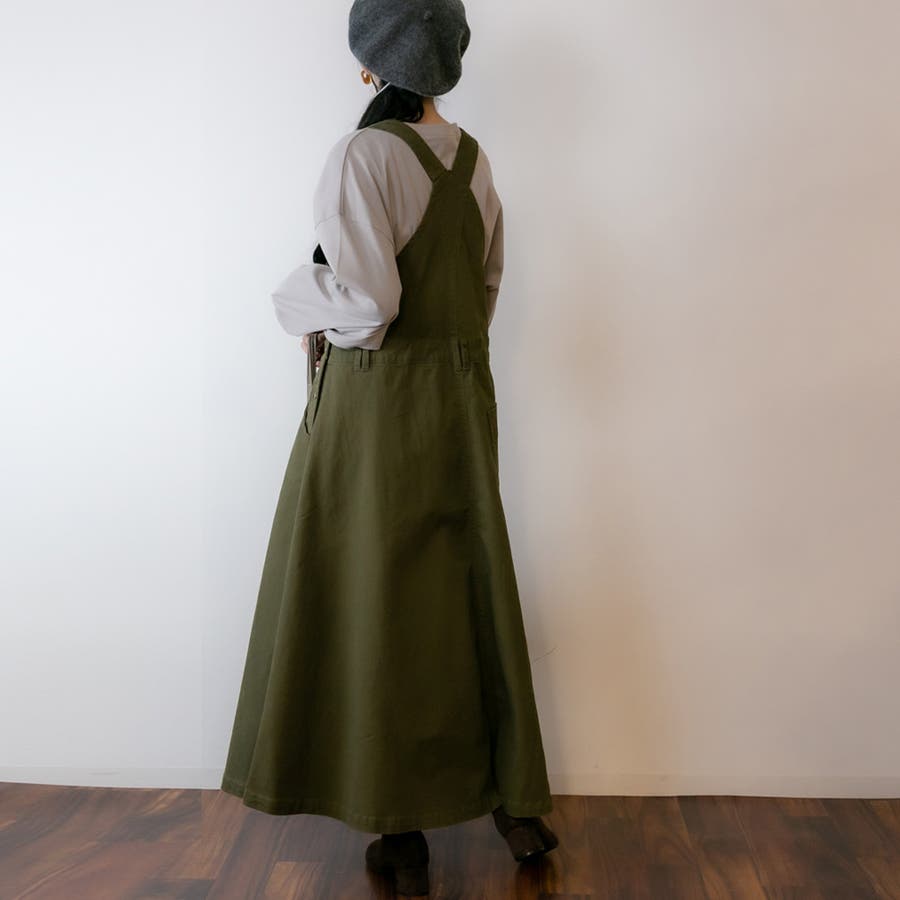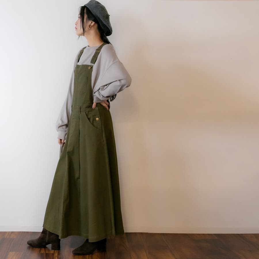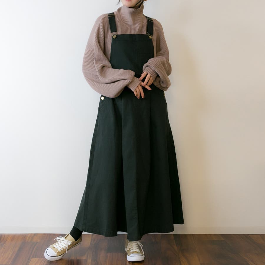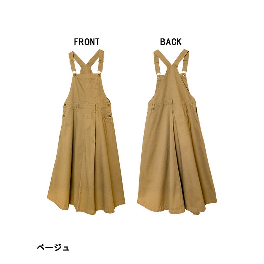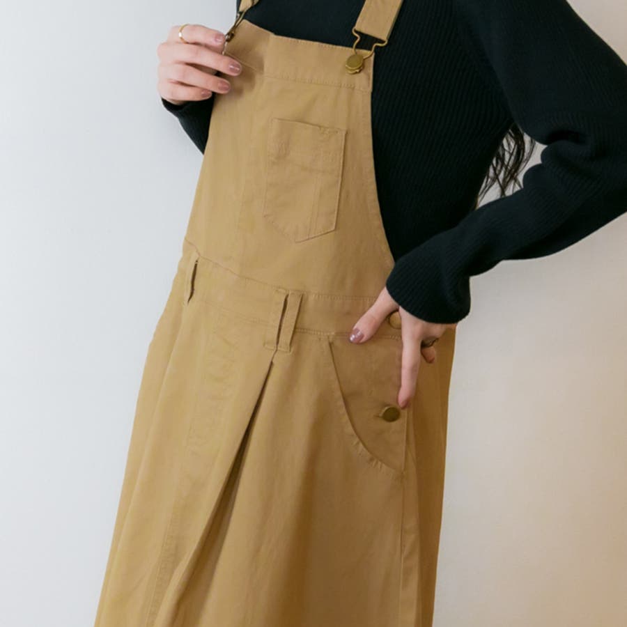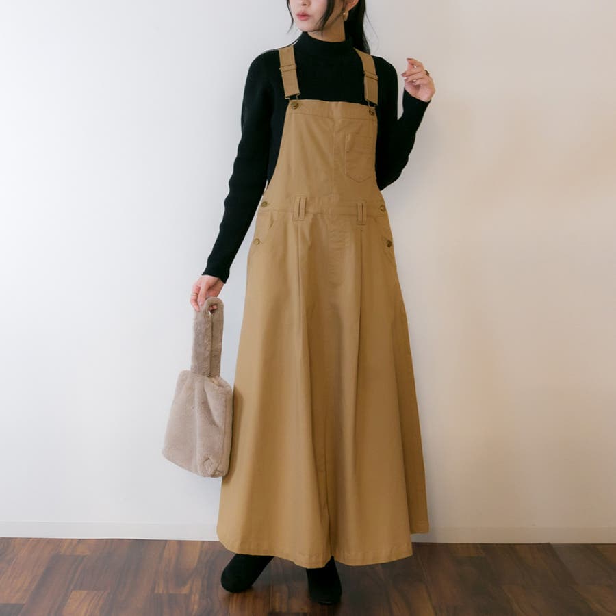 ウエスト周りがカバーできる、ゆったりサイズのサロペットスカート。