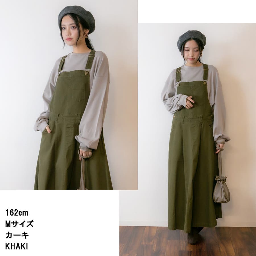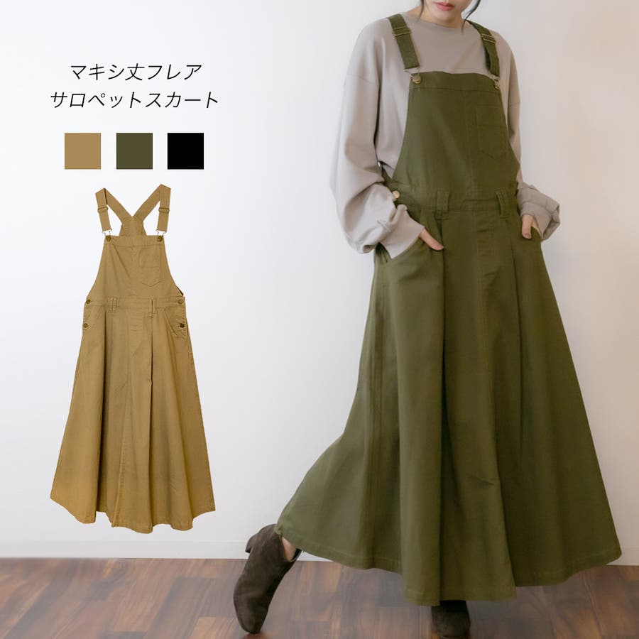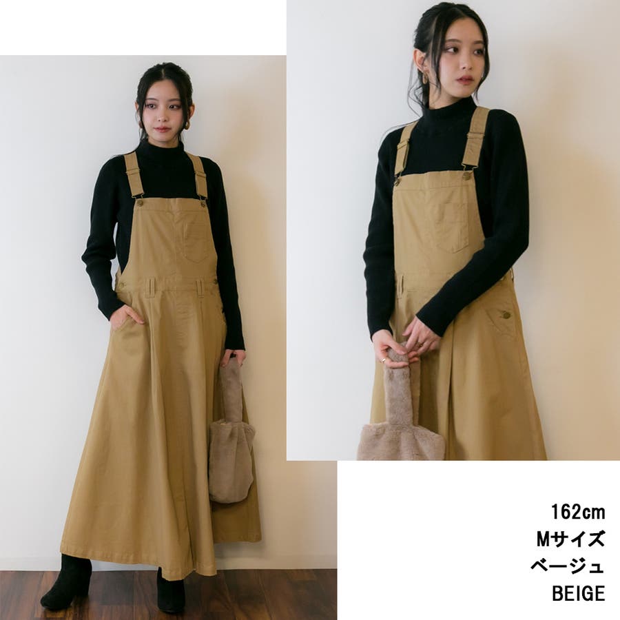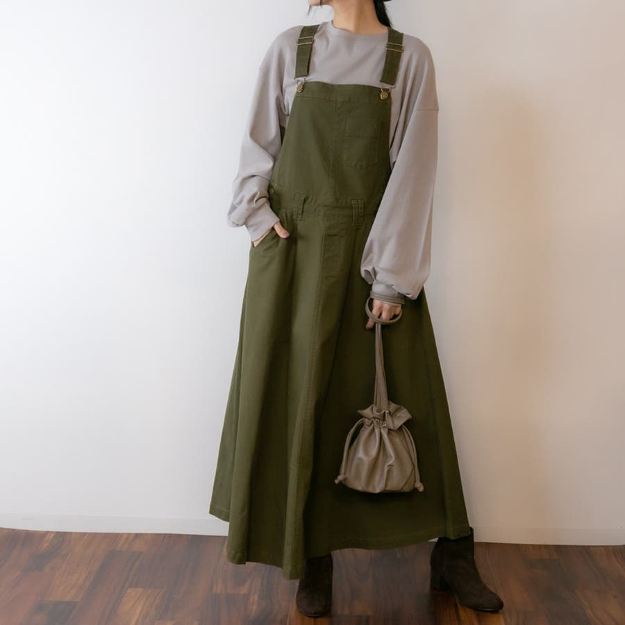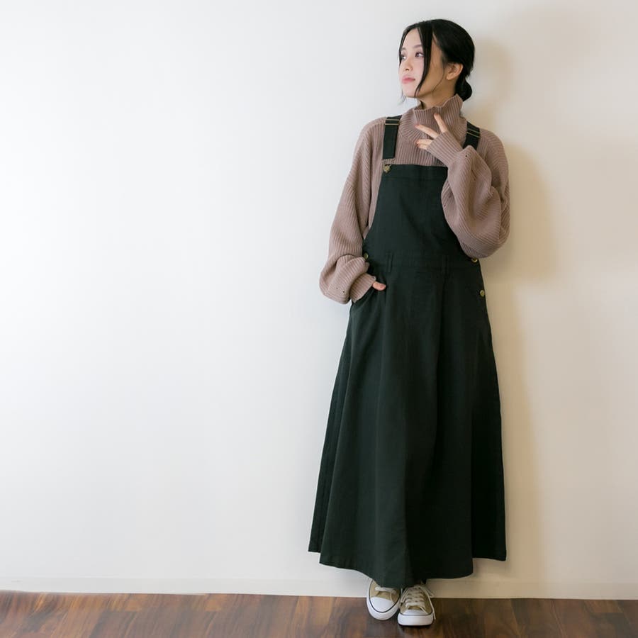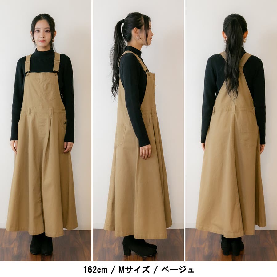 ウエスト周りがカバーできる、ゆったりサイズのサロペットスカート。
