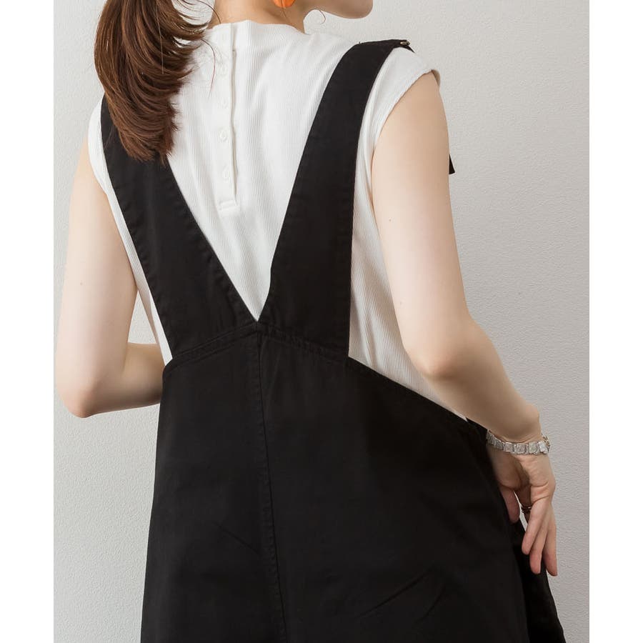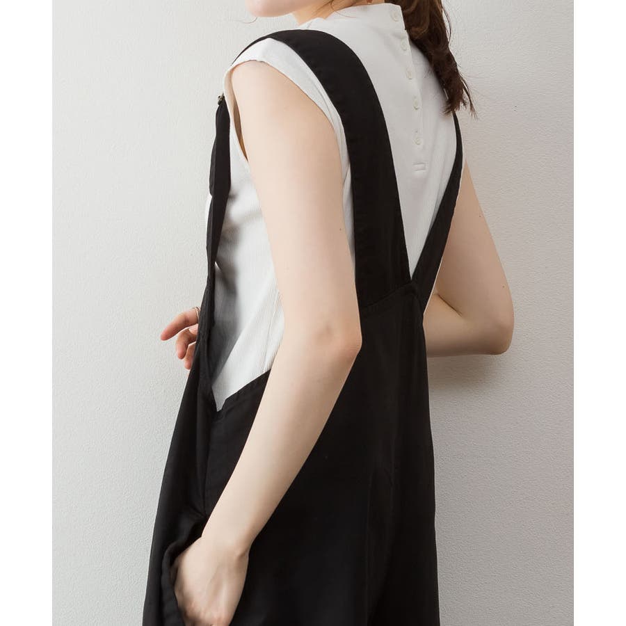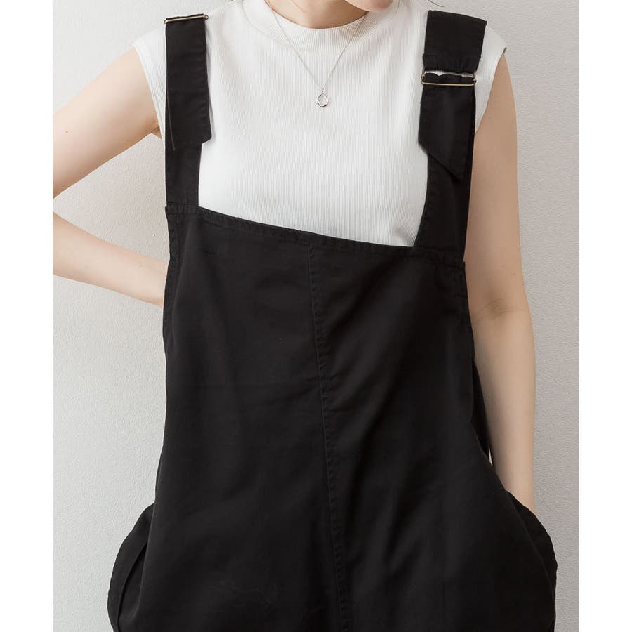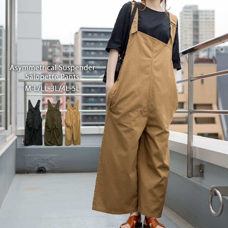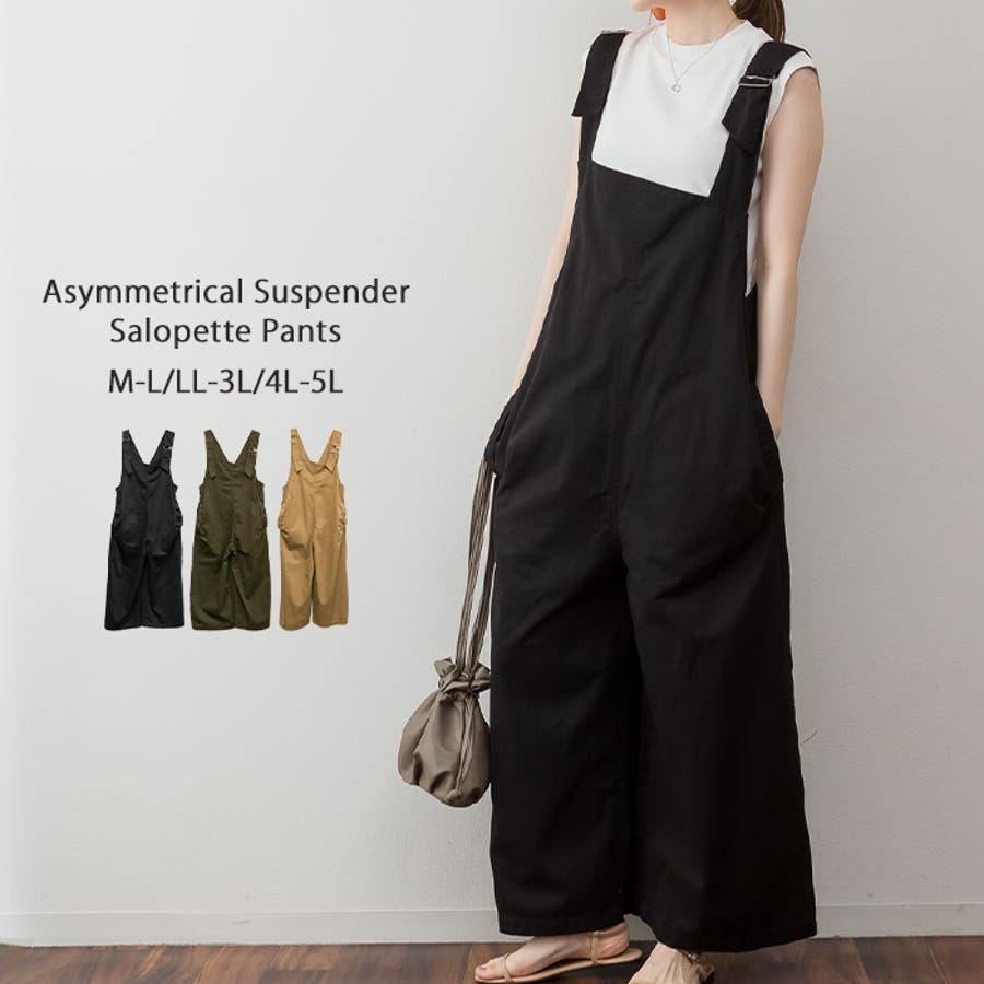 アシメデザインの胸当てと肩紐がアクセントのサロペットパンツ。