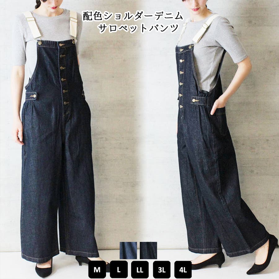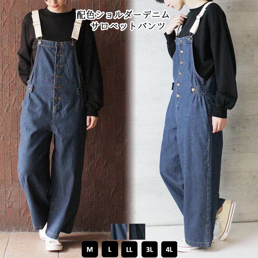配色ショルダーデニムサロペットパンツ