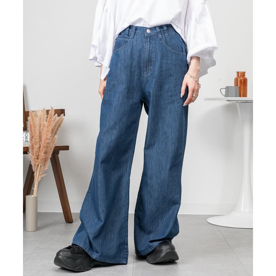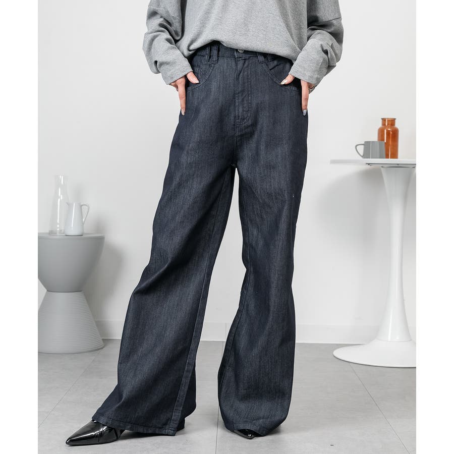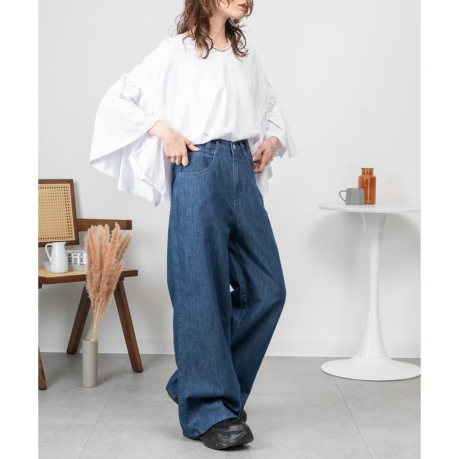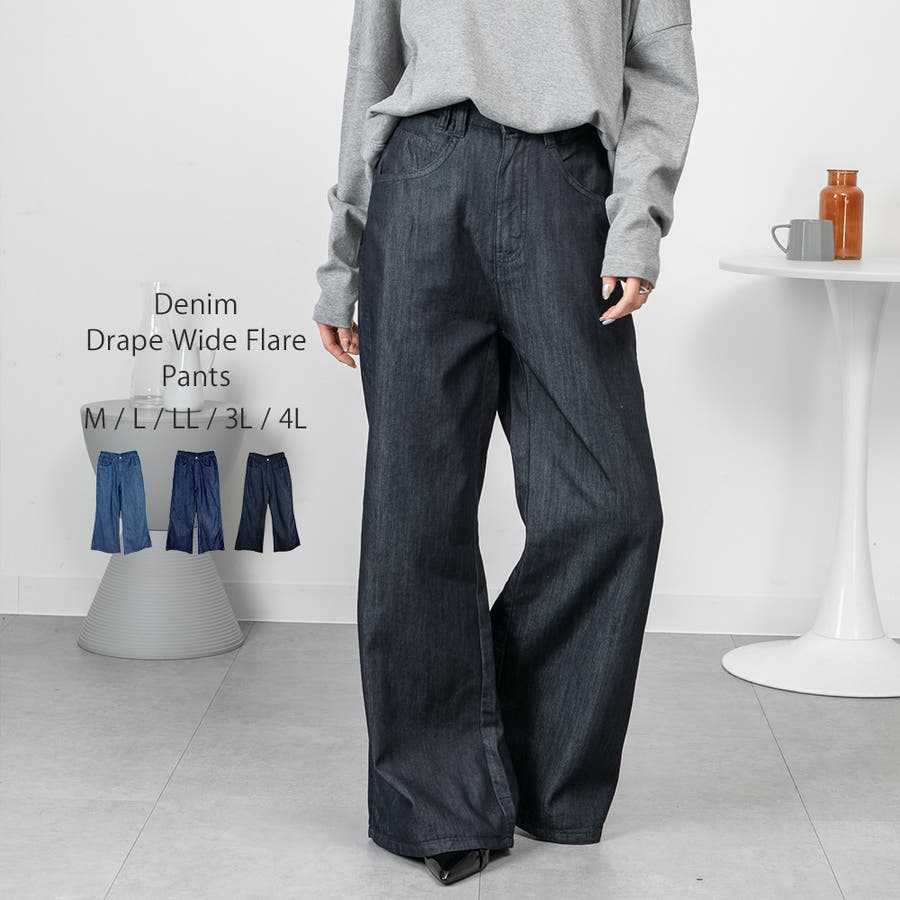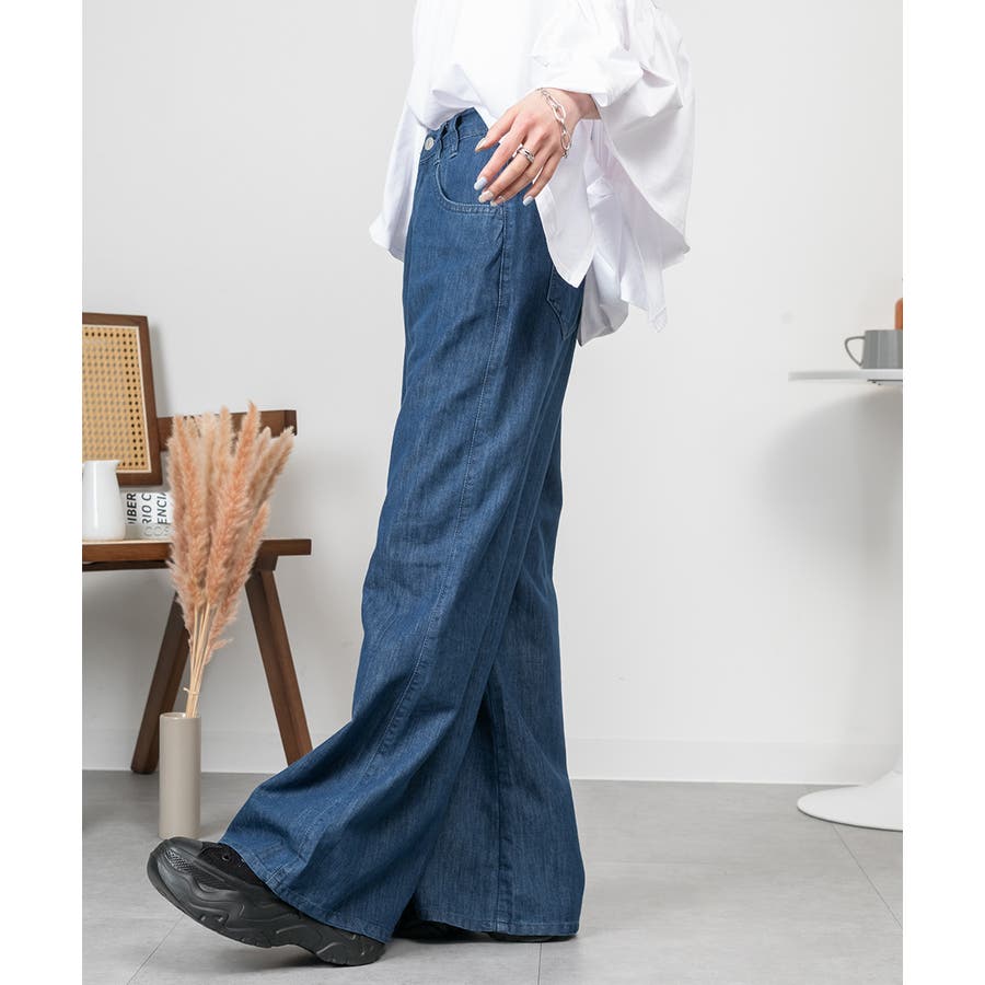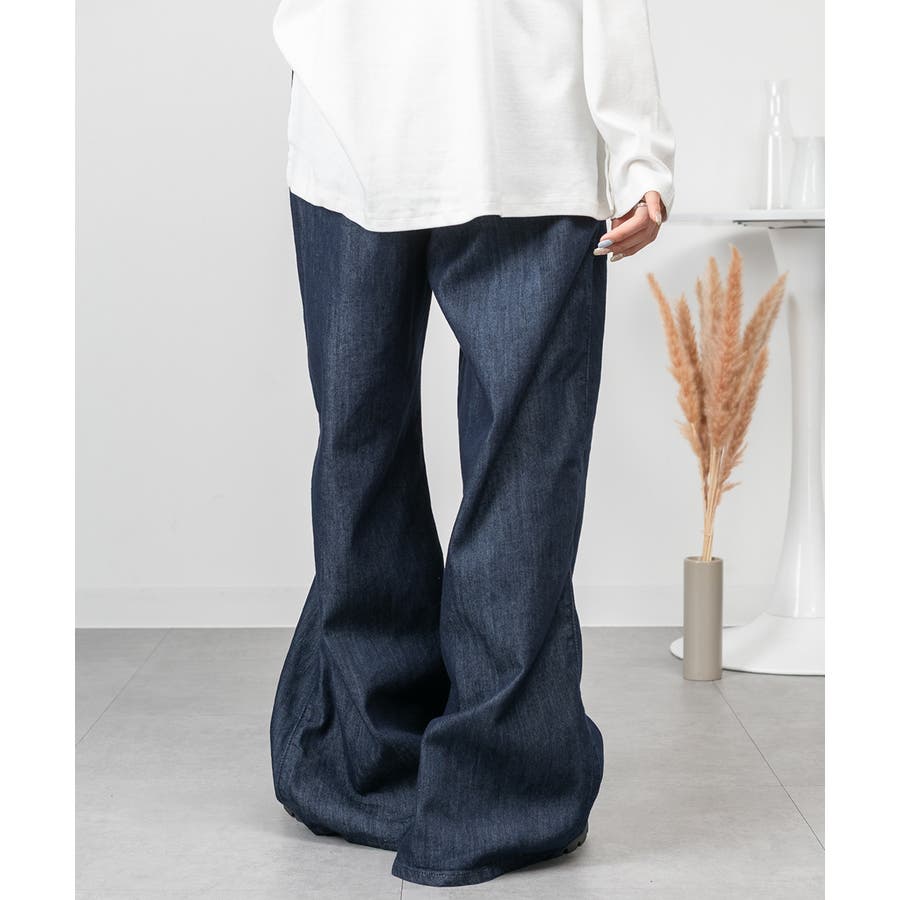 軽やかな薄手デニムが生む美しいドレープと、ワイドフレアの動きが女性らしさを引き立てる一本。
