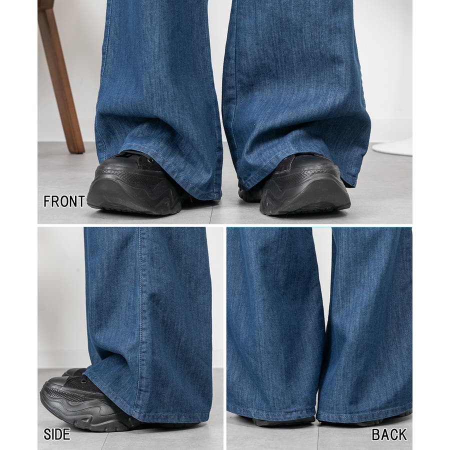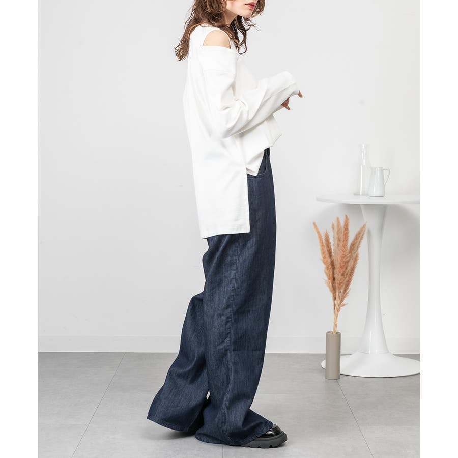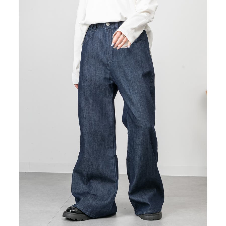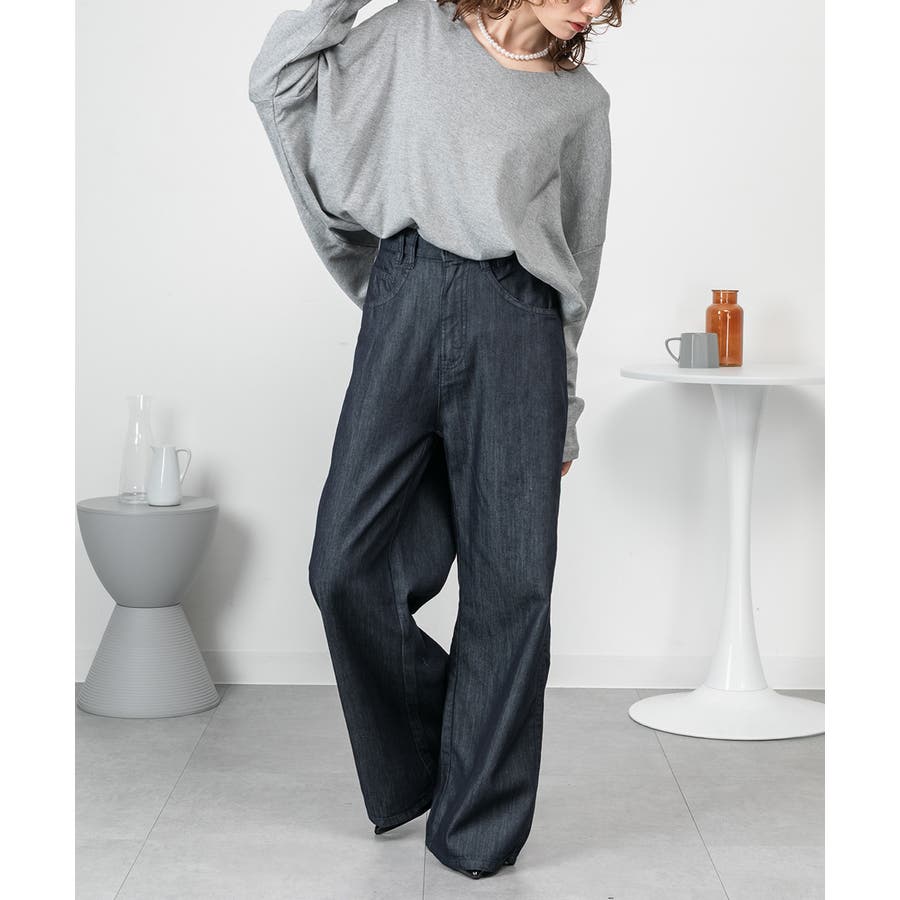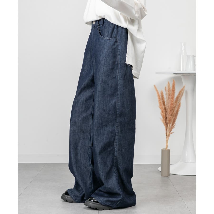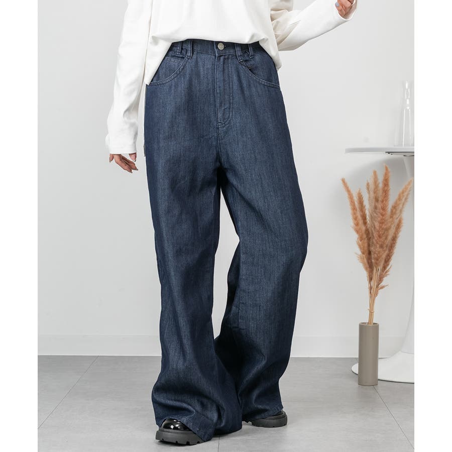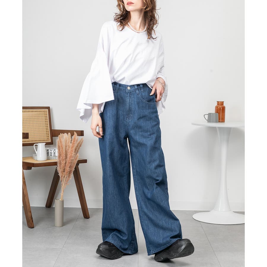 軽やかな薄手デニムが生む美しいドレープと、ワイドフレアの動きが女性らしさを引き立てる一本。
