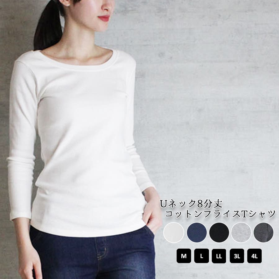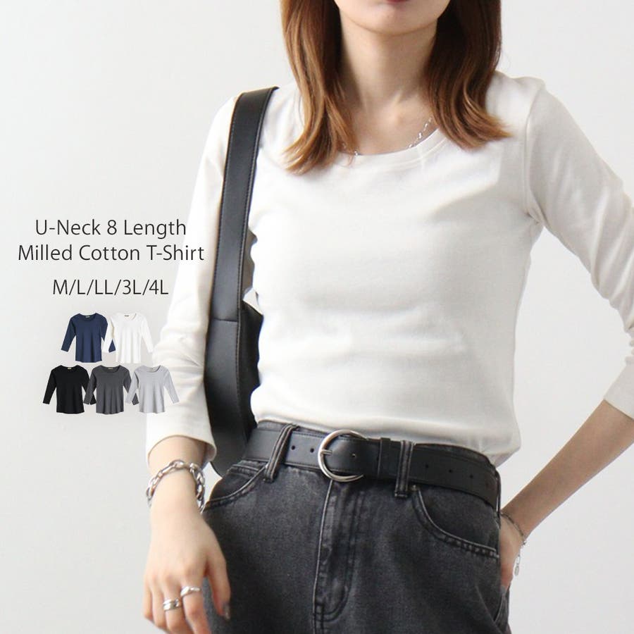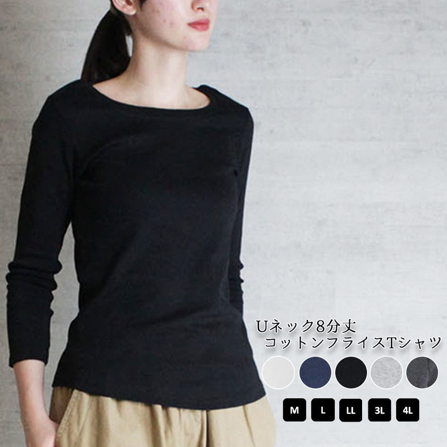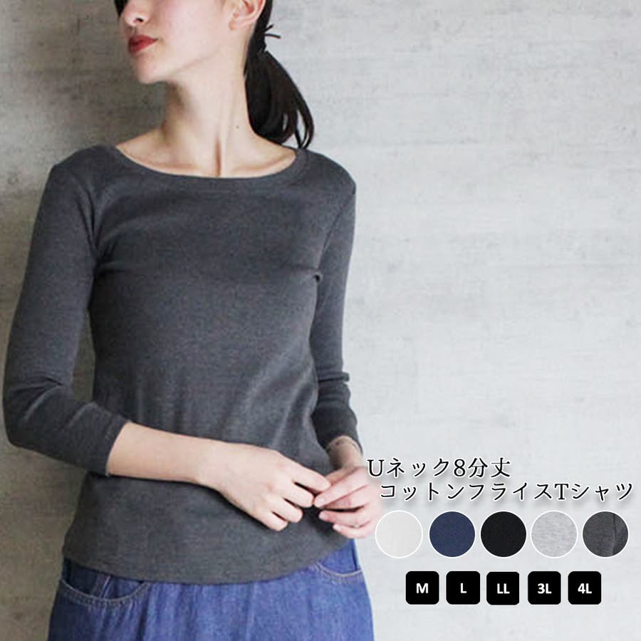 Uネック8分袖コットンフライスTシャツ 半端袖 カットソー