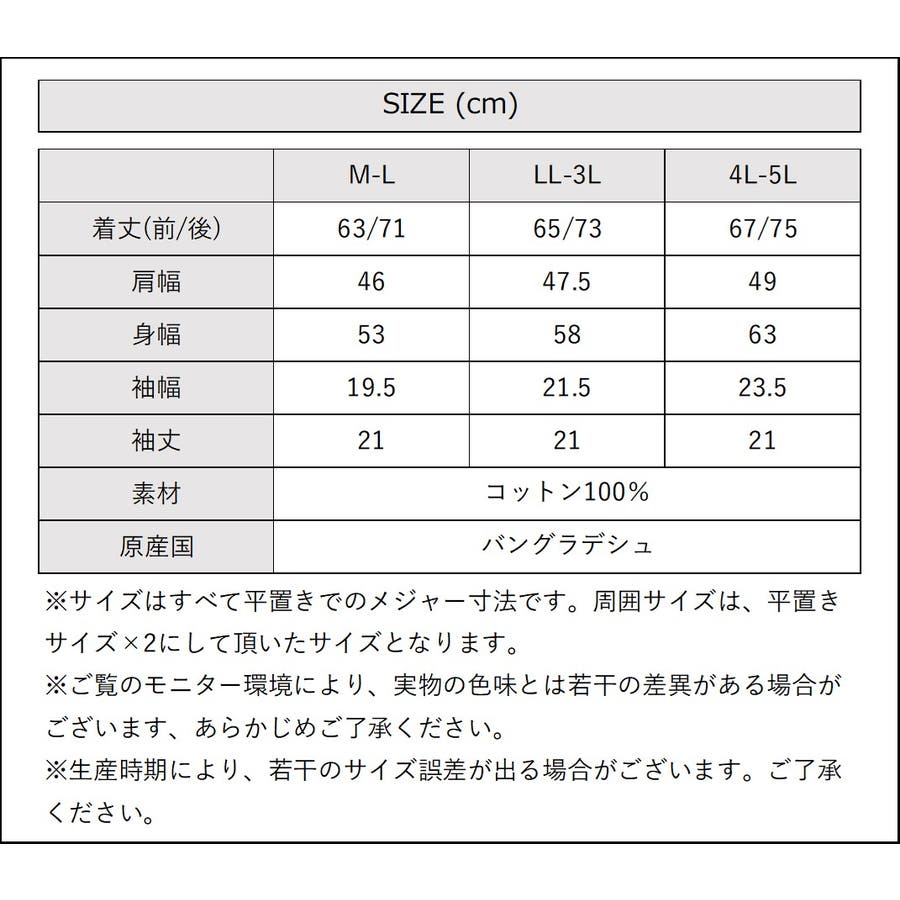 [LL-3Lサイズ]着丈:65/73cm、肩幅:47.5cm、身幅:58cm、裾幅:58cm、袖丈:21cm