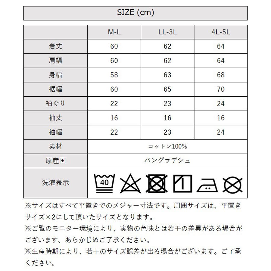 [LL-3Lサイズ]着丈:62cm、肩幅:62cm、身幅:63cm、裾幅:65cm、袖丈:16/10cm
