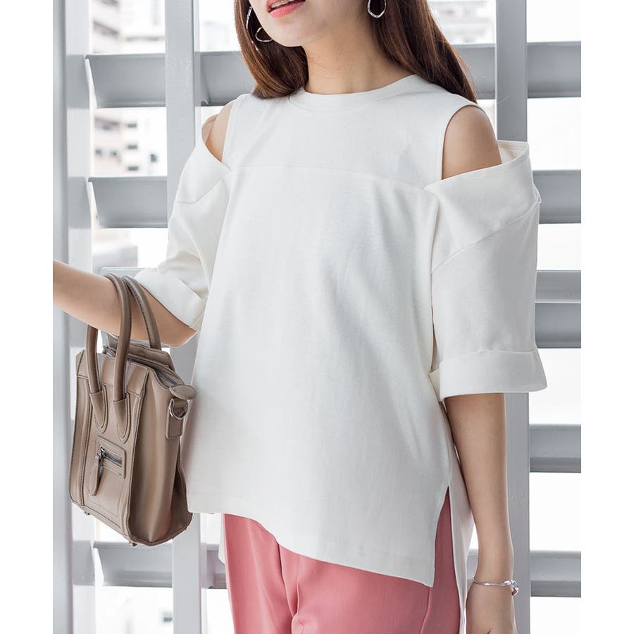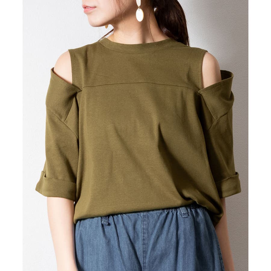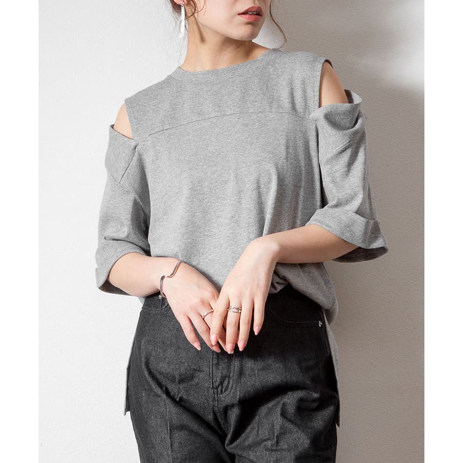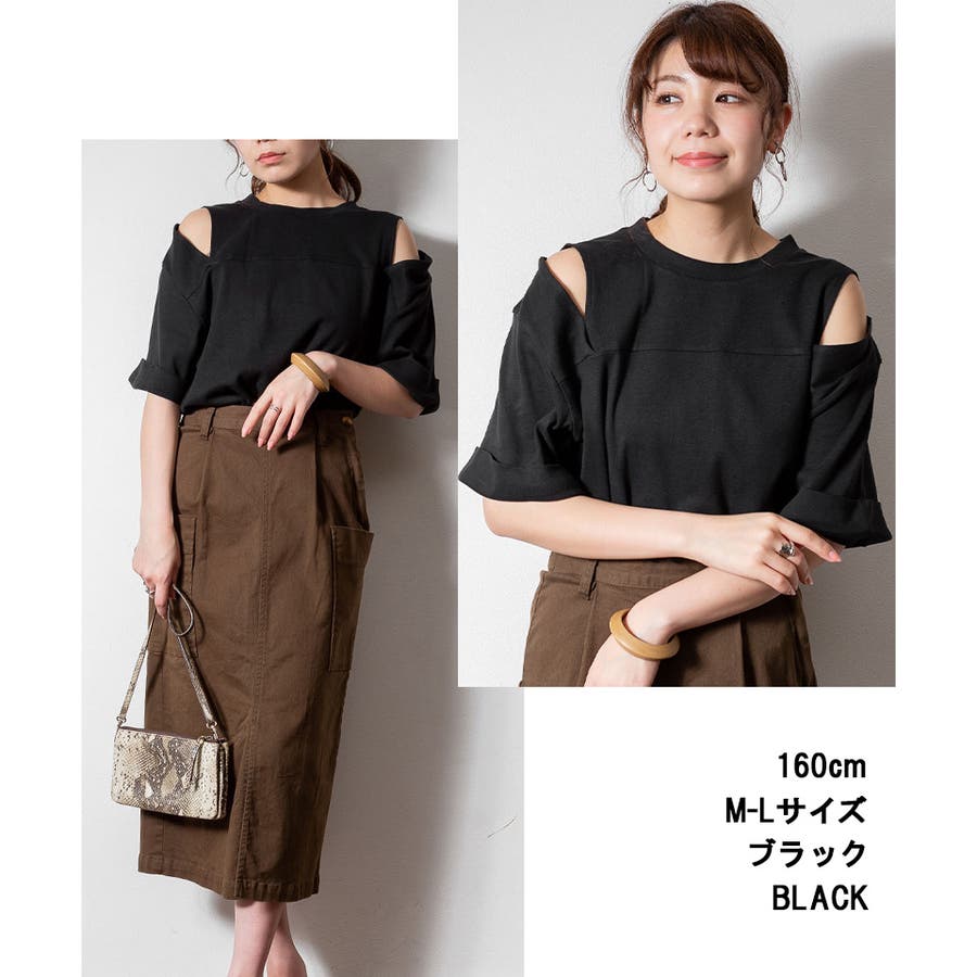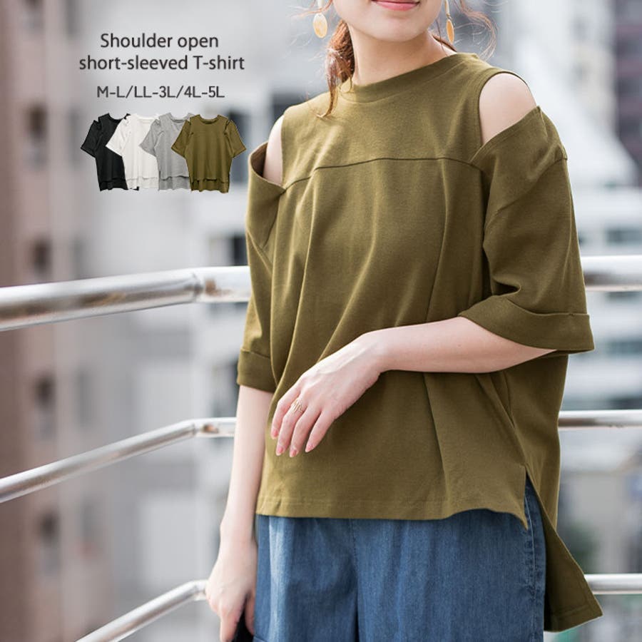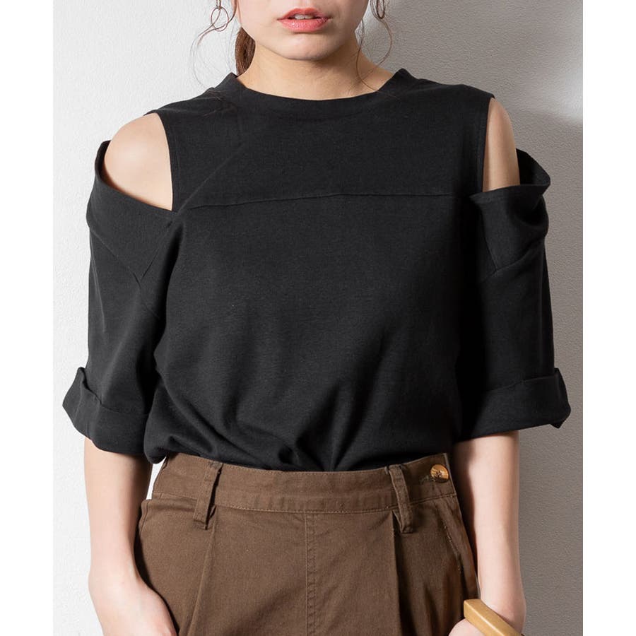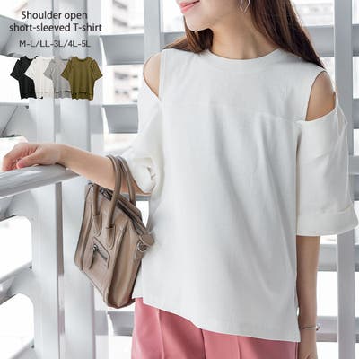肩の部分が開いており、オシャレで大人っぽい印象を与えます。半袖なので、春から夏にかけて活躍するアイテムです。