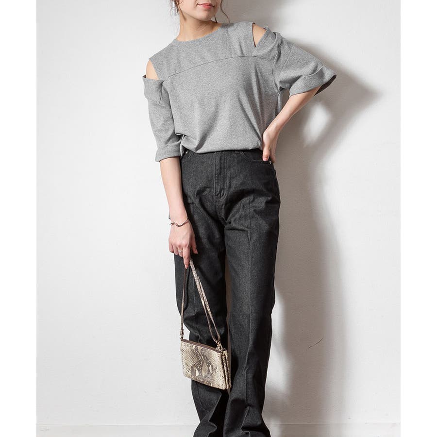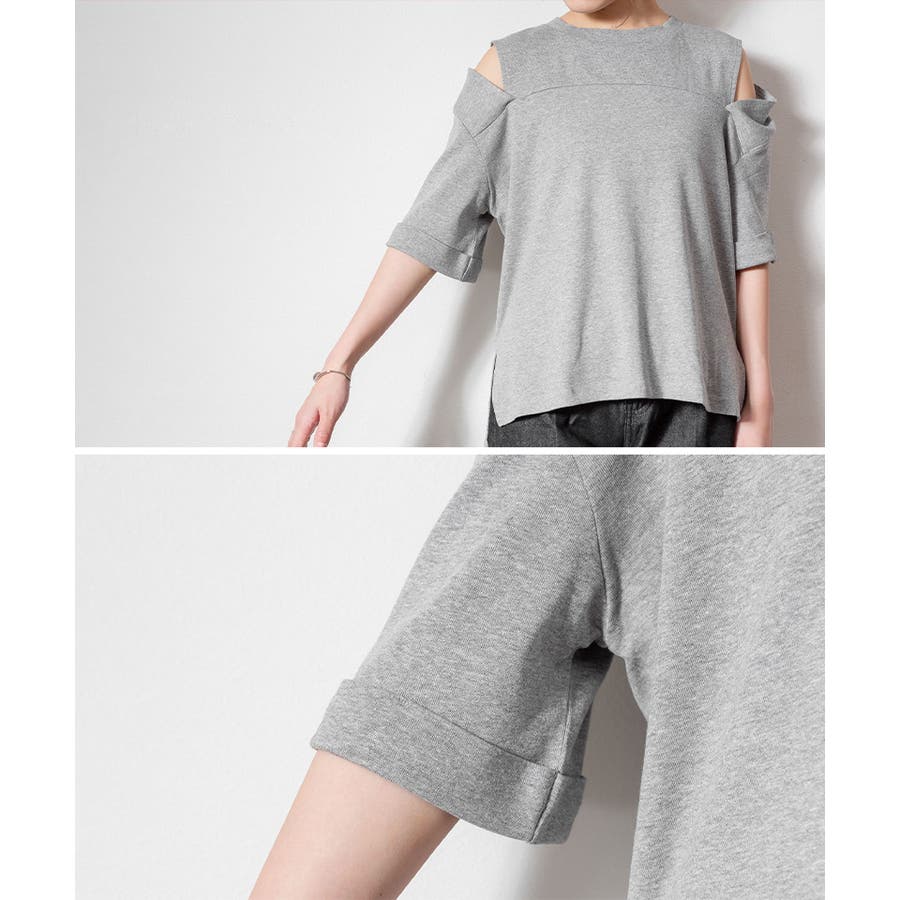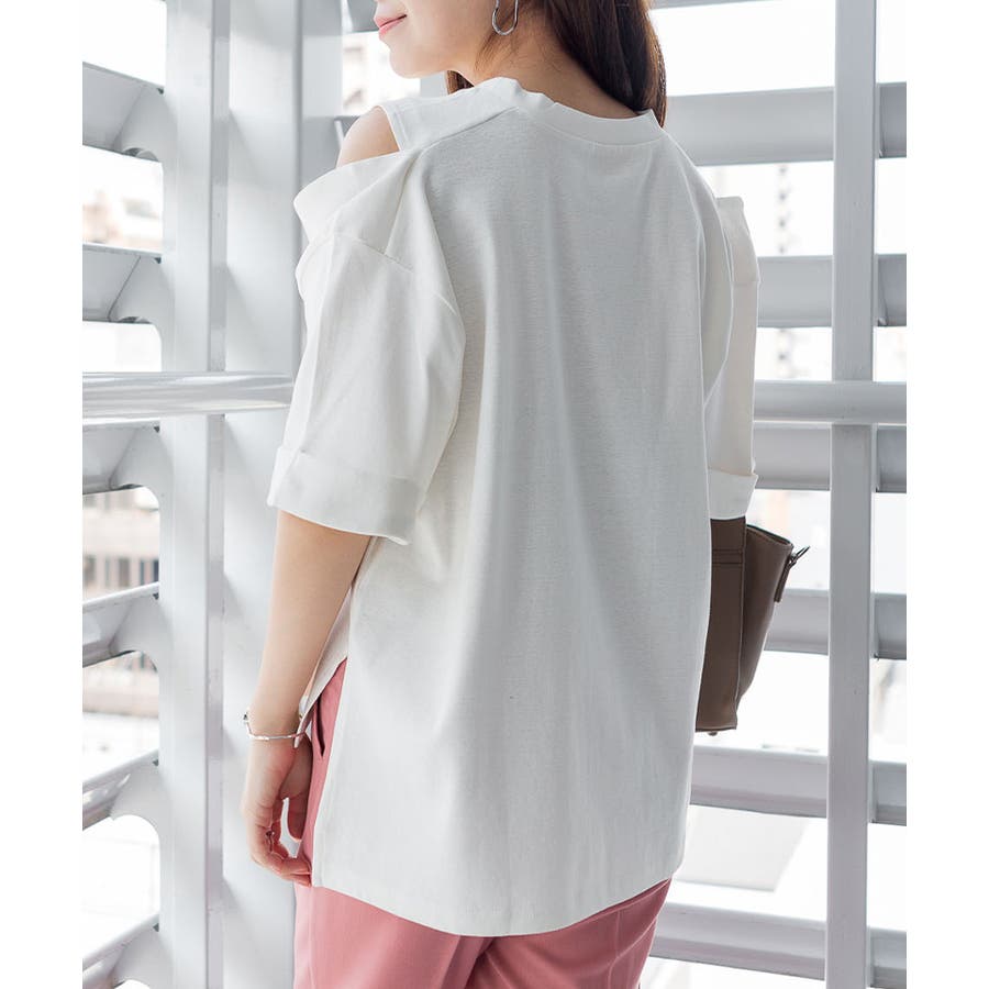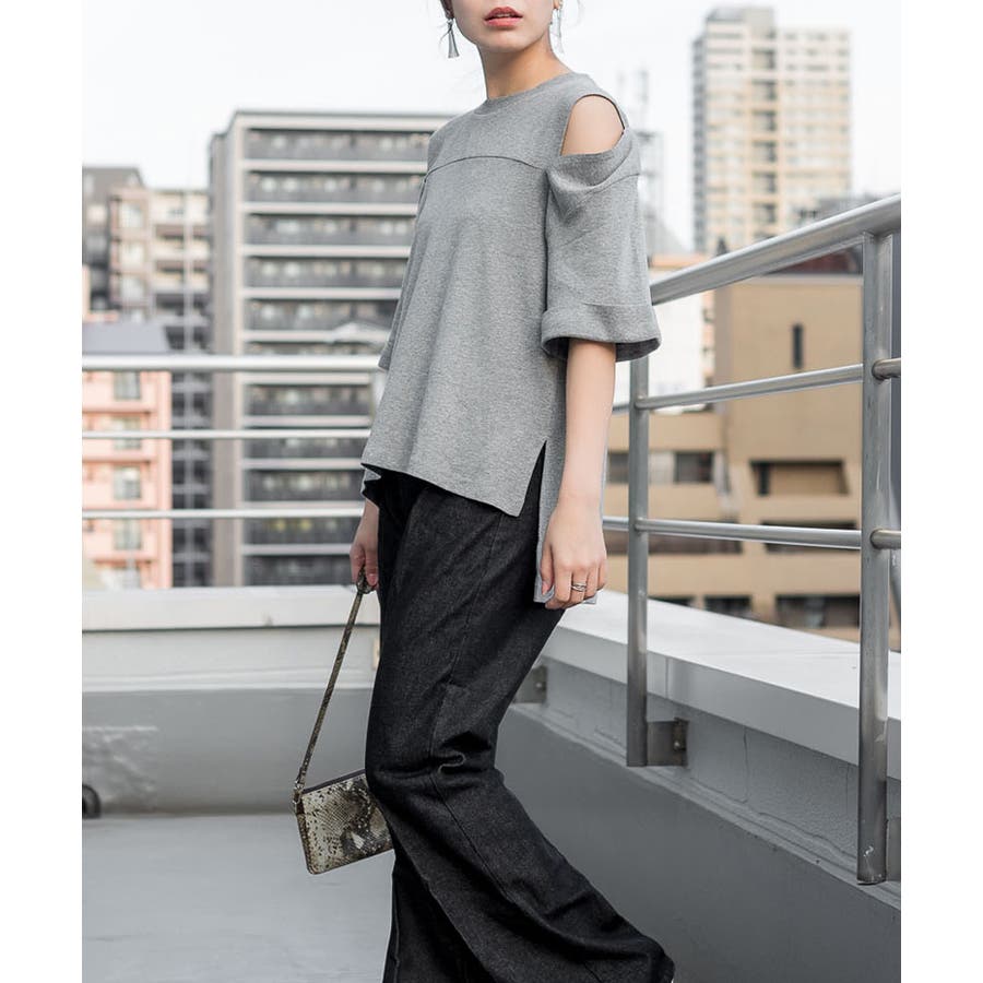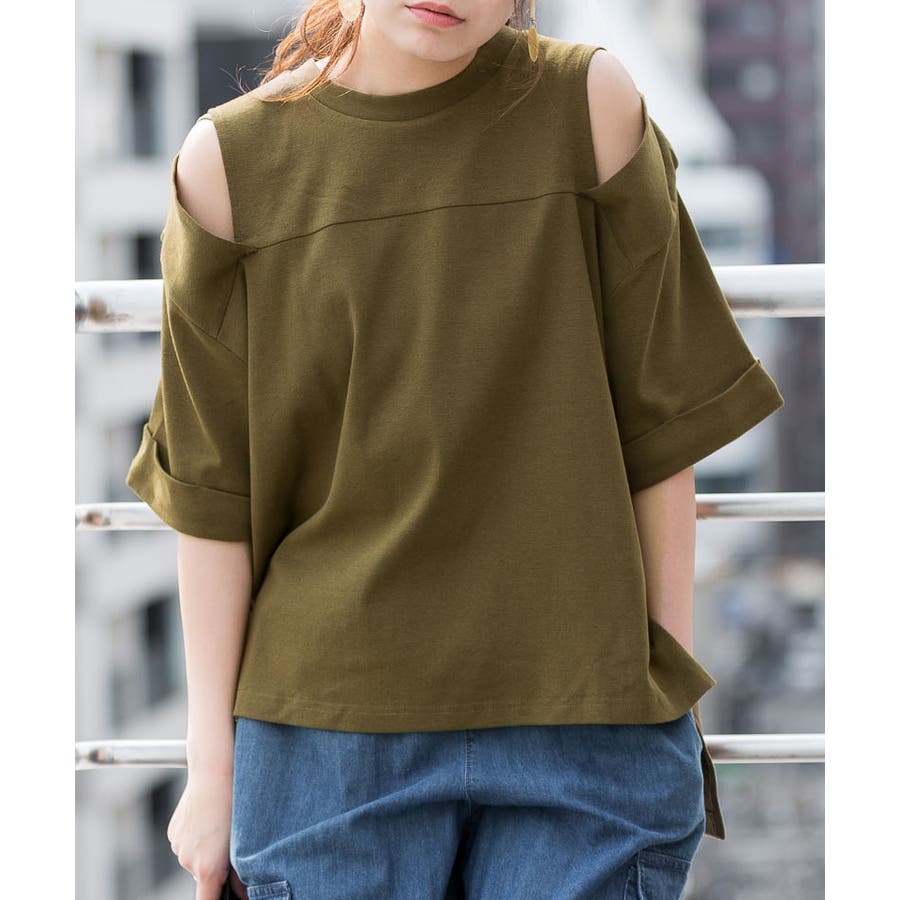 肩の部分が開いており、オシャレで大人っぽい印象を与えます。半袖なので、春から夏にかけて活躍するアイテムです。
