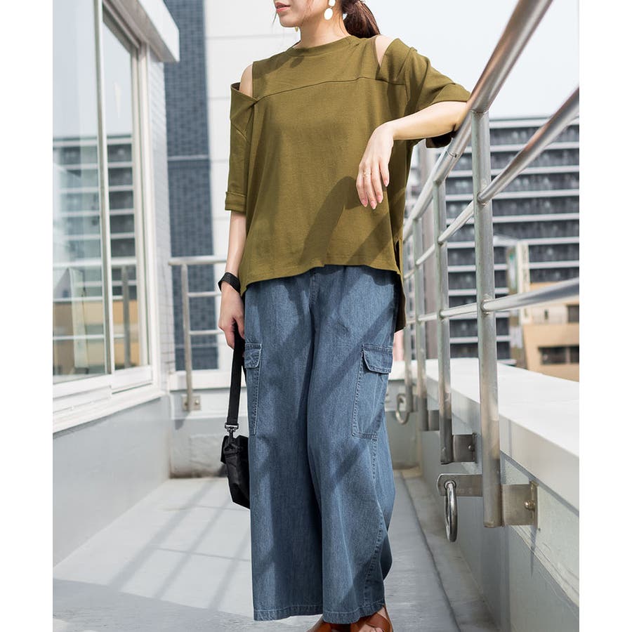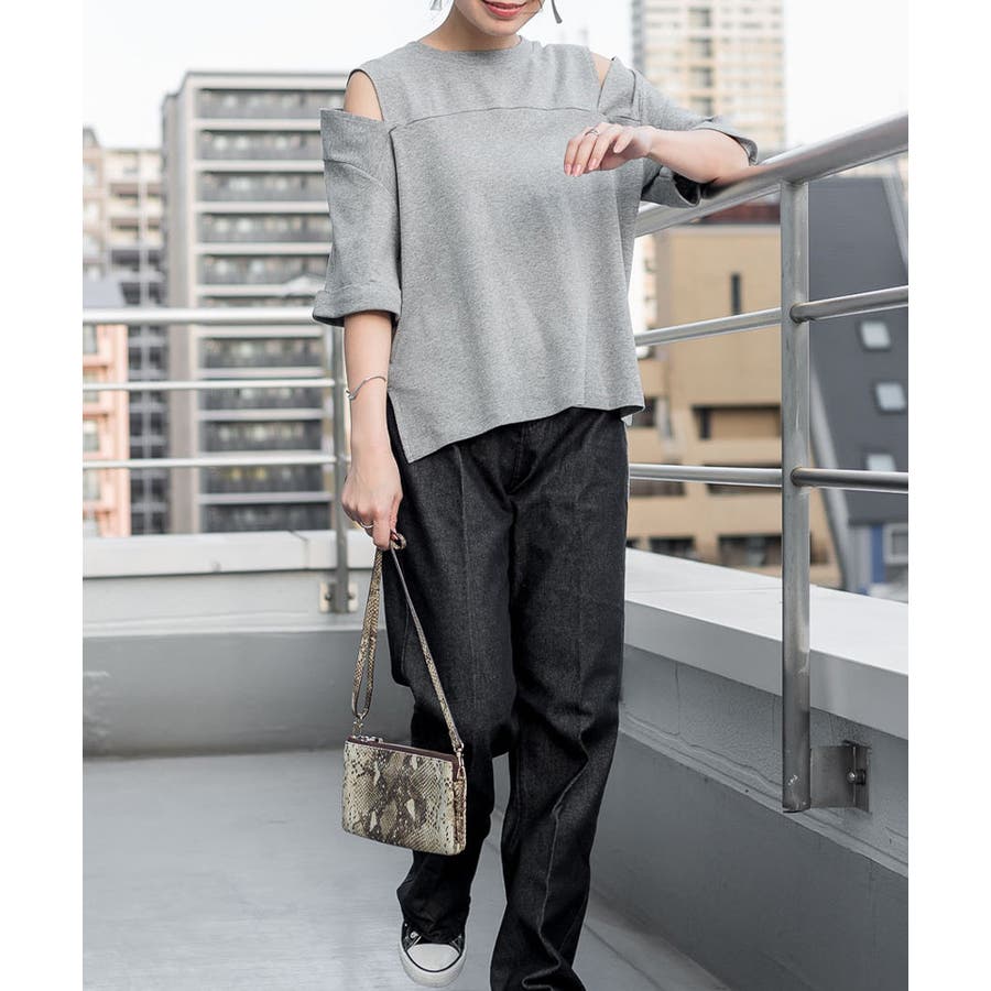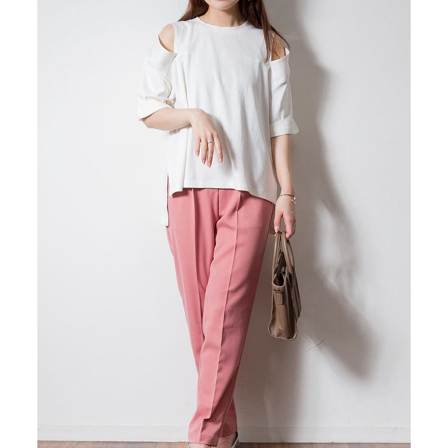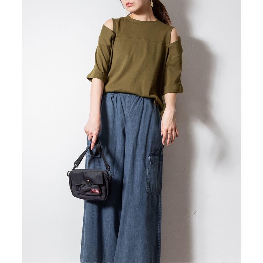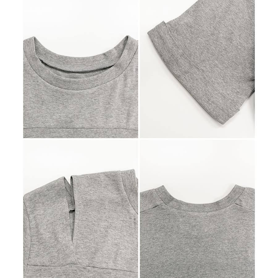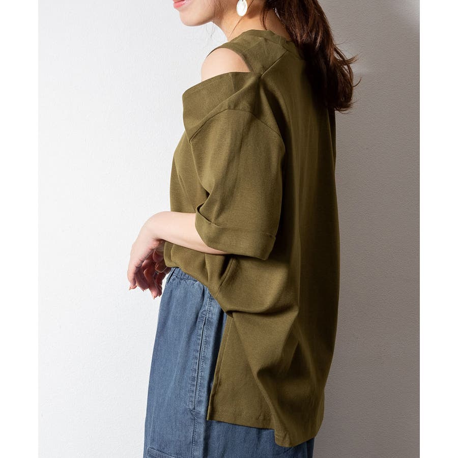 肩の部分が開いており、オシャレで大人っぽい印象を与えます。半袖なので、春から夏にかけて活躍するアイテムです。