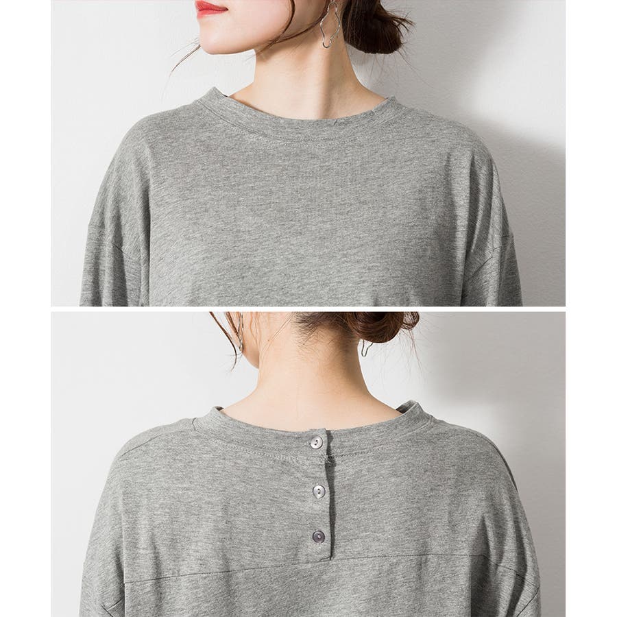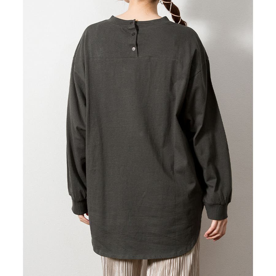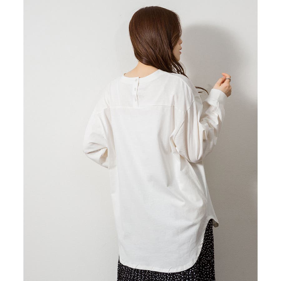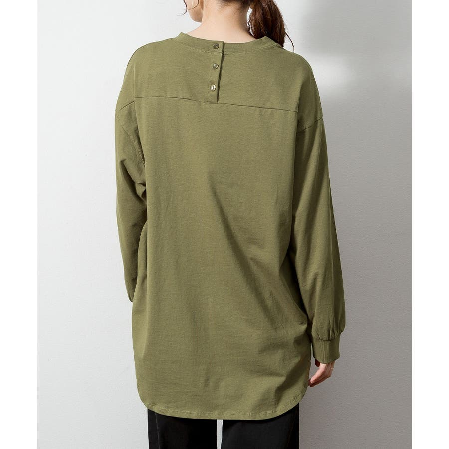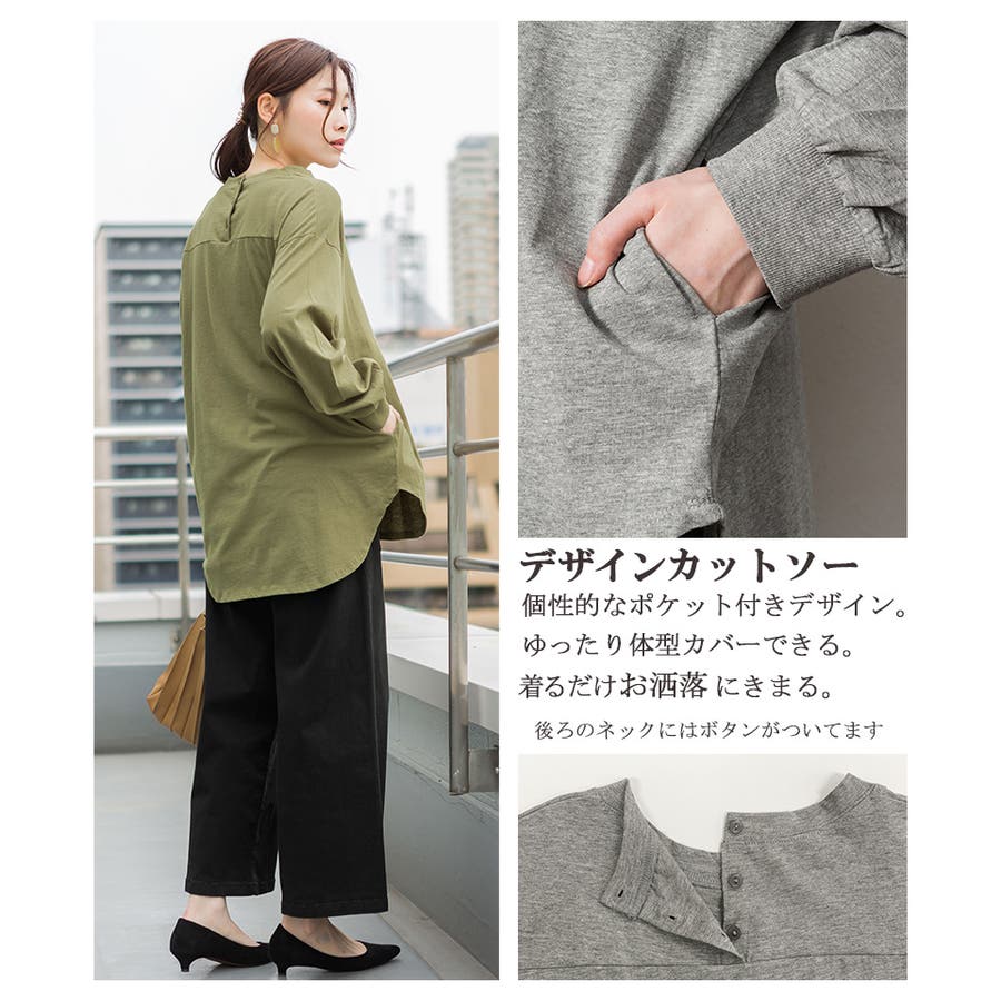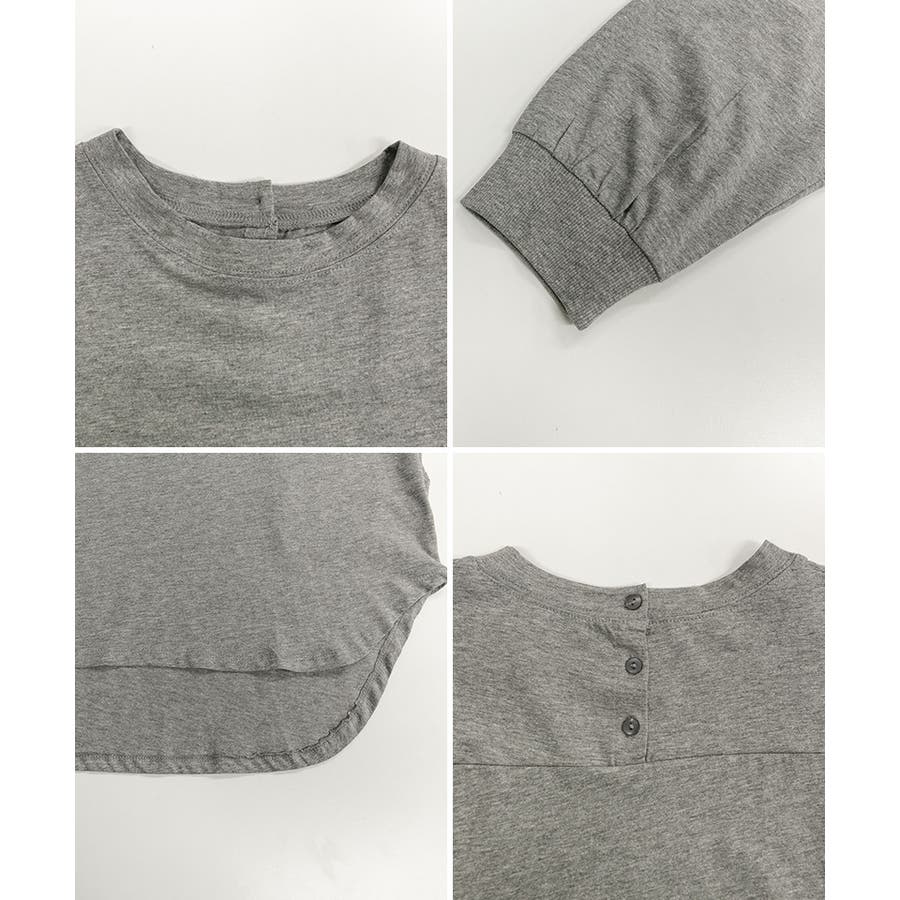 デザインはシンプルでありながら、後ろにあるボタンがアクセントになっており、後ろ姿がおしゃれに見えるようになっています。また、ロングスリーブでありながら、袖口がリブ仕様になっているため、腕周りをきゅっと引き締めてくれます。
