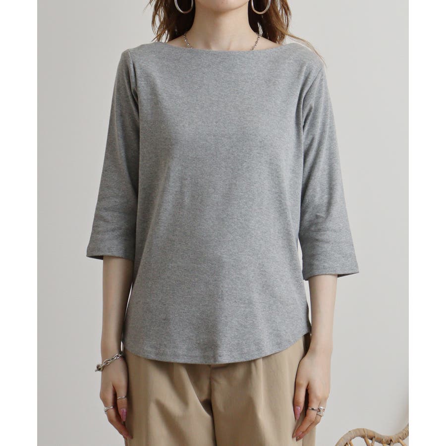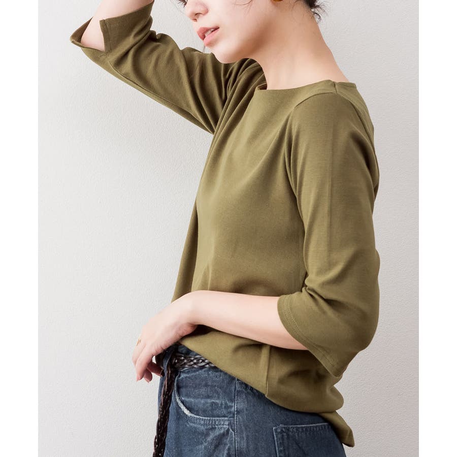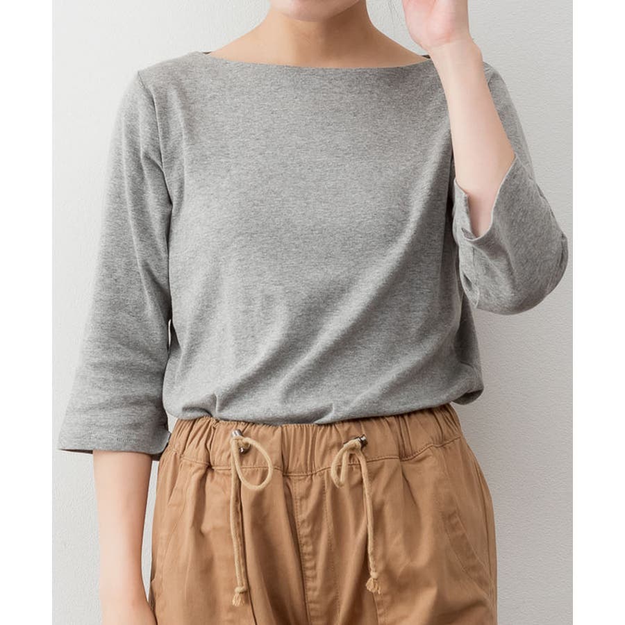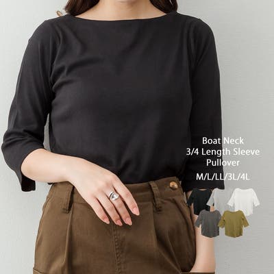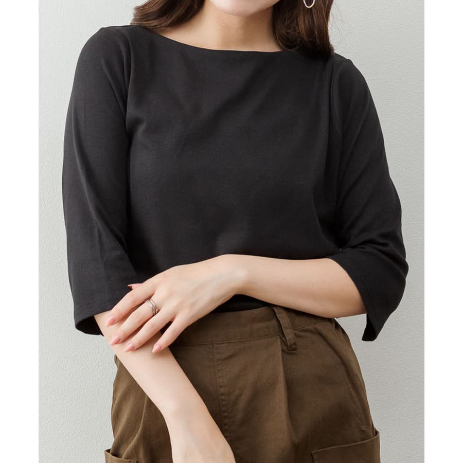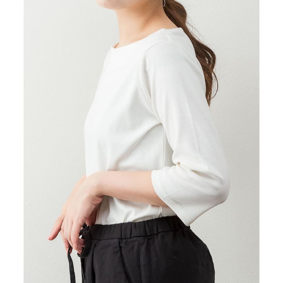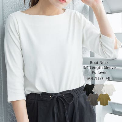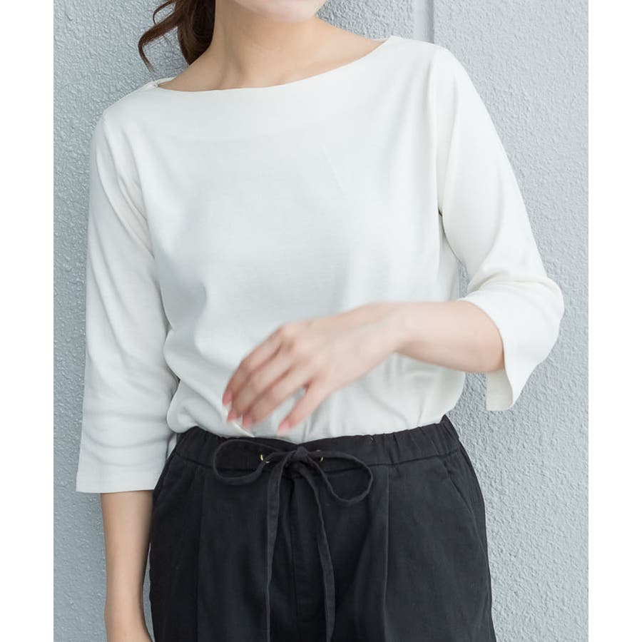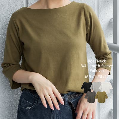 ボートネックのシンプルな七分袖プルオーバー。