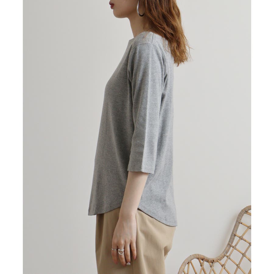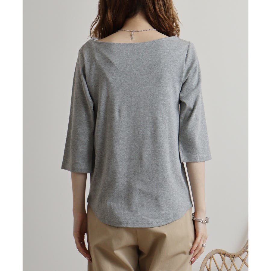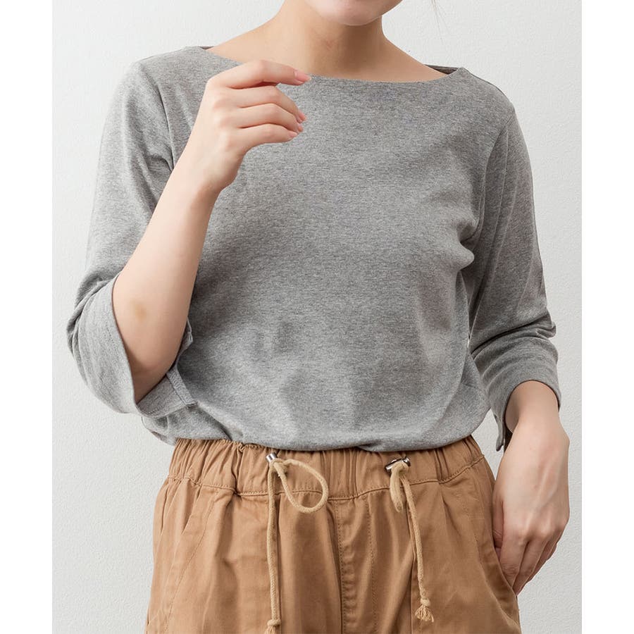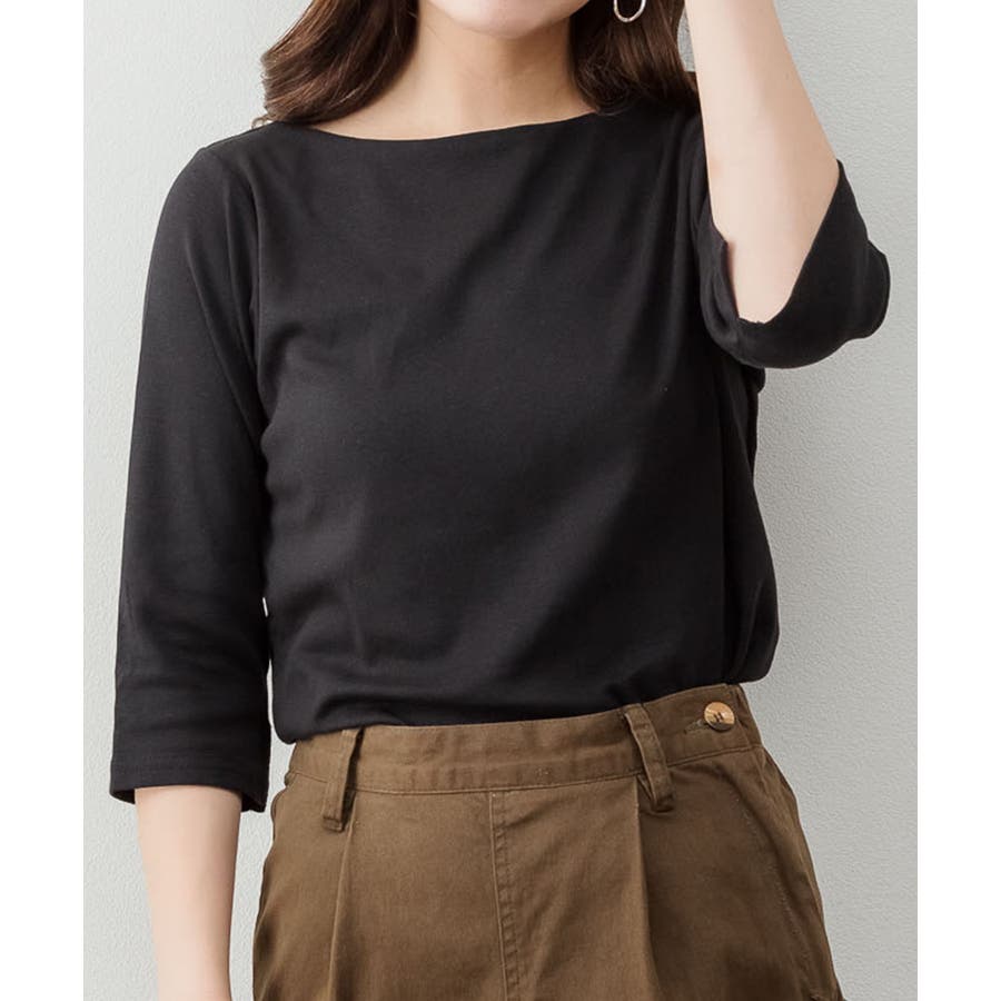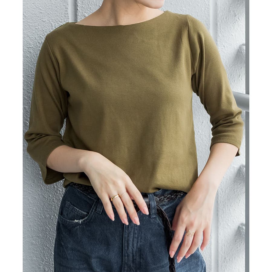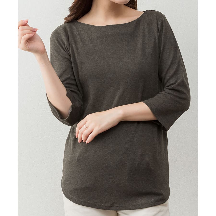 ボートネックのシンプルな七分袖プルオーバー。