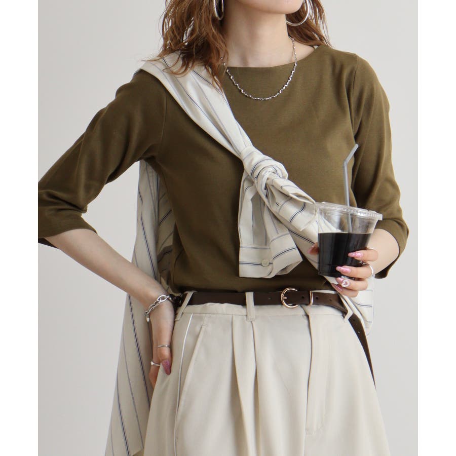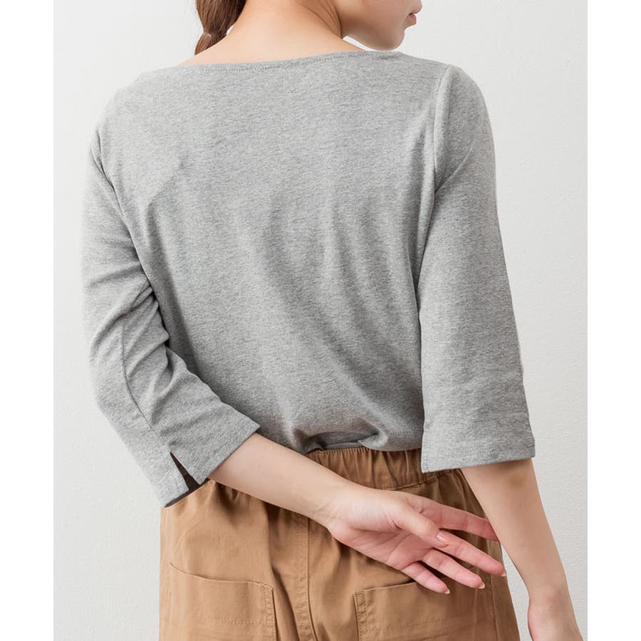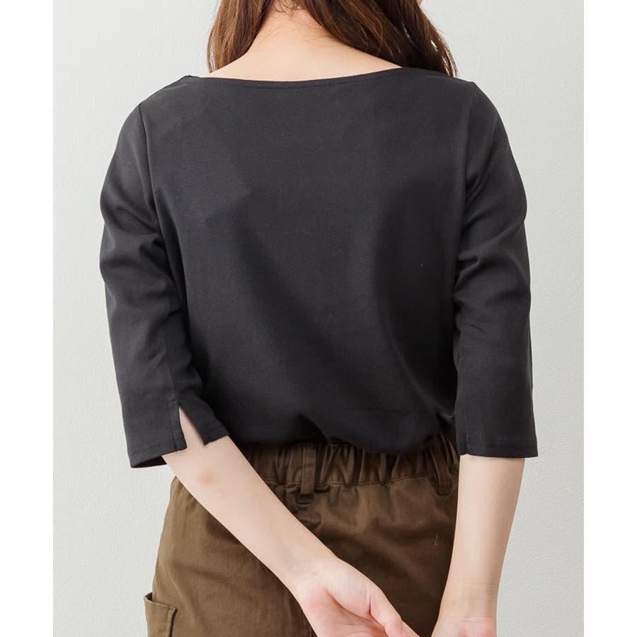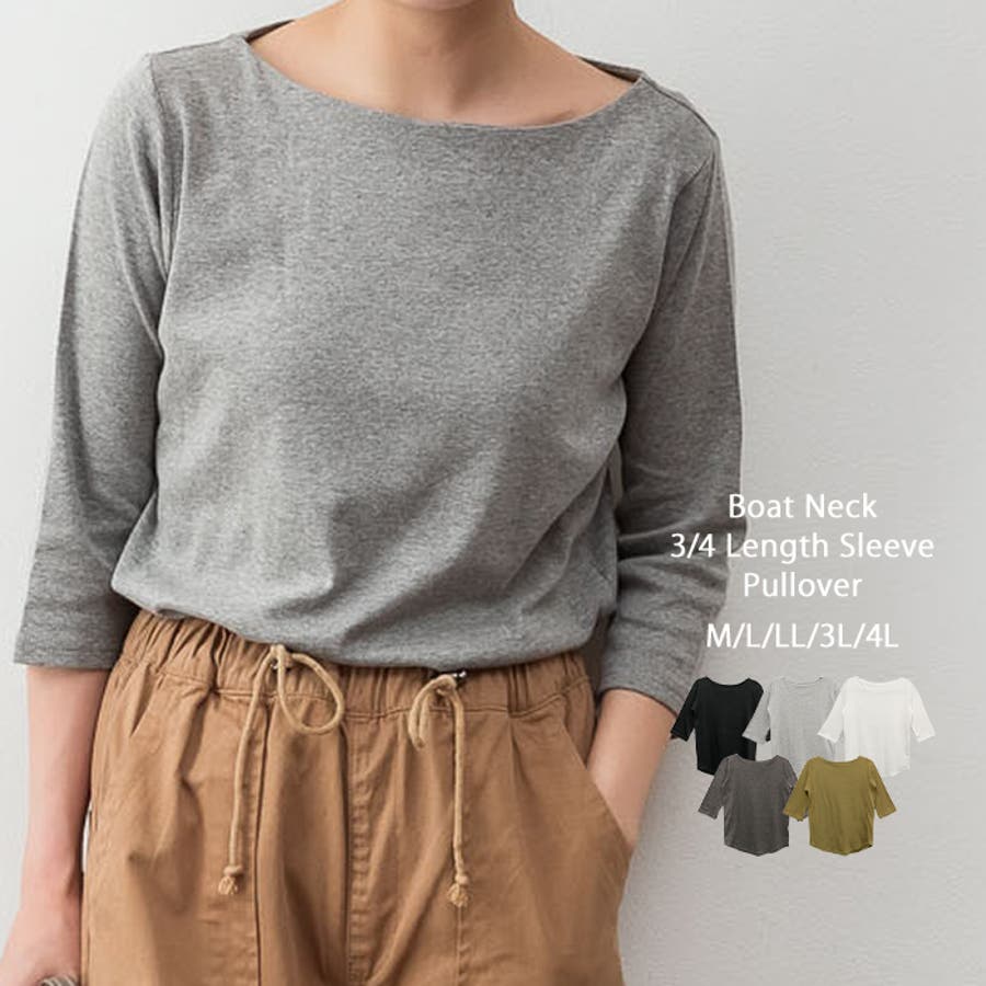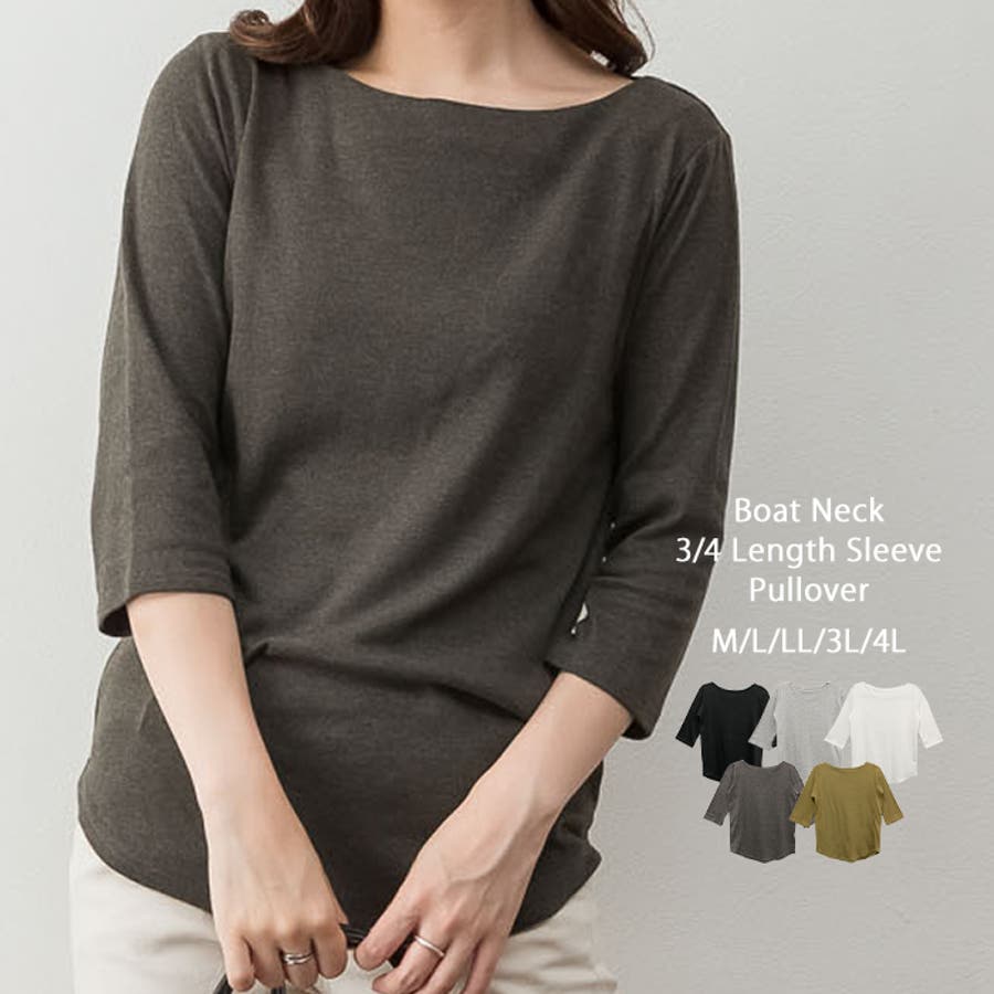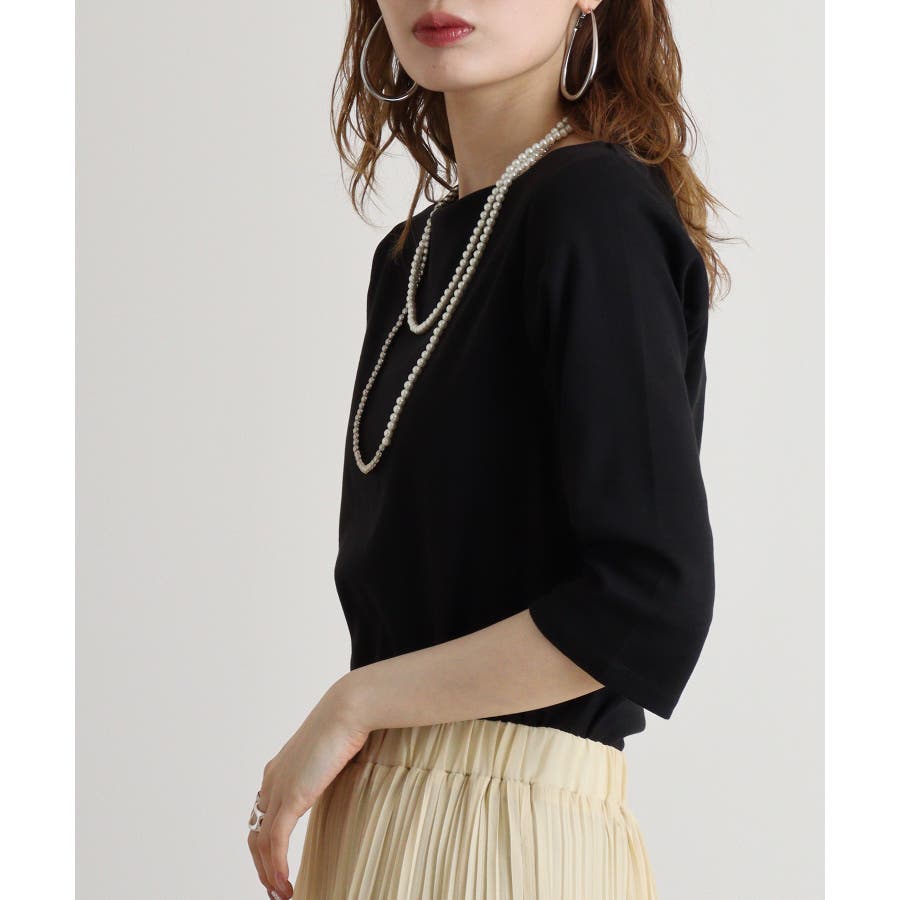 ボートネックのシンプルな七分袖プルオーバー。