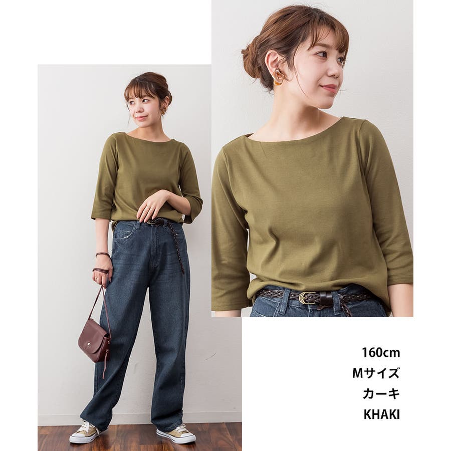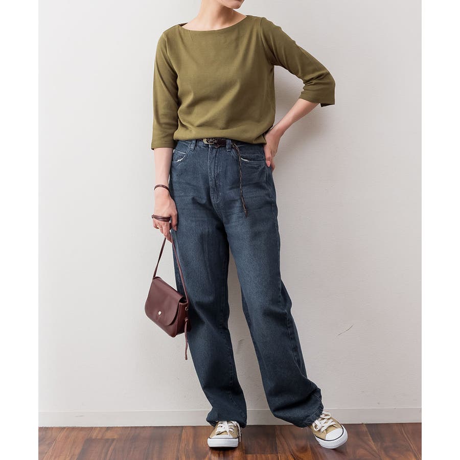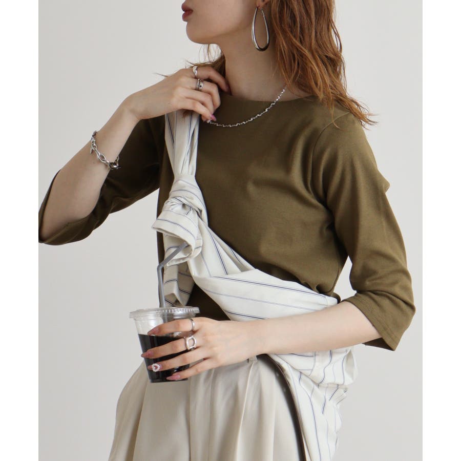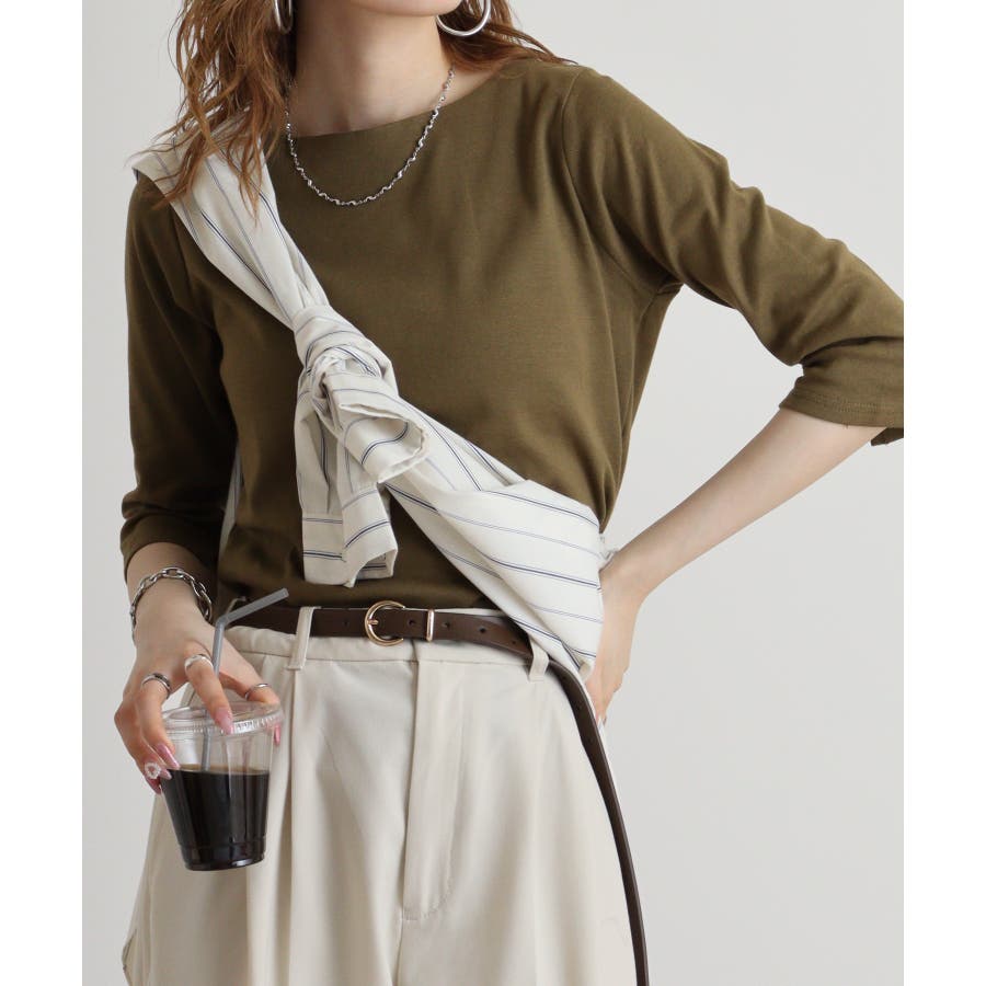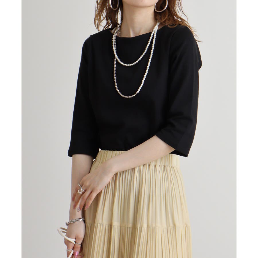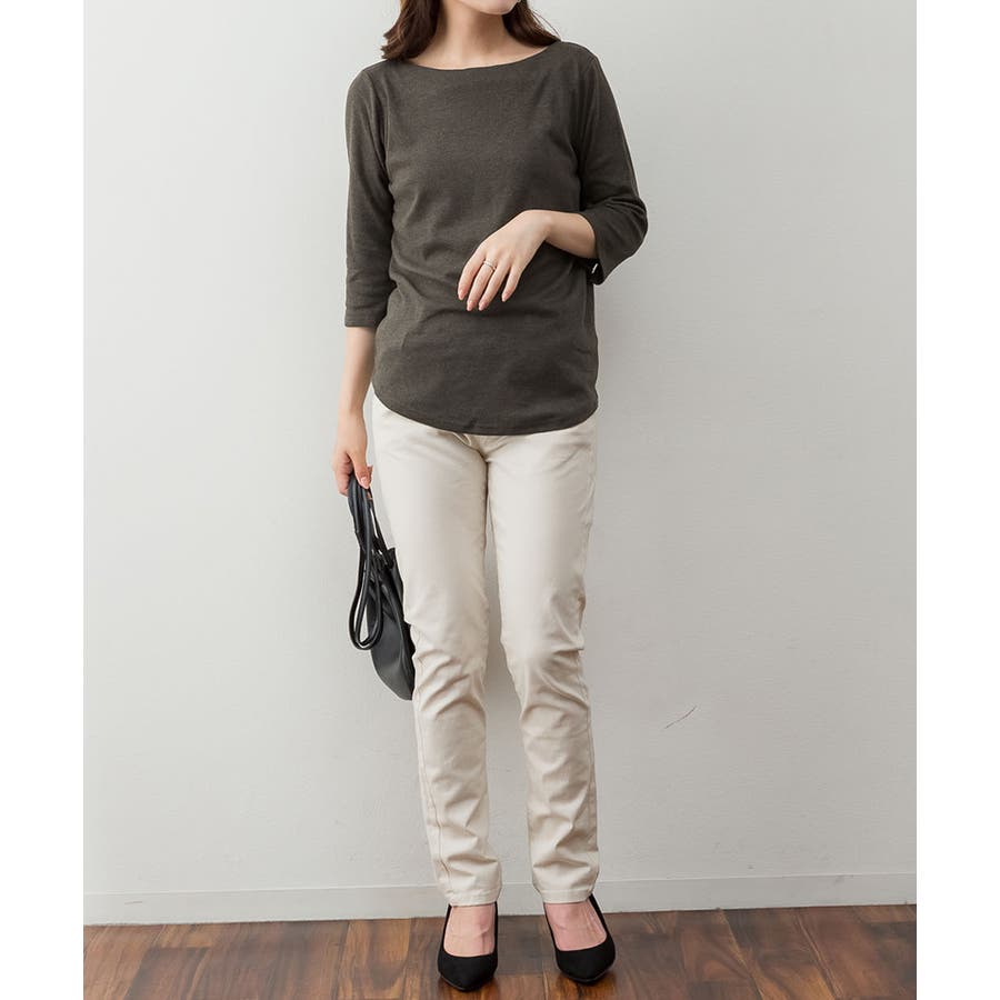 ボートネックのシンプルな七分袖プルオーバー。