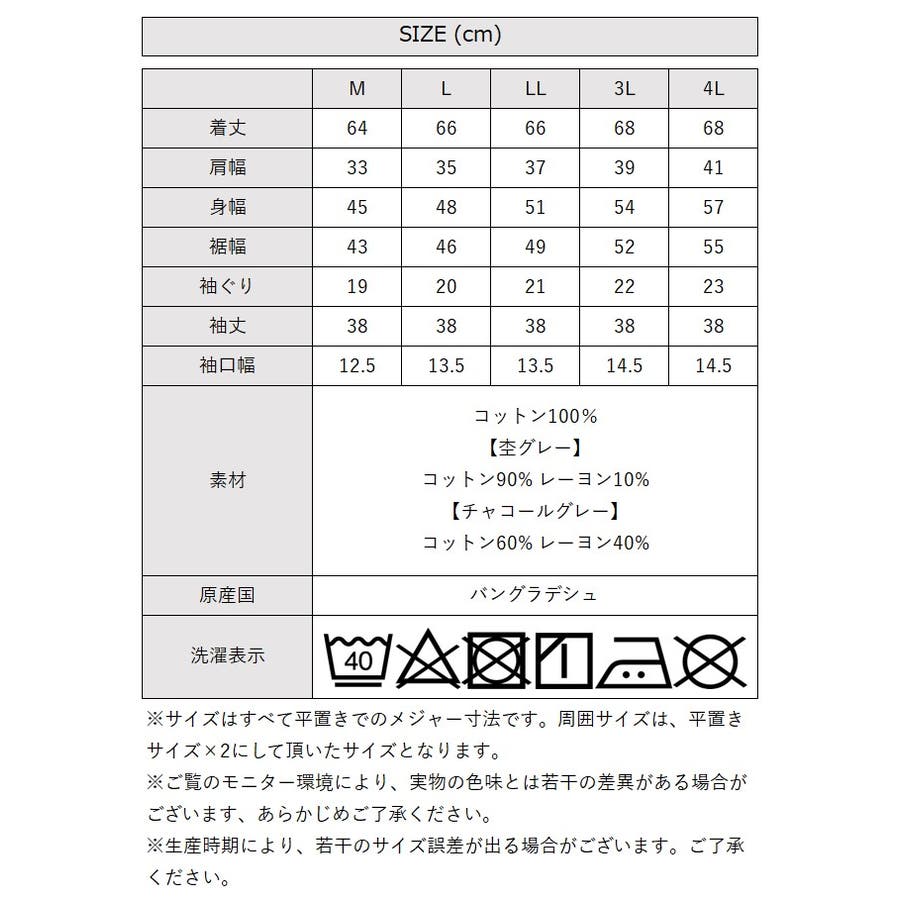 [3Lサイズ]丈:68cm、肩幅:39cm、身幅:54cm、袖幅:20cm、袖丈:38cm、裾幅:52cm