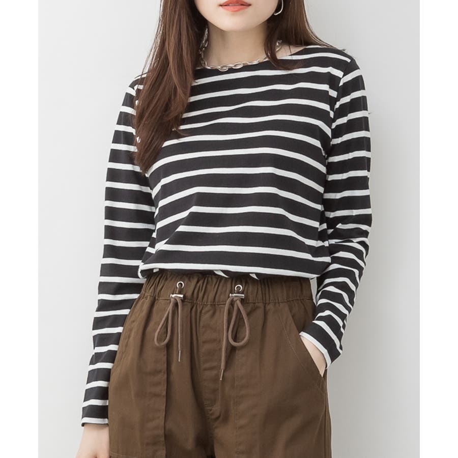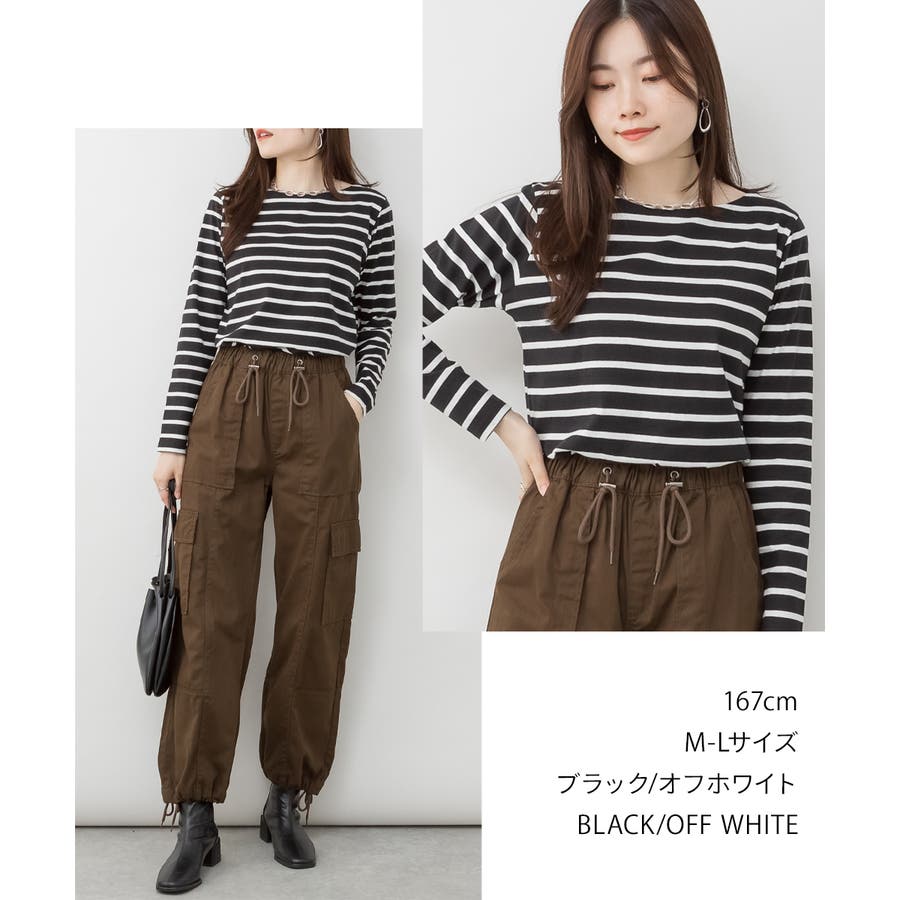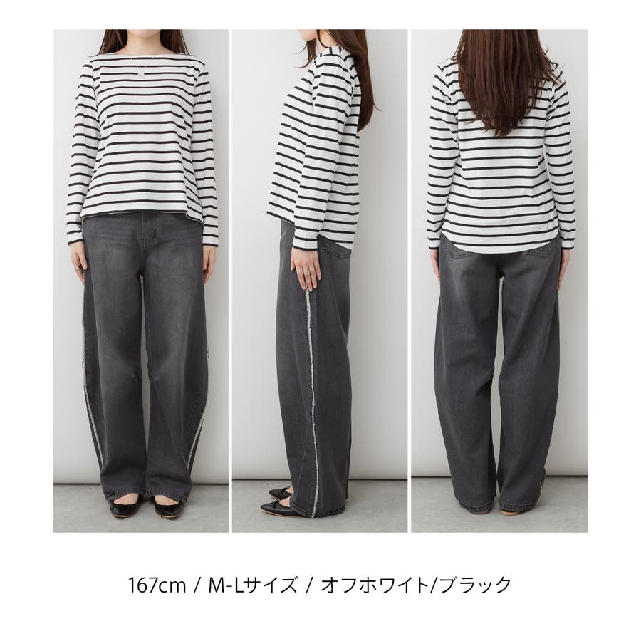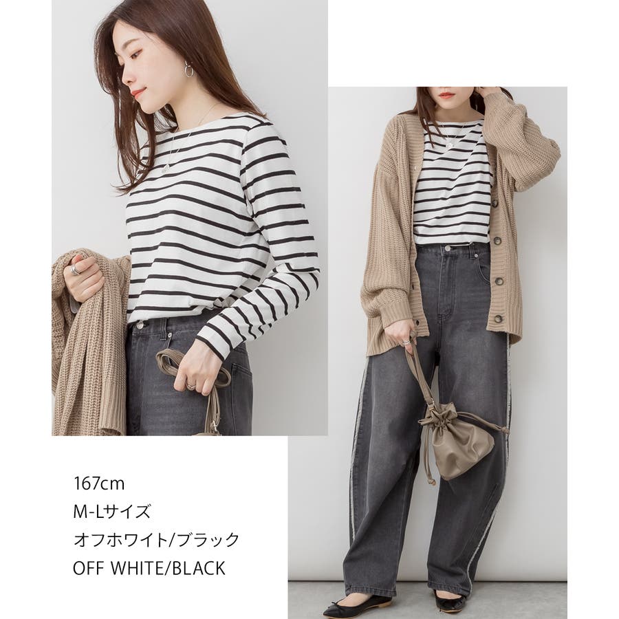【オフホワイト/ブラック】ラウンドネックボーダー長袖カットソー