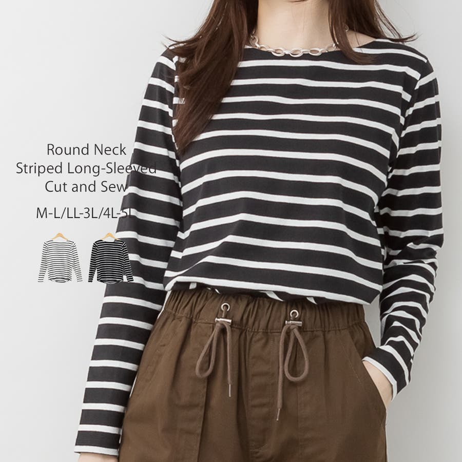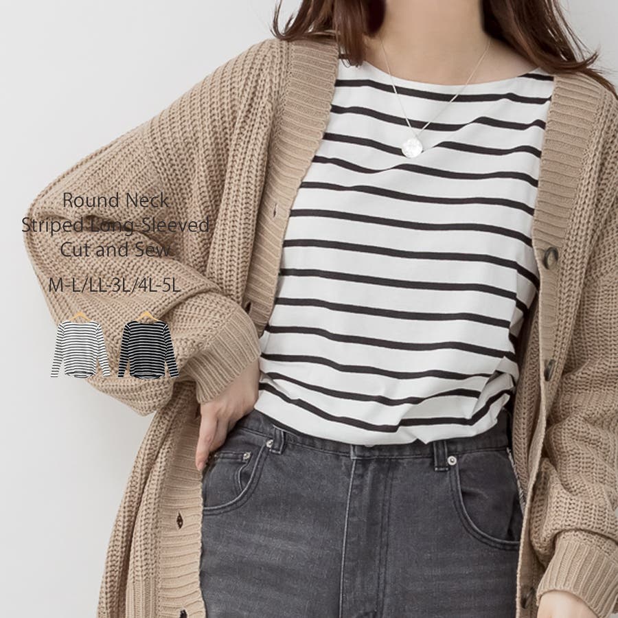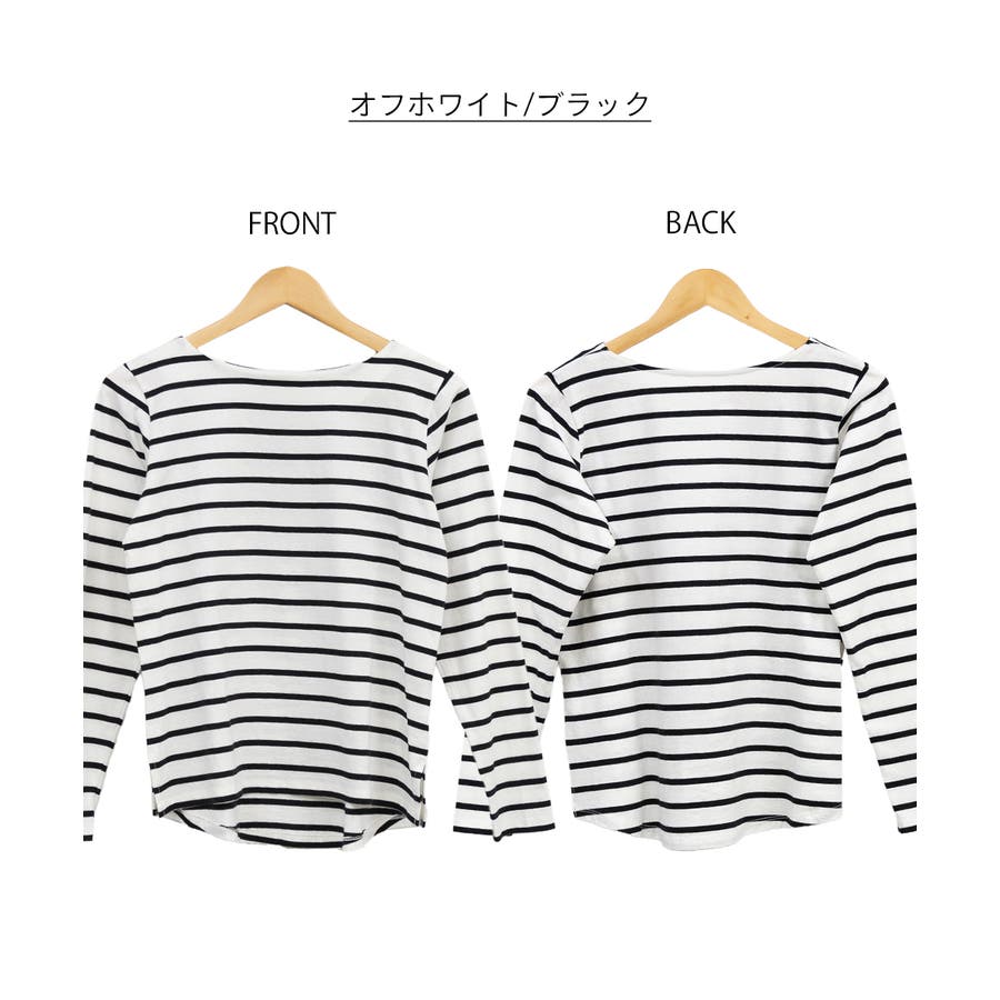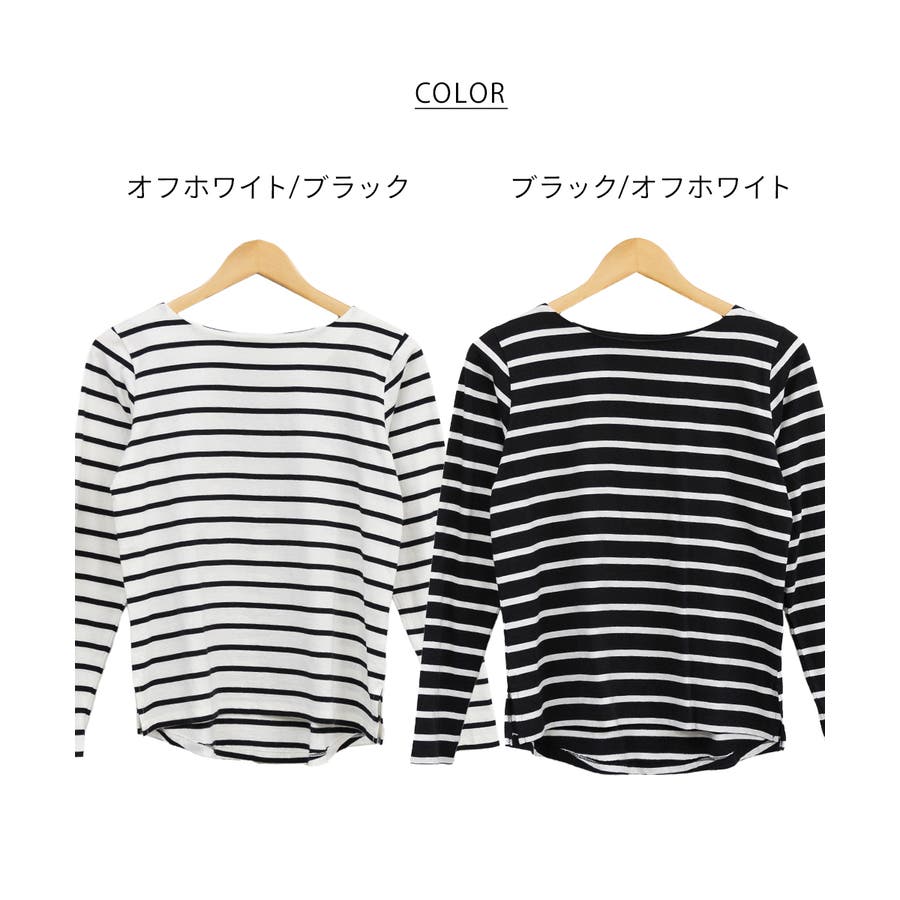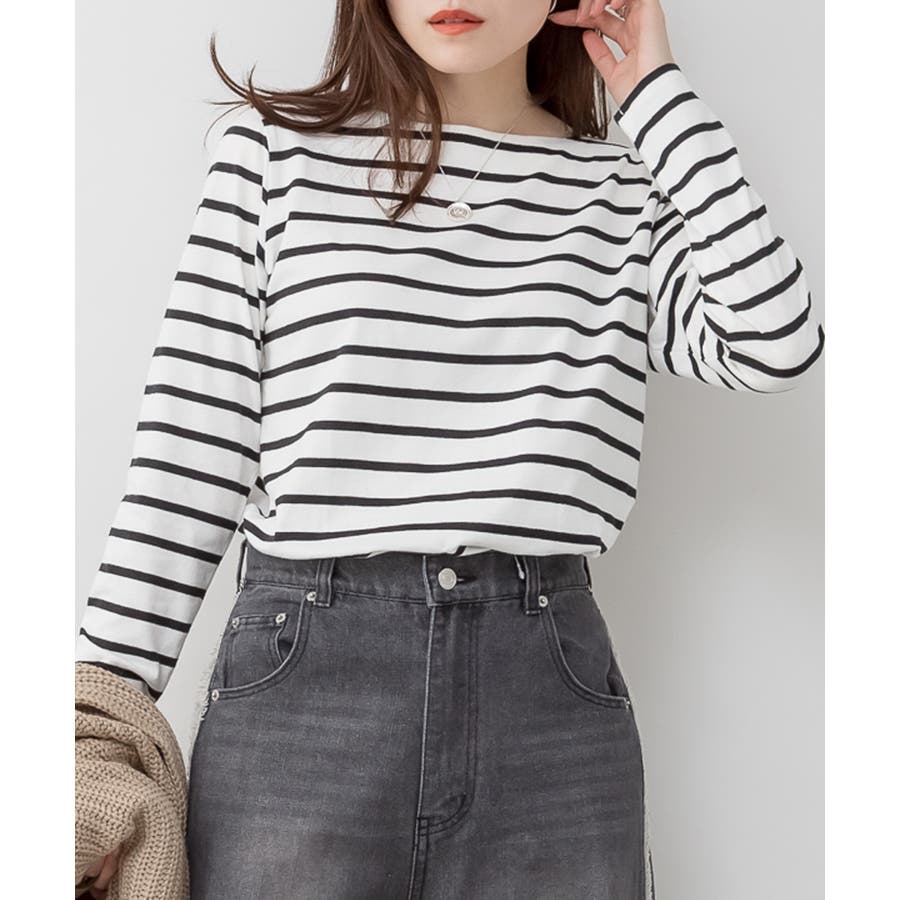 【オフホワイト/ブラック】ラウンドネックボーダー長袖カットソー