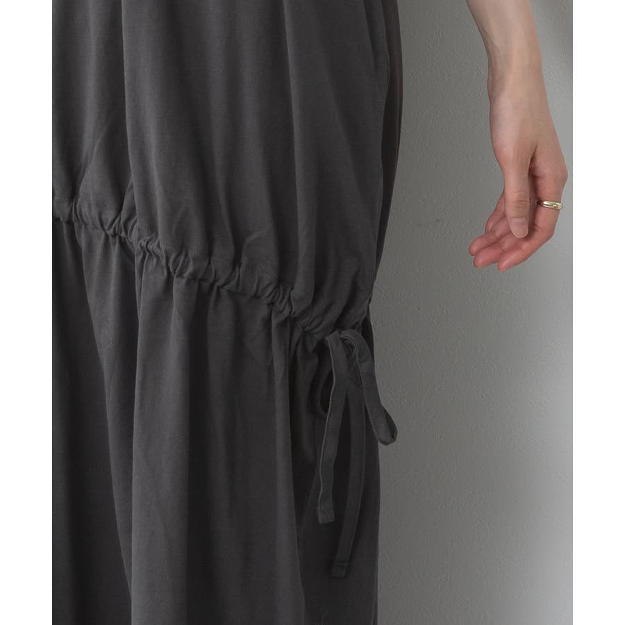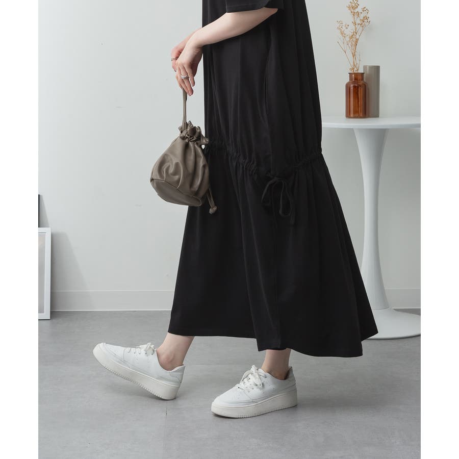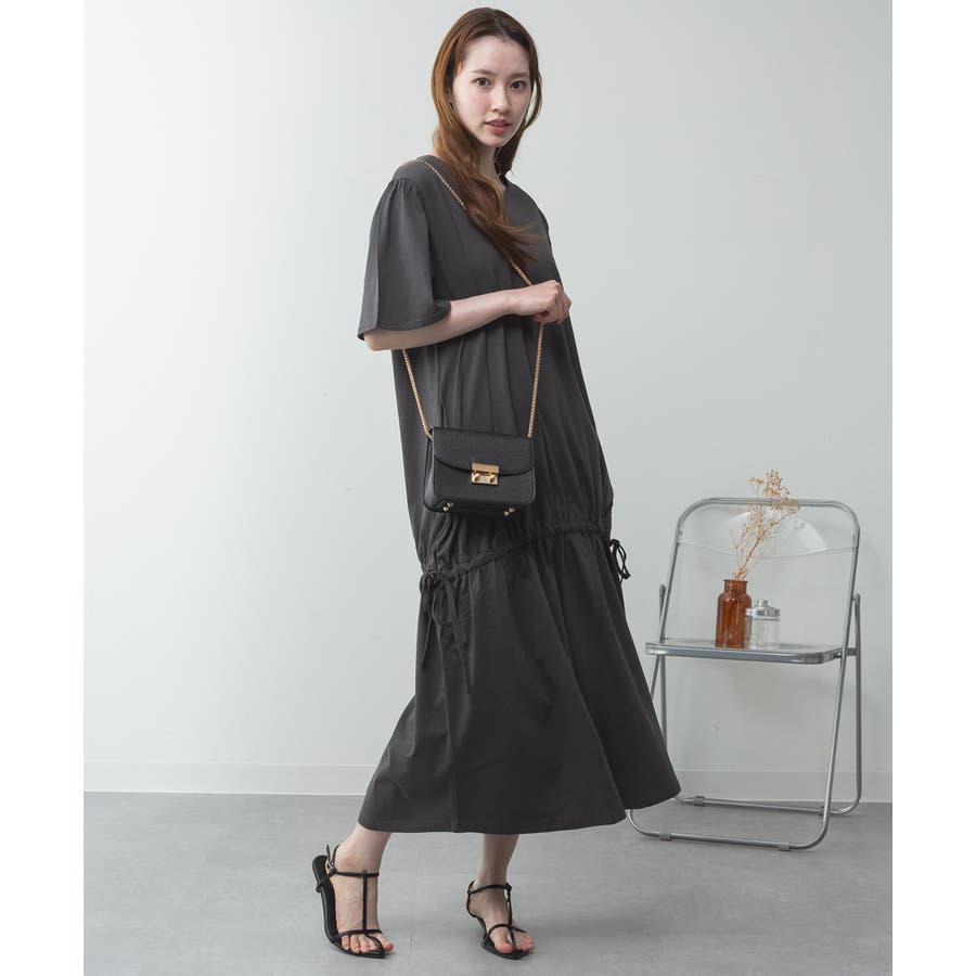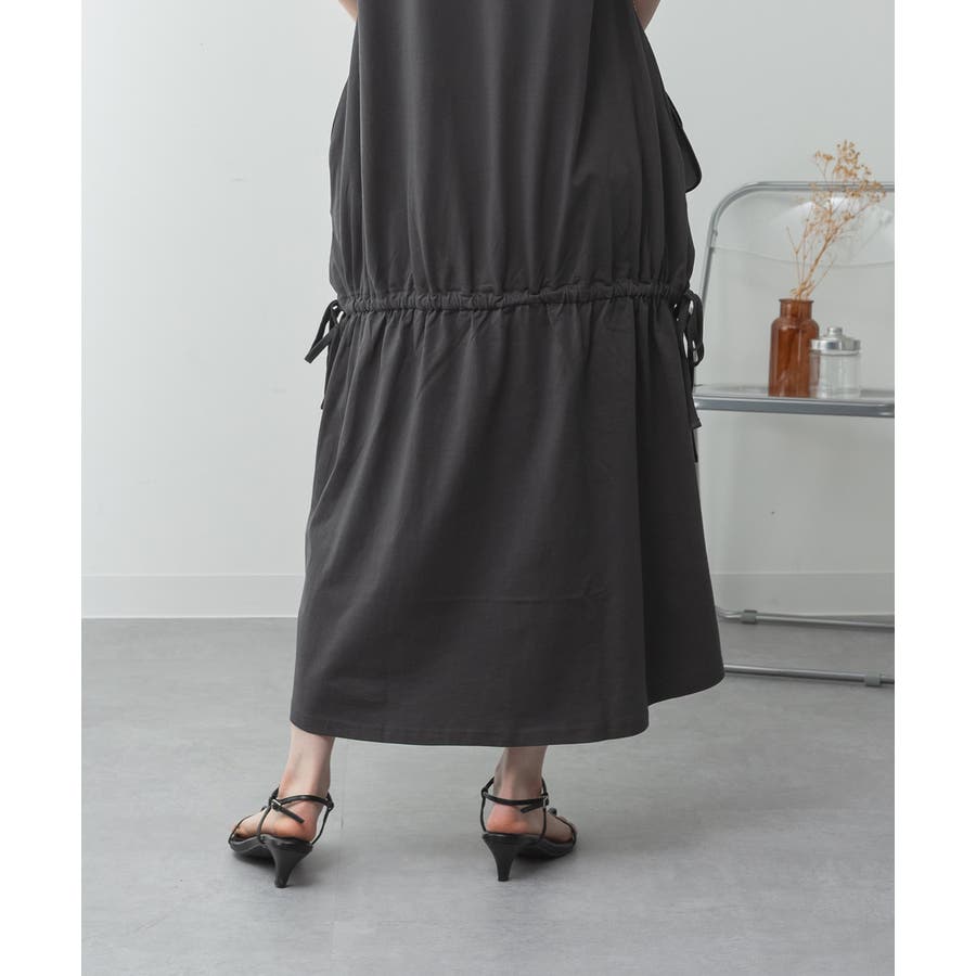 ウエスト部分にはドロストシャーリングが施され、シルエット調整も自在。