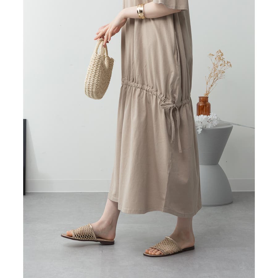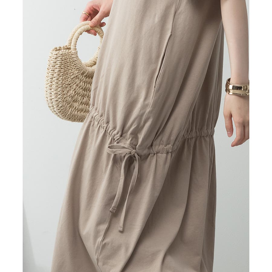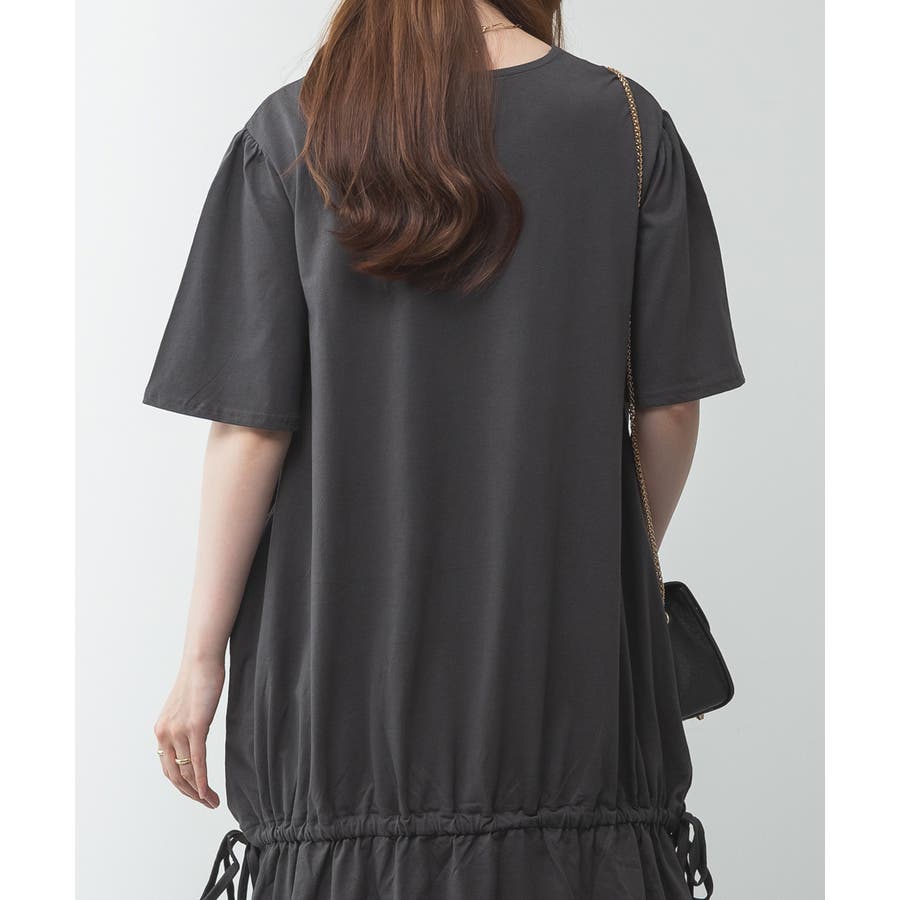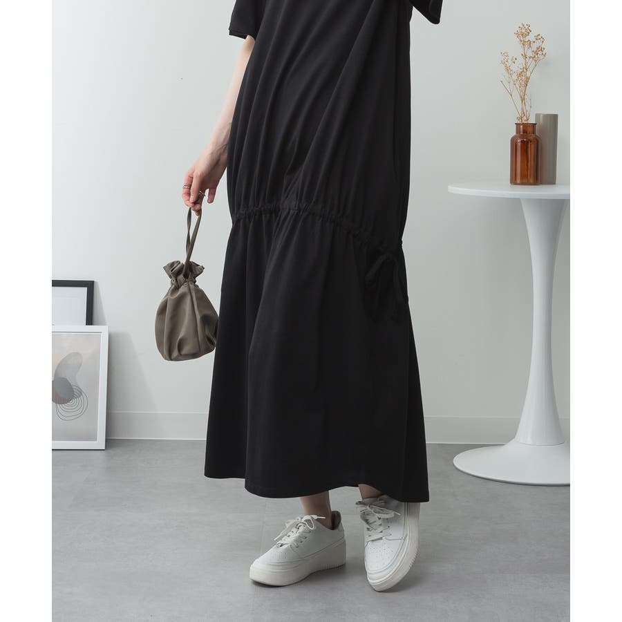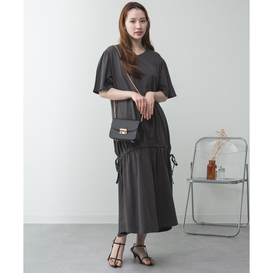 ウエスト部分にはドロストシャーリングが施され、シルエット調整も自在。