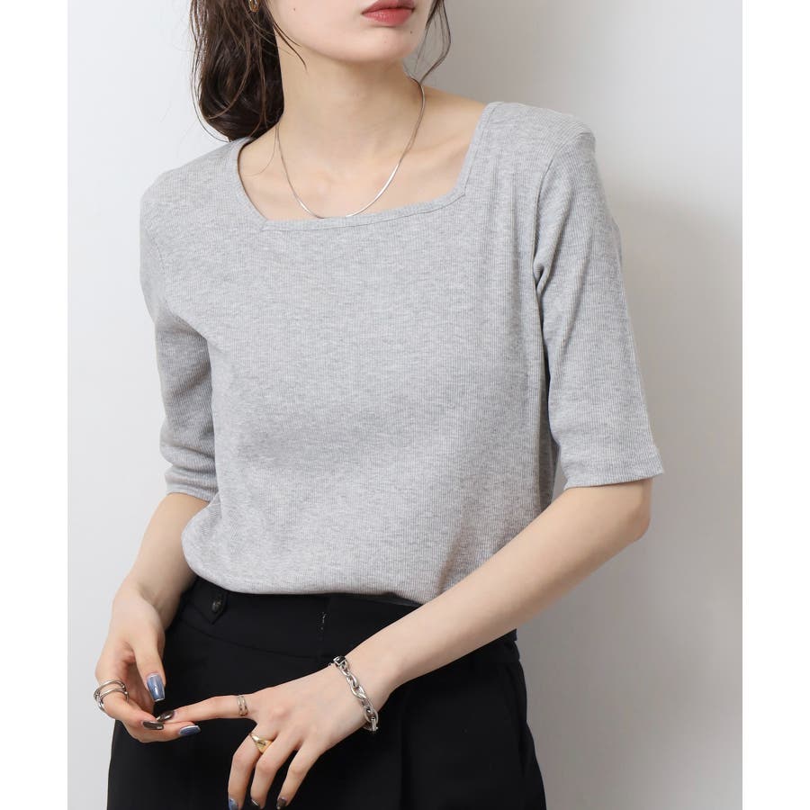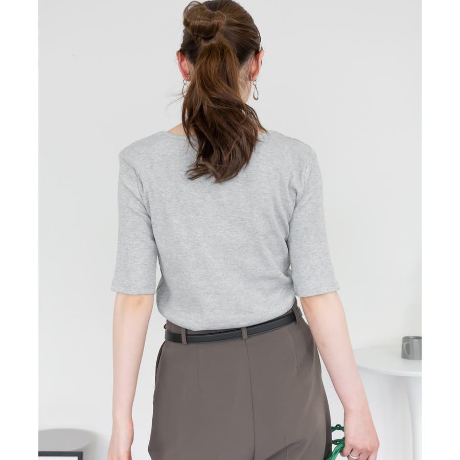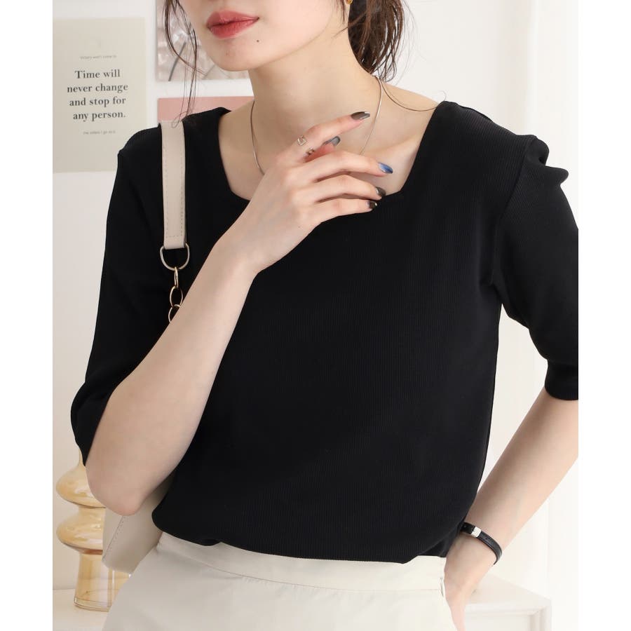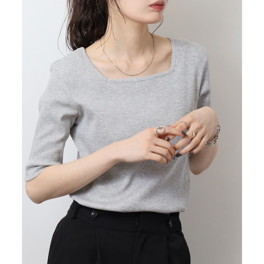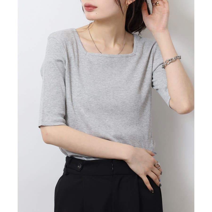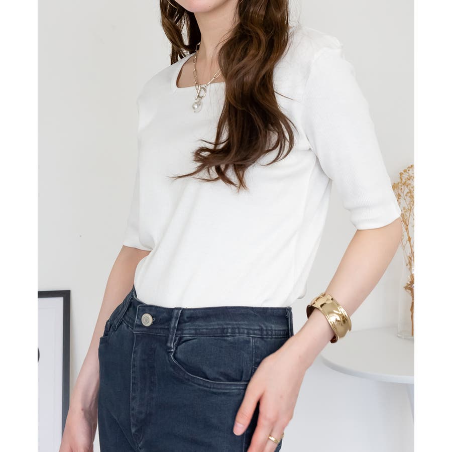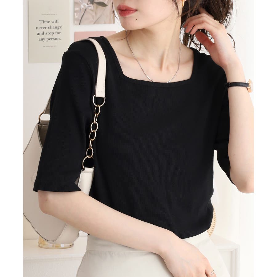 スクエアネック5分袖コットンリブTシャツ