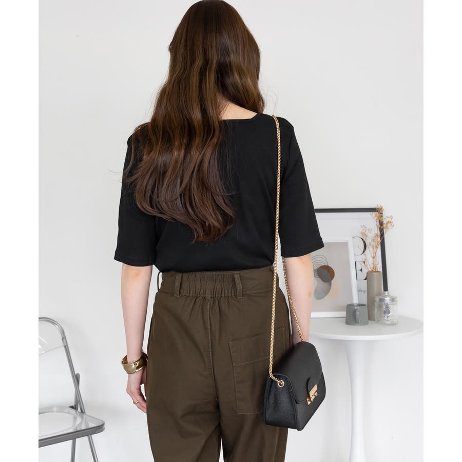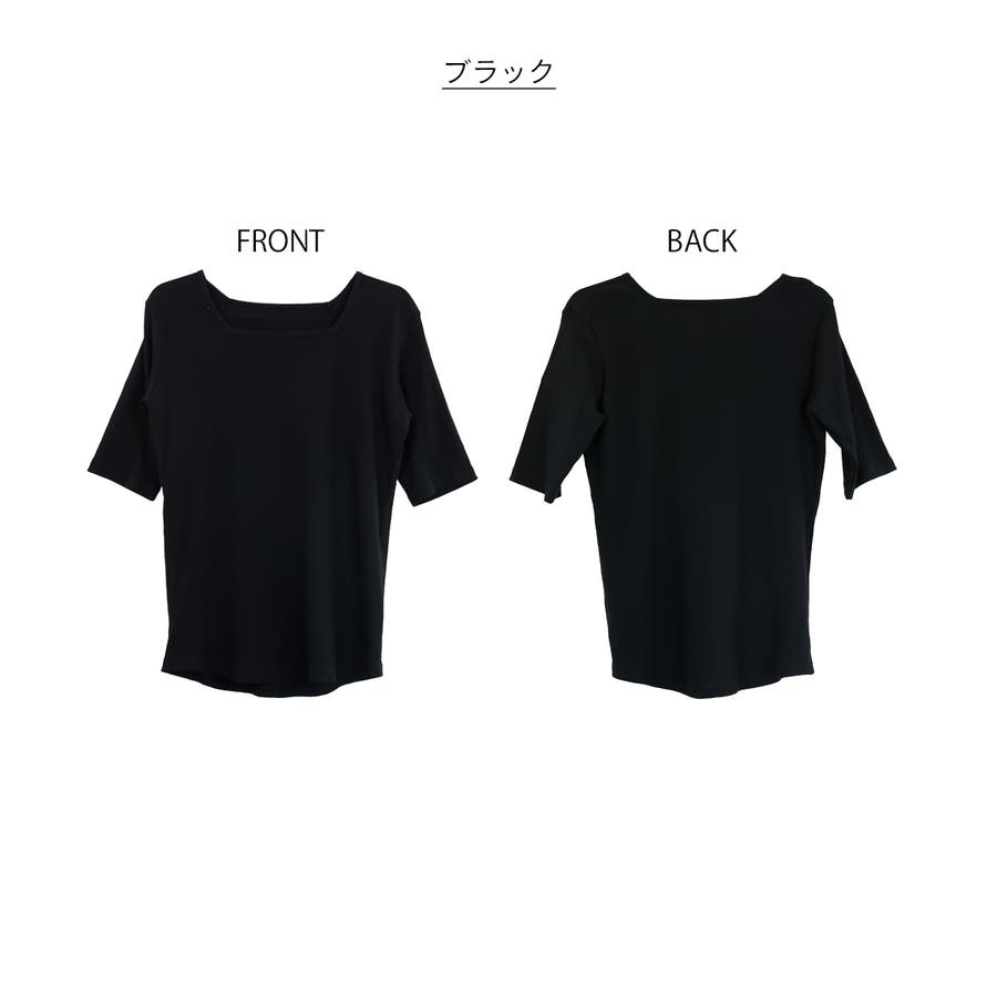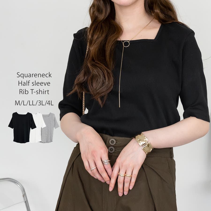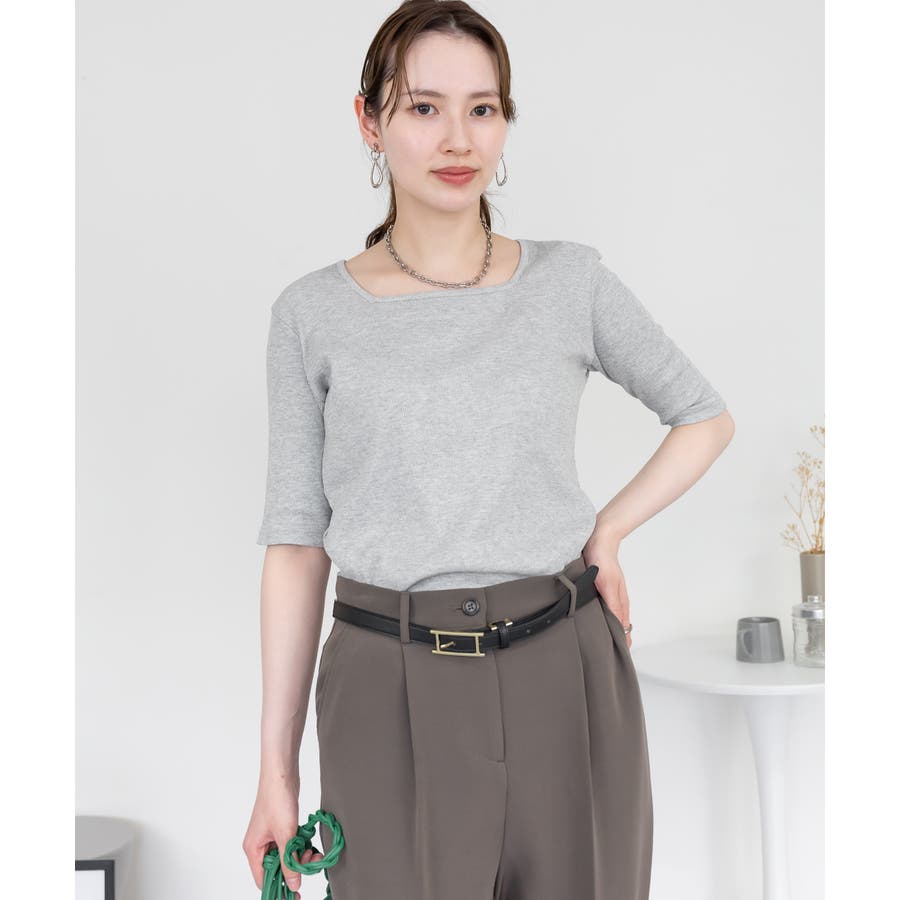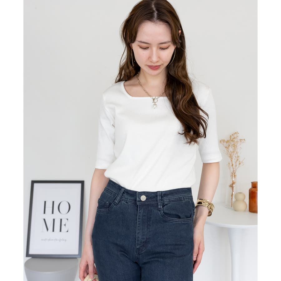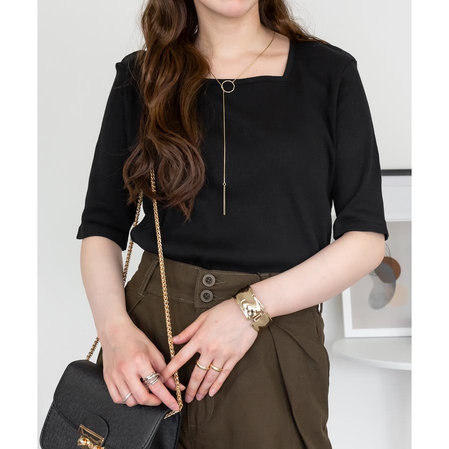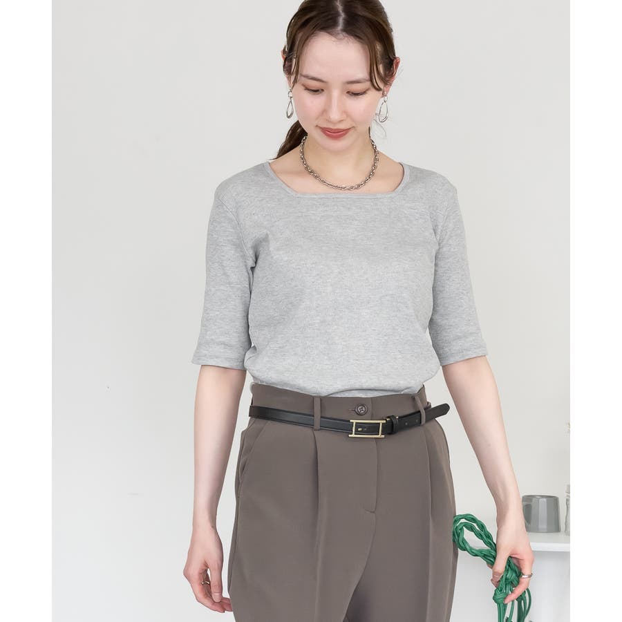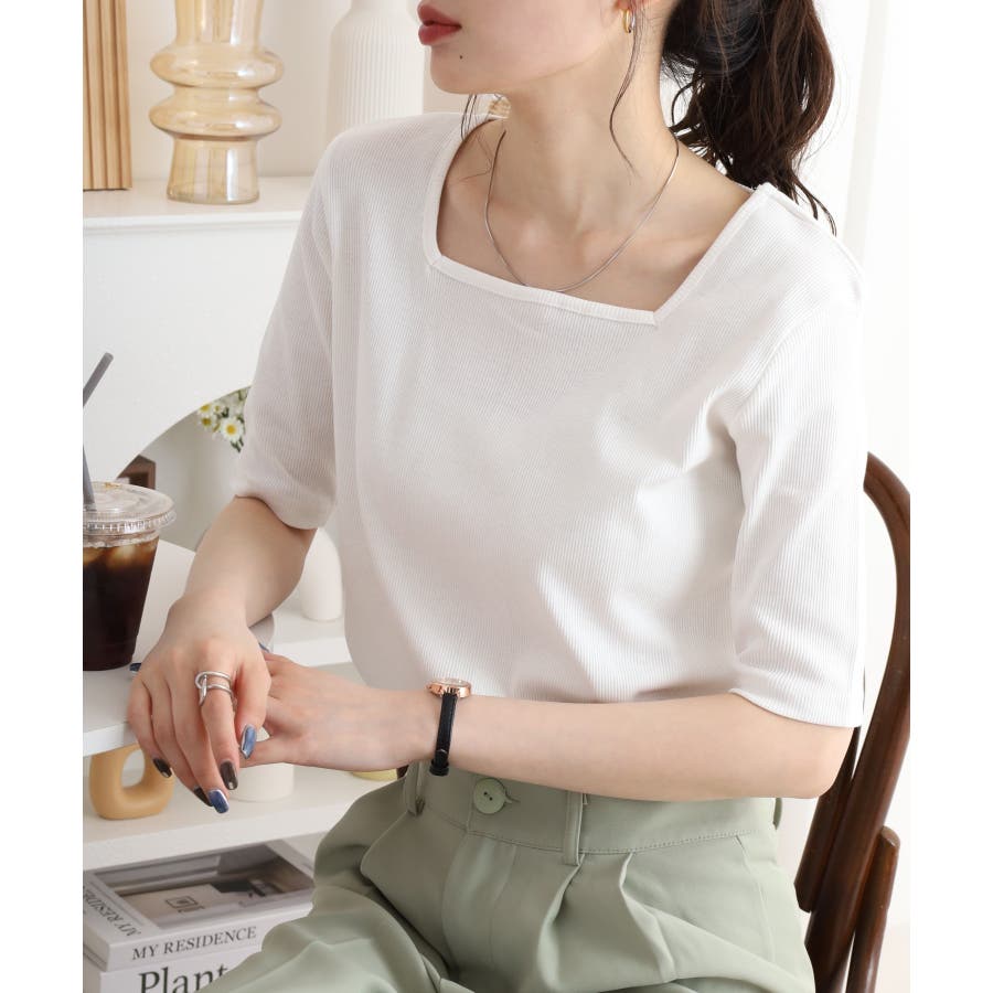 スクエアネック5分袖コットンリブTシャツ