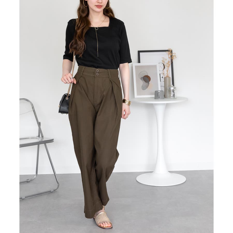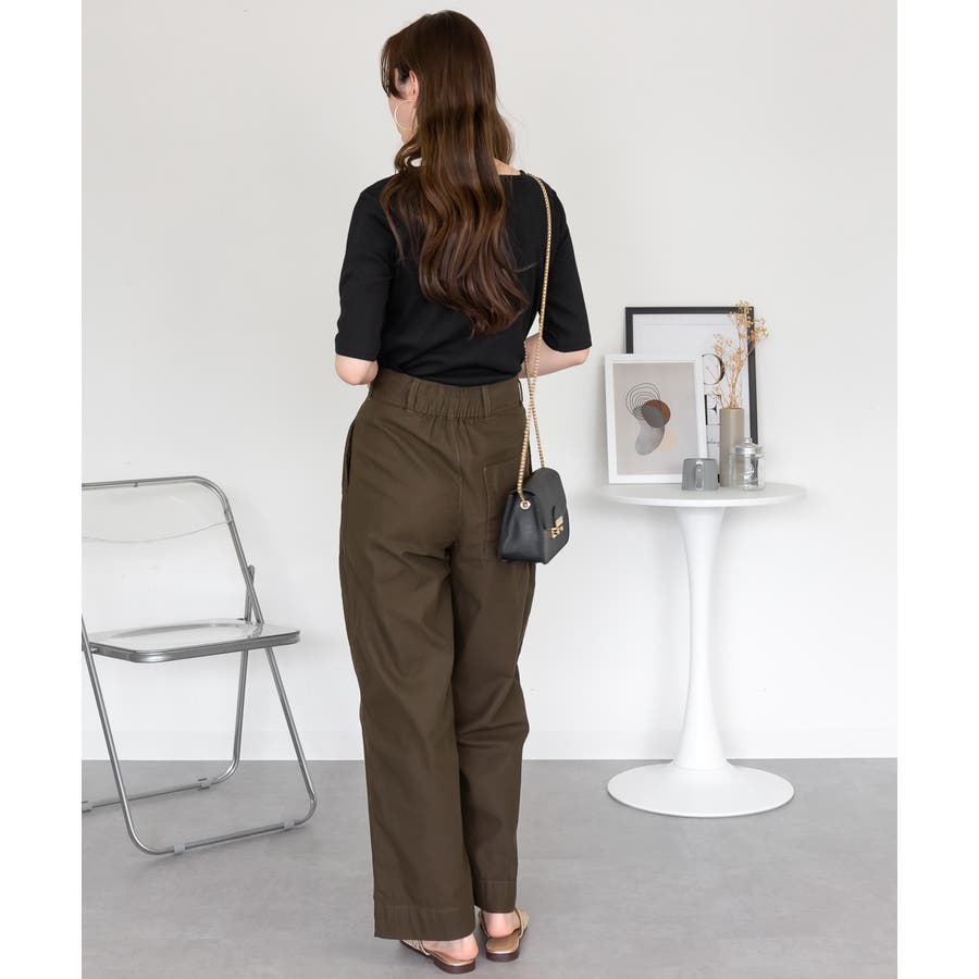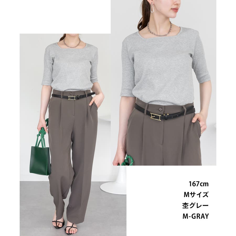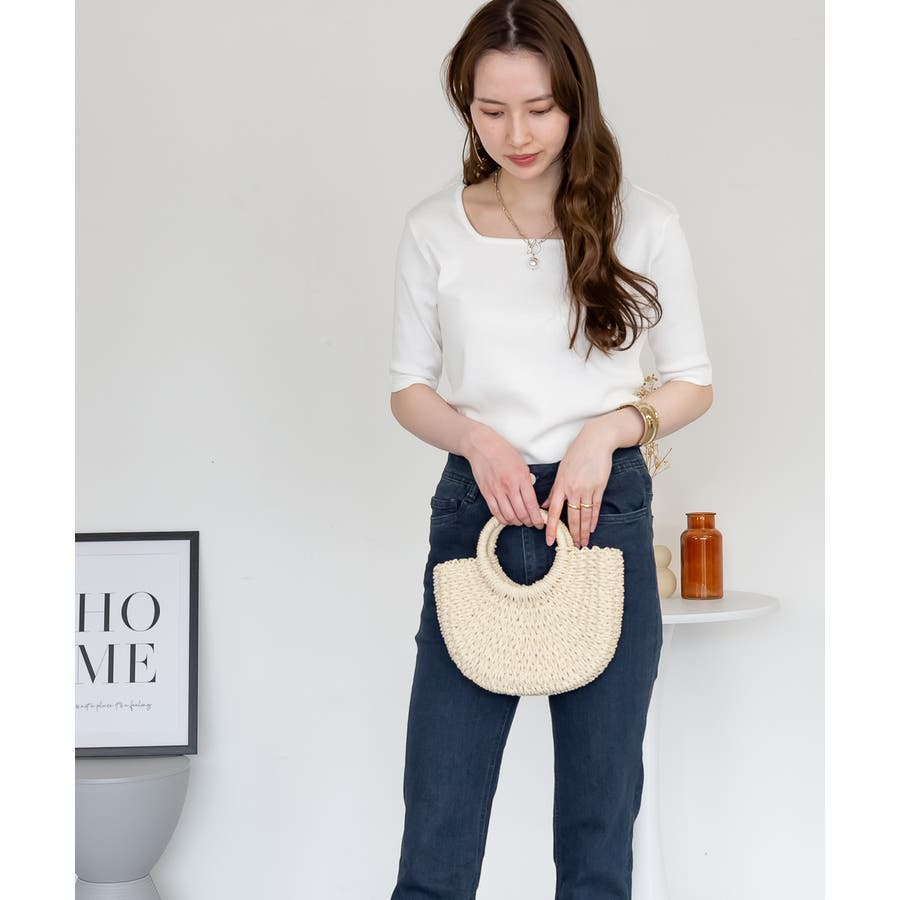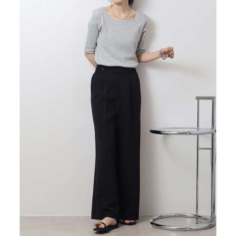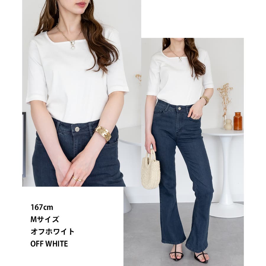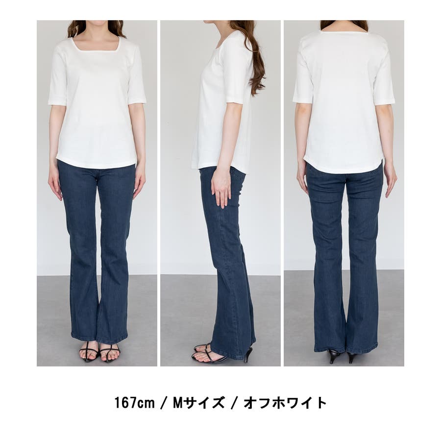 スクエアネック5分袖コットンリブTシャツ