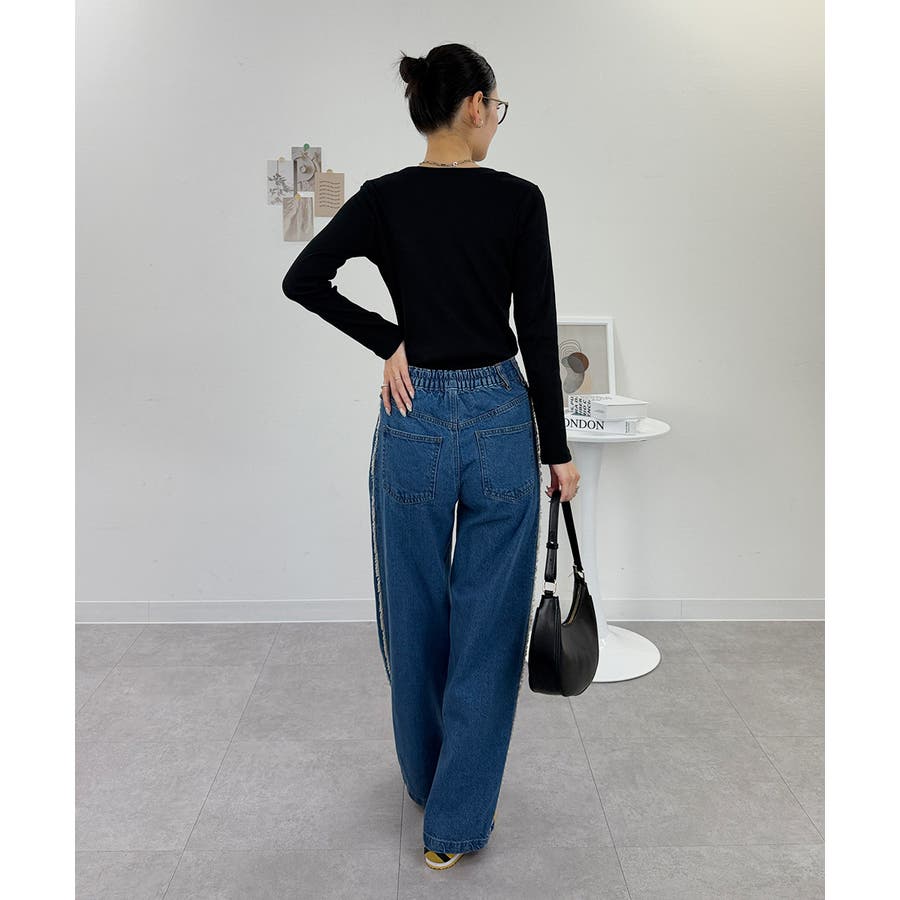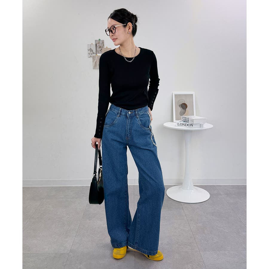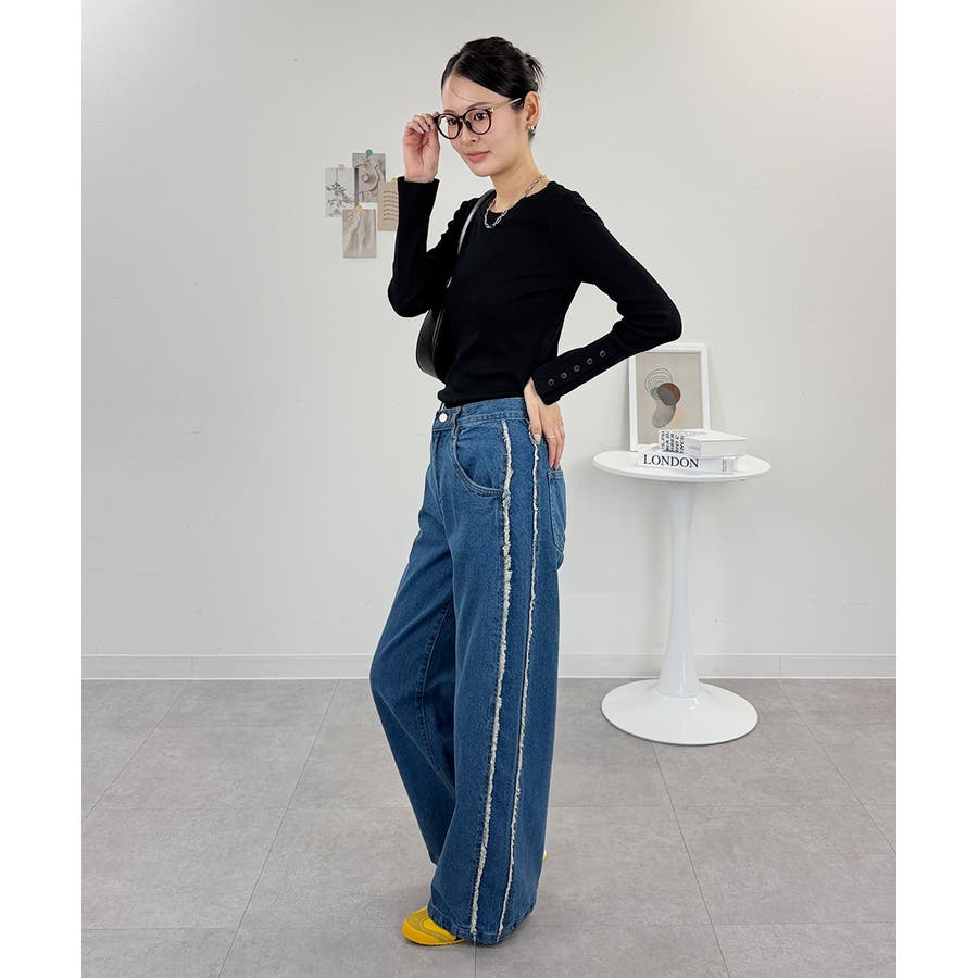 アクセサリーには華奢なゴールドピアスと細めのチェーンネックレスを添えると、袖コンシャスなデザインがより引き立つ春の上品カジュアルが完成。