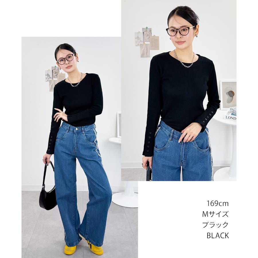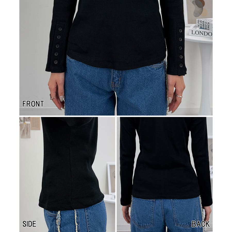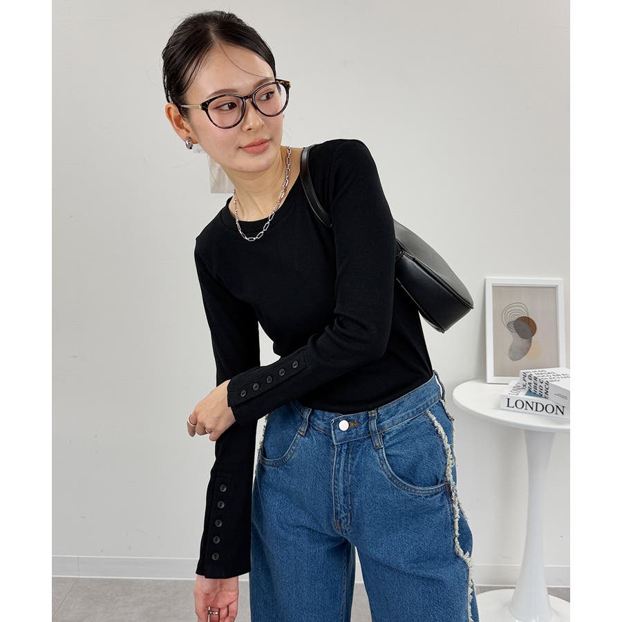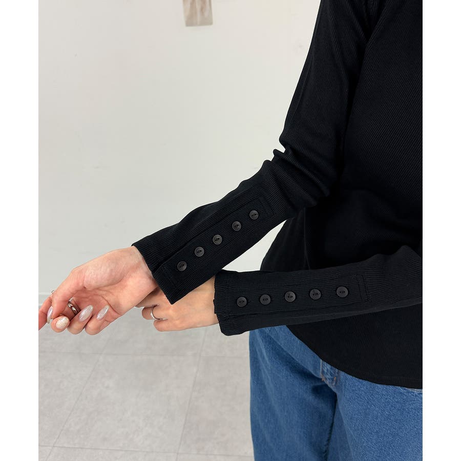 程よくフィットするコンパクトなラインが女性らしさを引き立て、袖口のボタンが視線を集めるバランス。