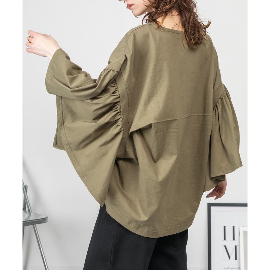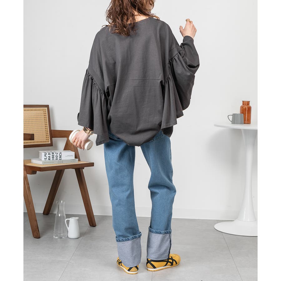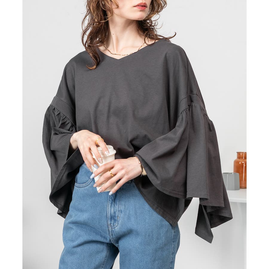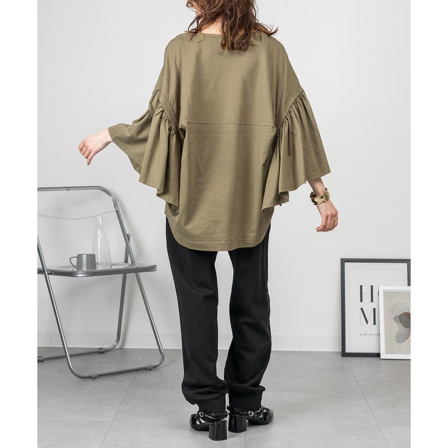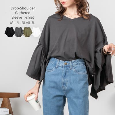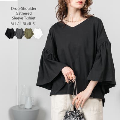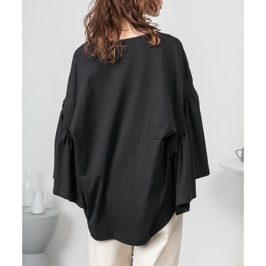 ドロップショルダーとギャザースリーブが特徴的なカットソー。