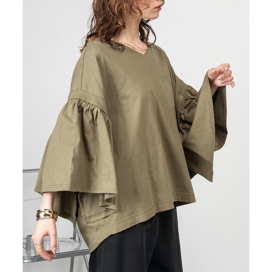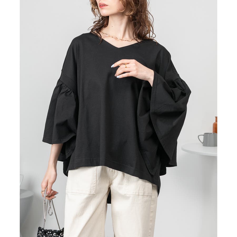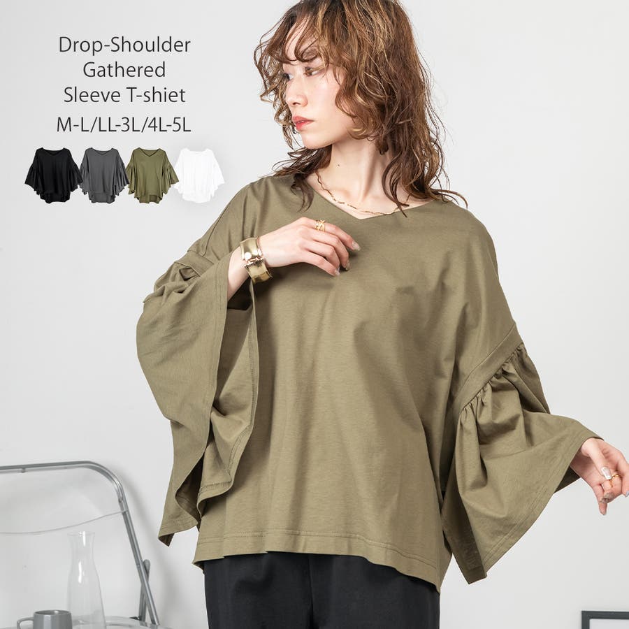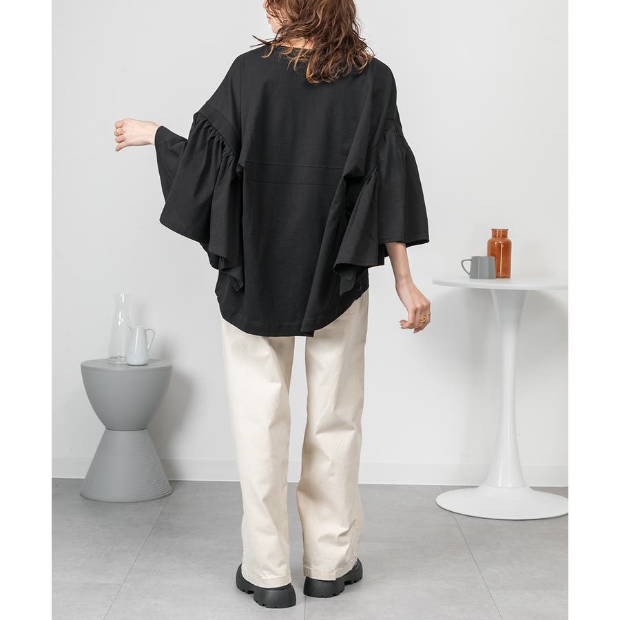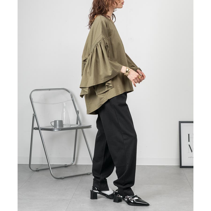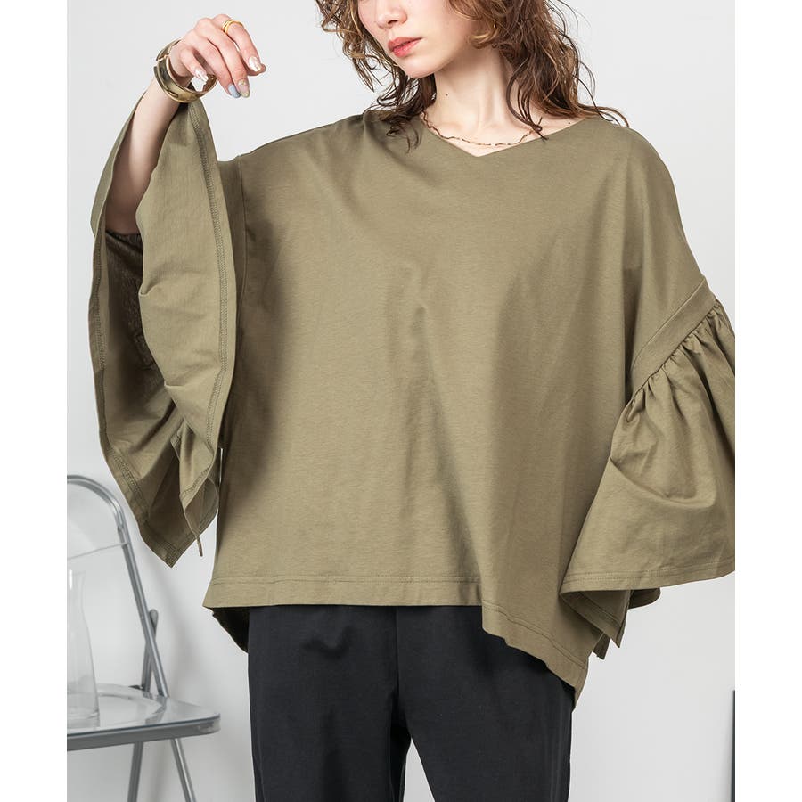 ドロップショルダーとギャザースリーブが特徴的なカットソー。