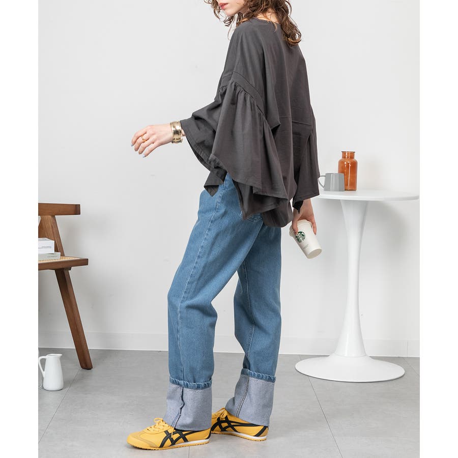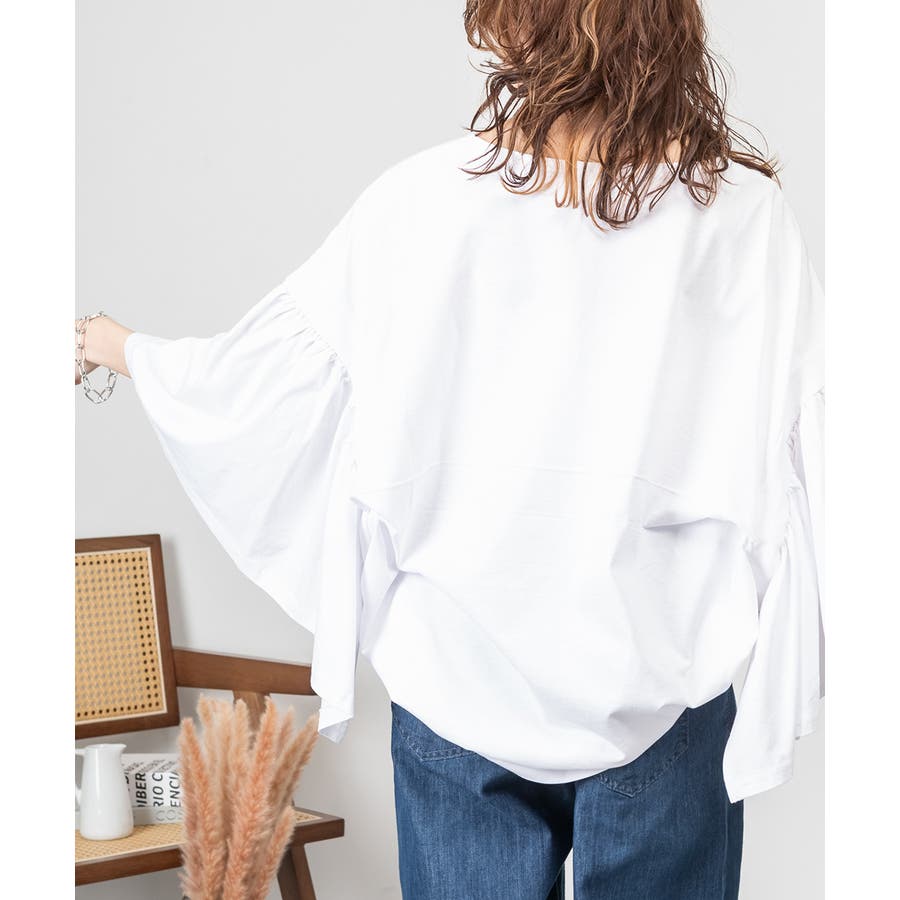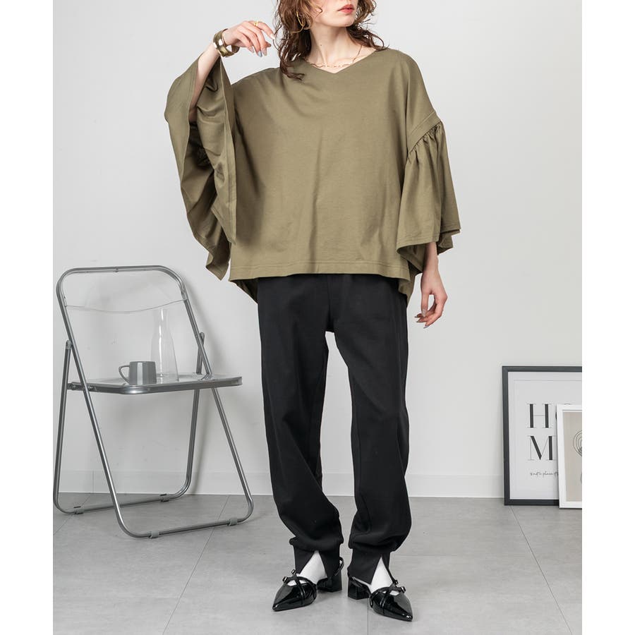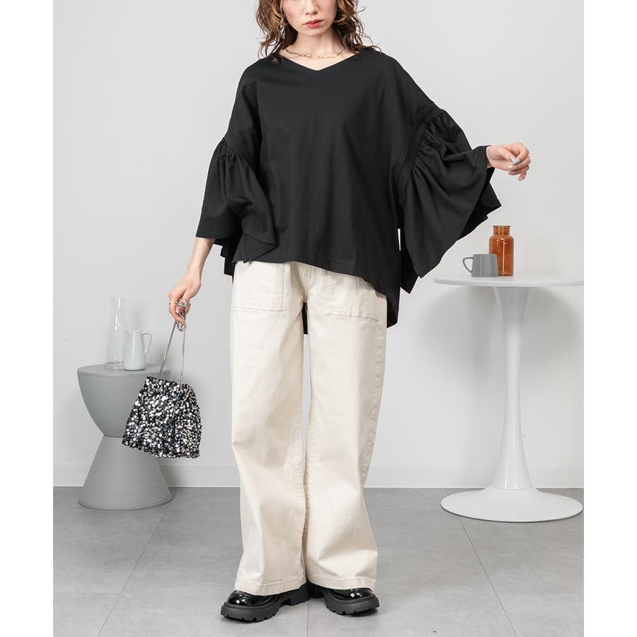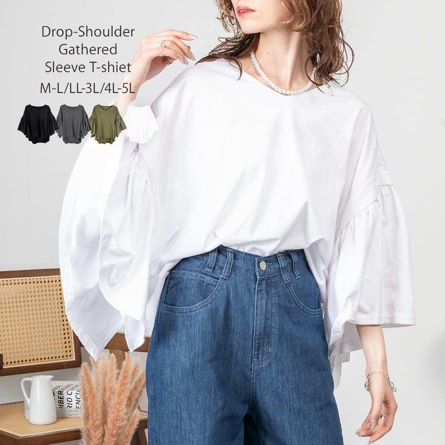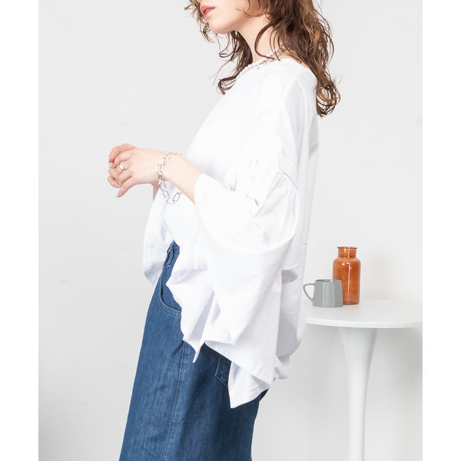 ドロップショルダーとギャザースリーブが特徴的なカットソー。