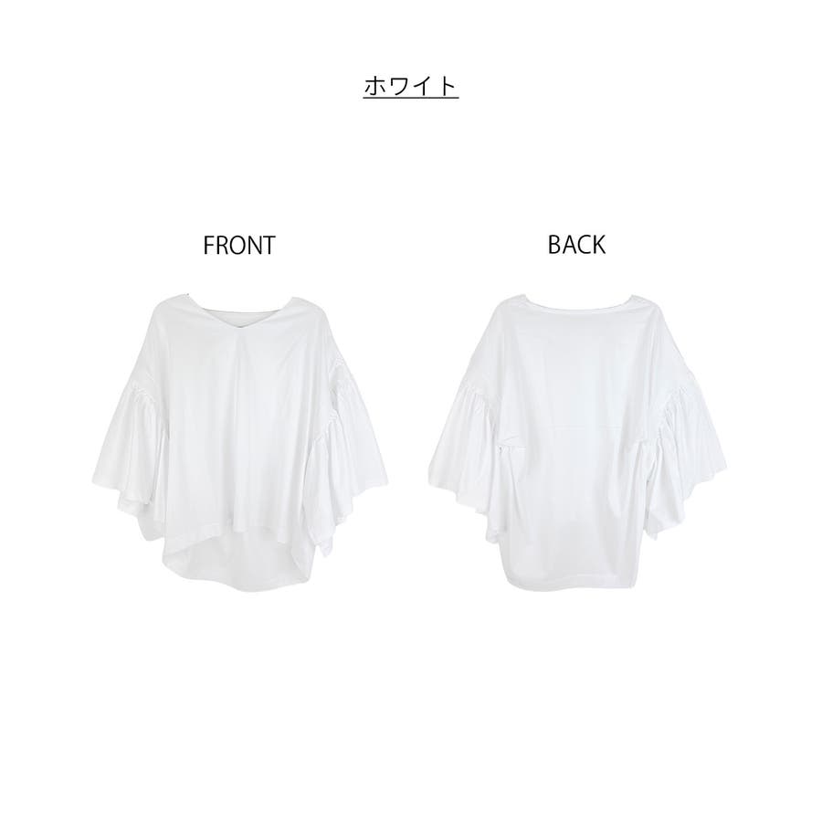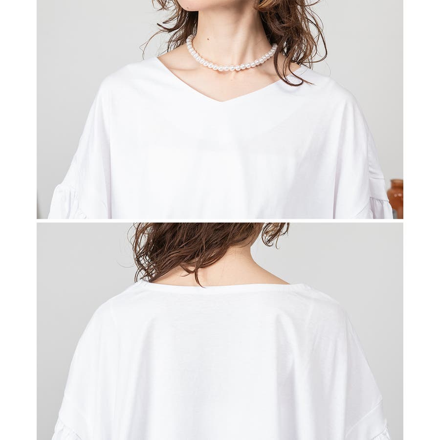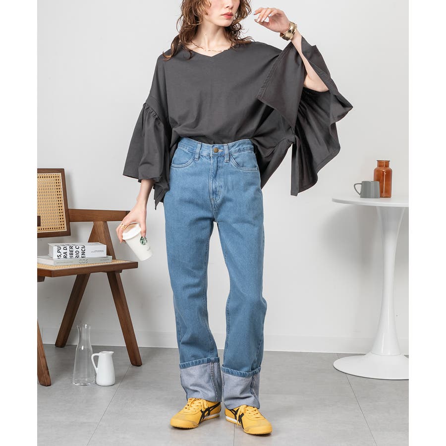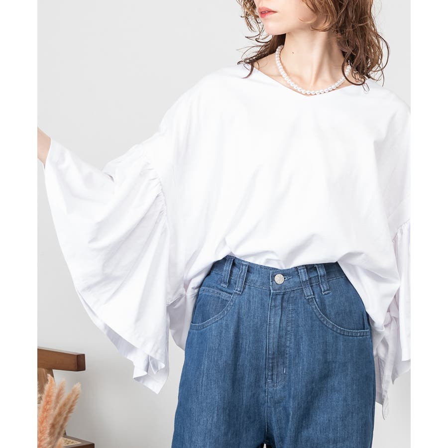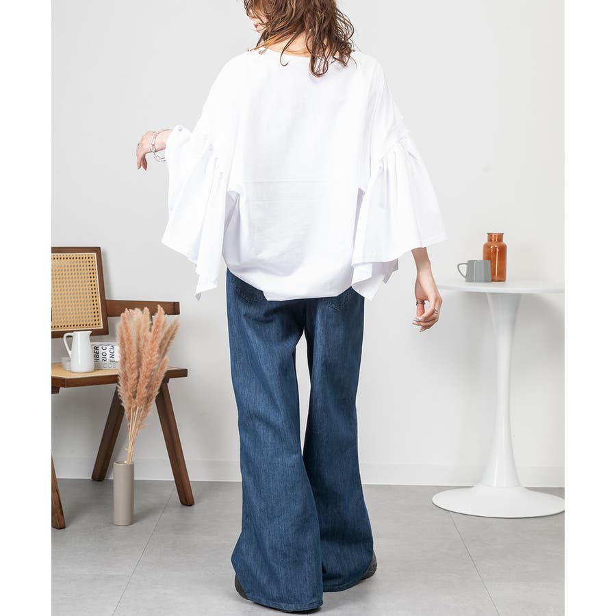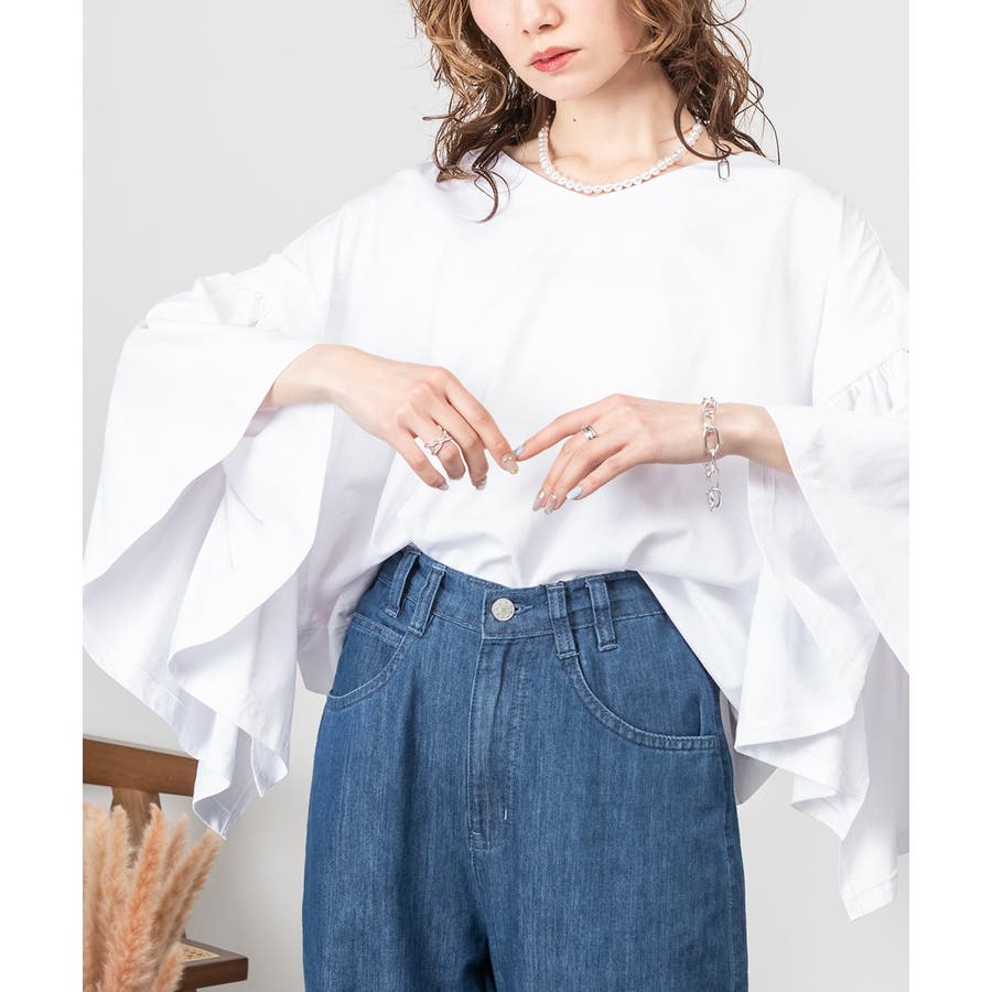 ドロップショルダーとギャザースリーブが特徴的なカットソー。