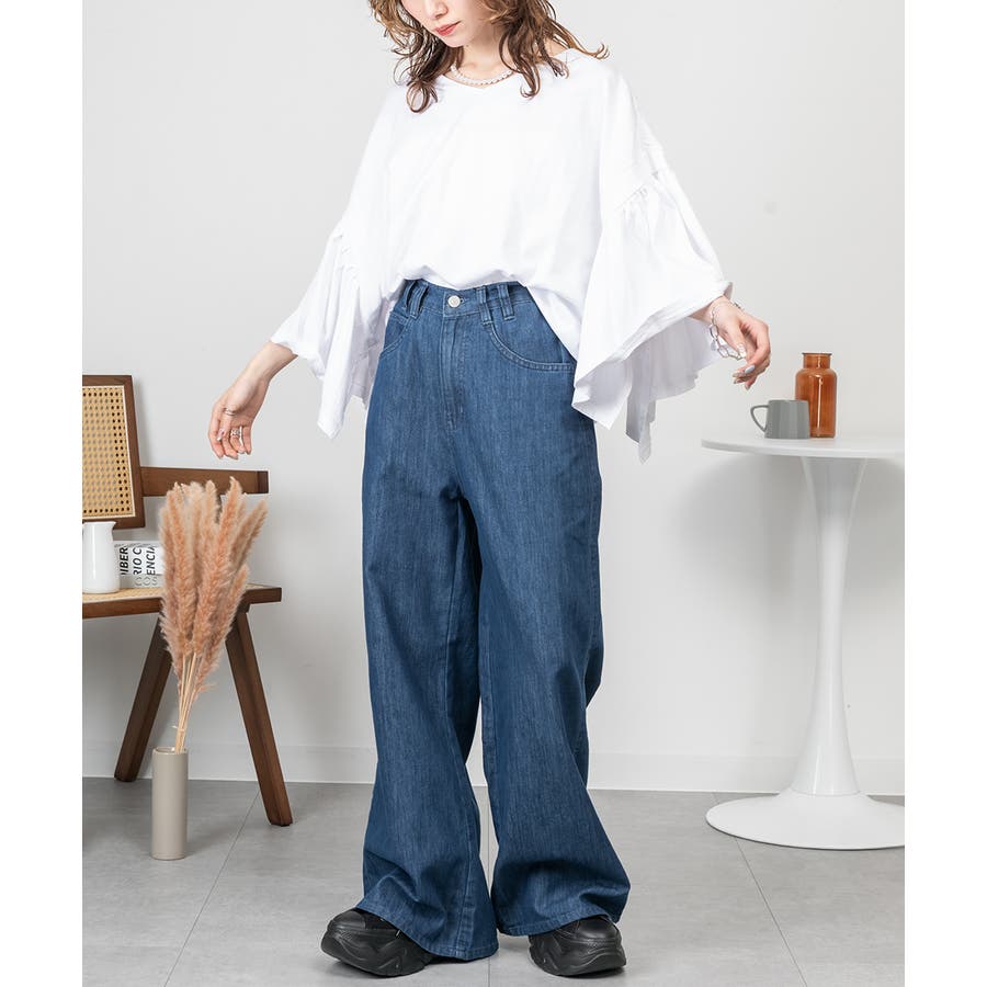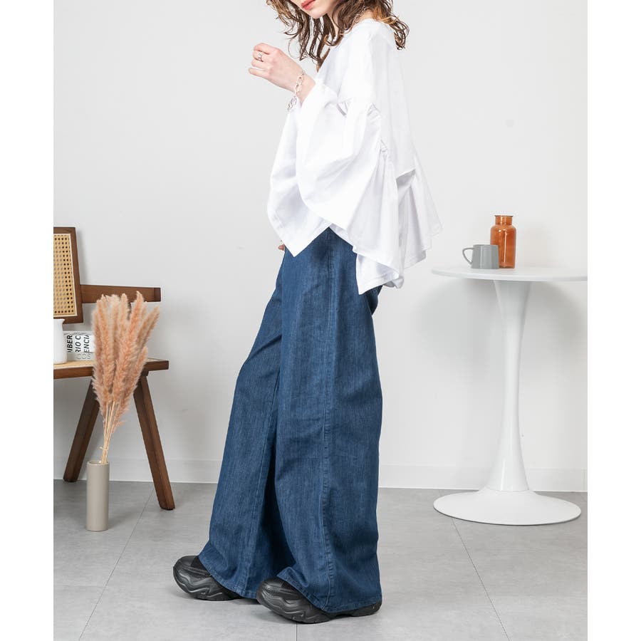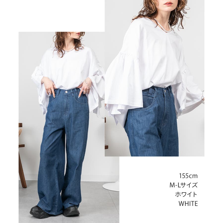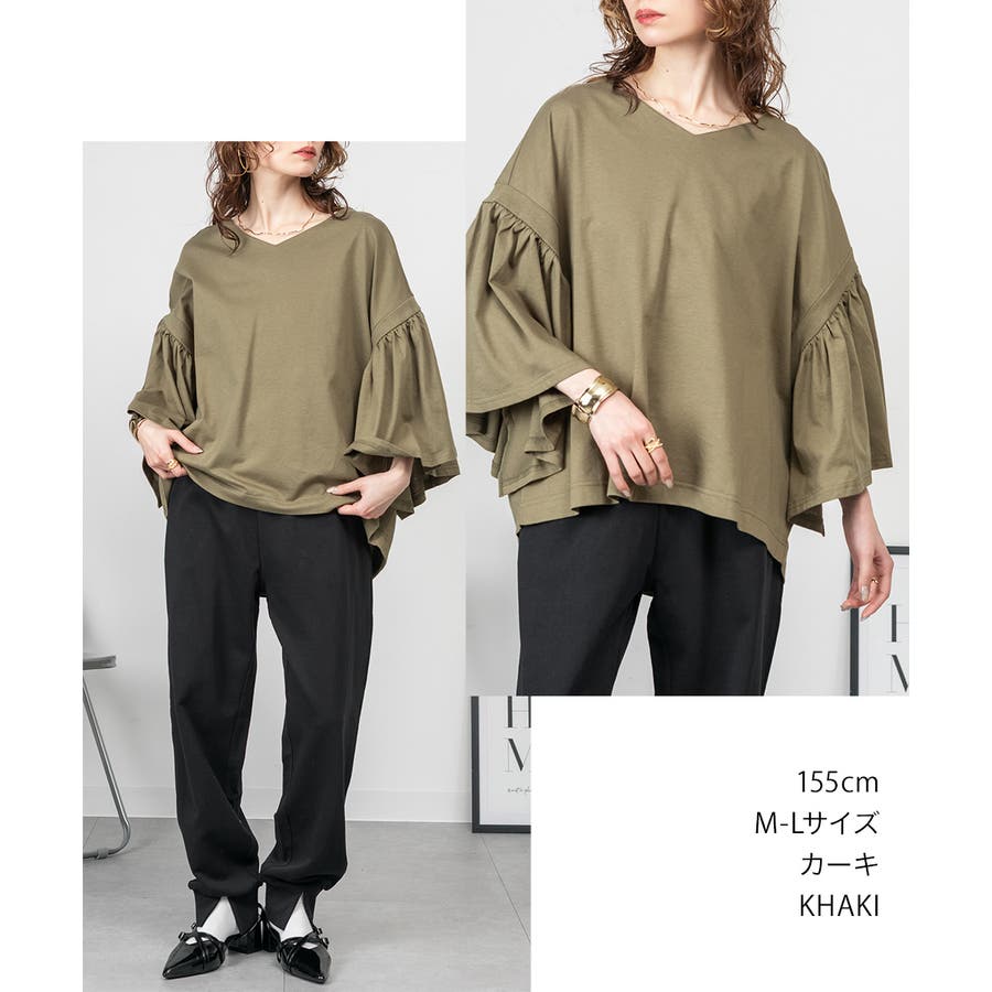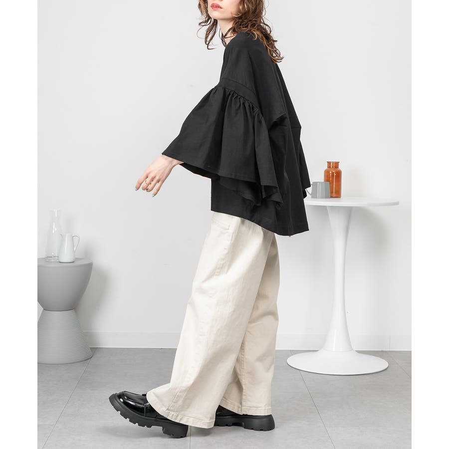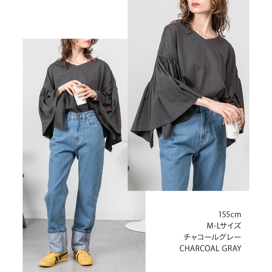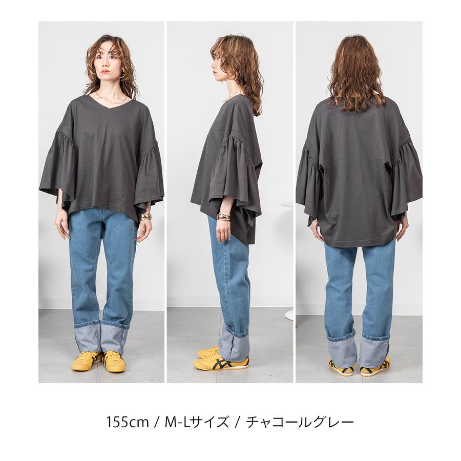 肩からふわっと落ちるドロップショルダーと、広めのギャザースリーブが上半身を華奢見えさせるバランス。
