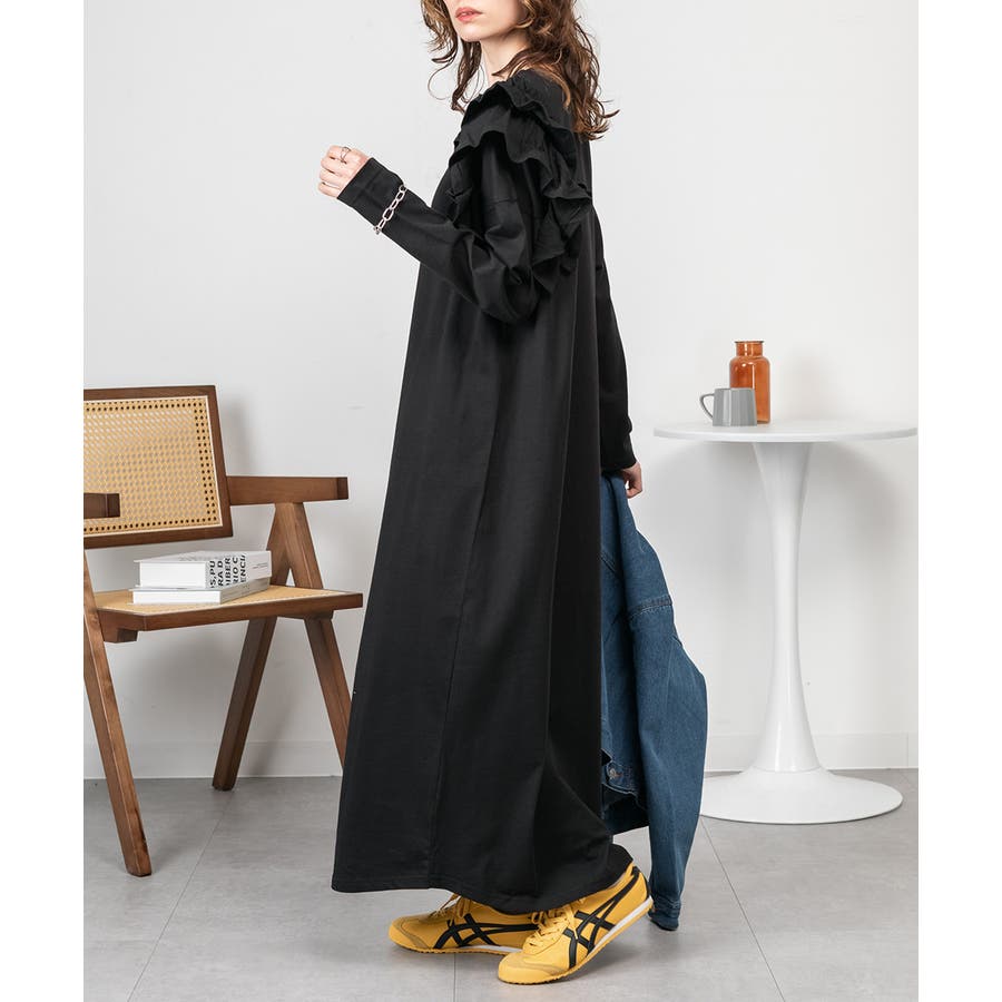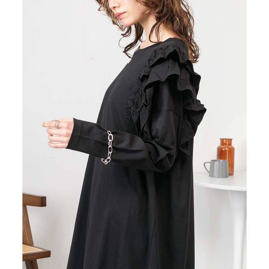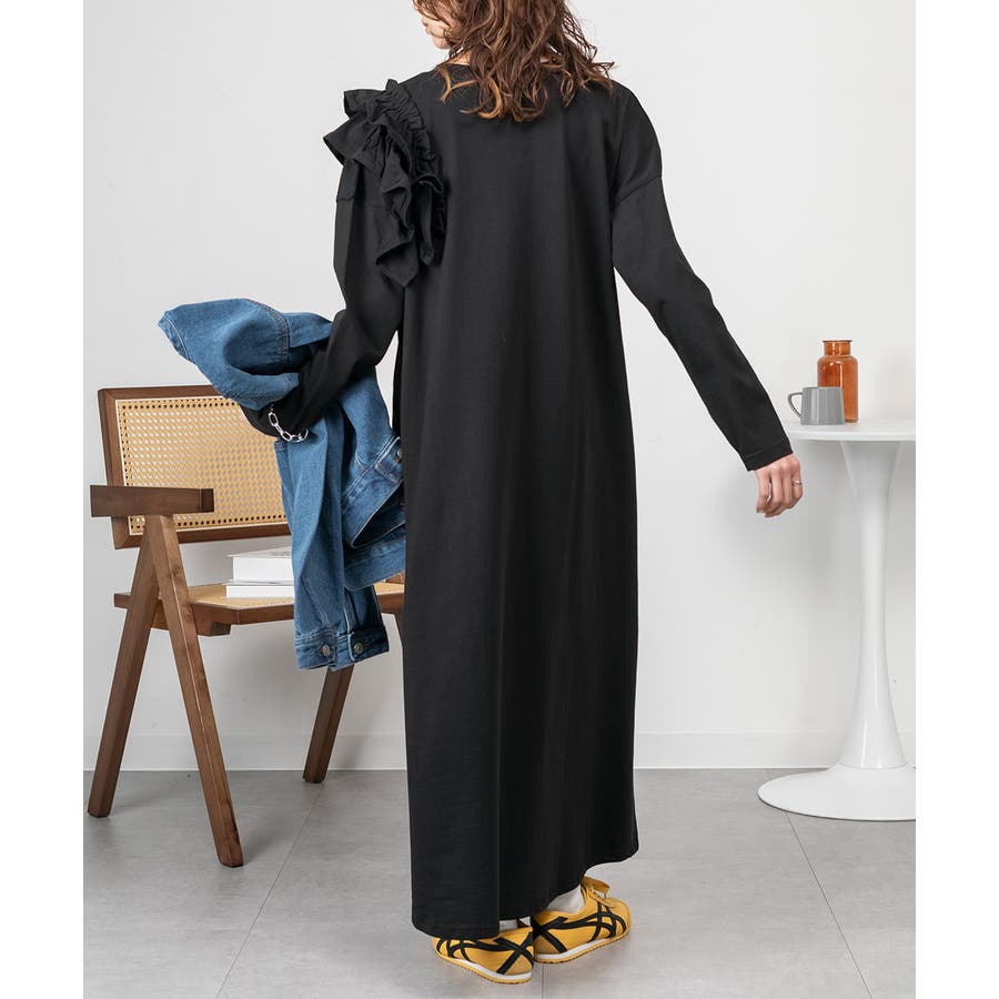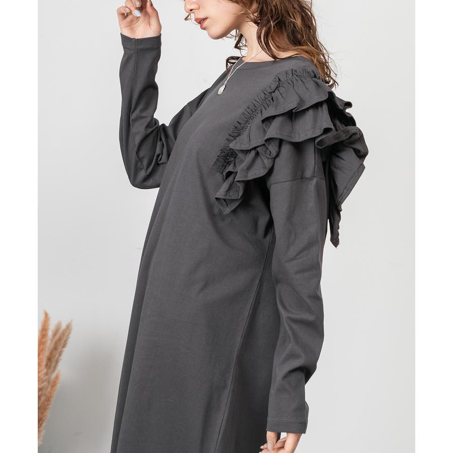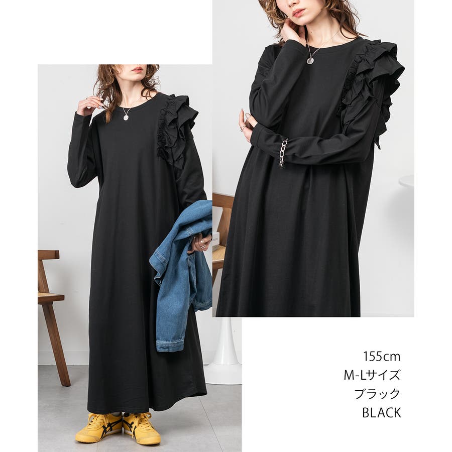 片袖のフリルデザインが、シンプルなワンピースに華やかさを加え、女性らしさを引き立てます。