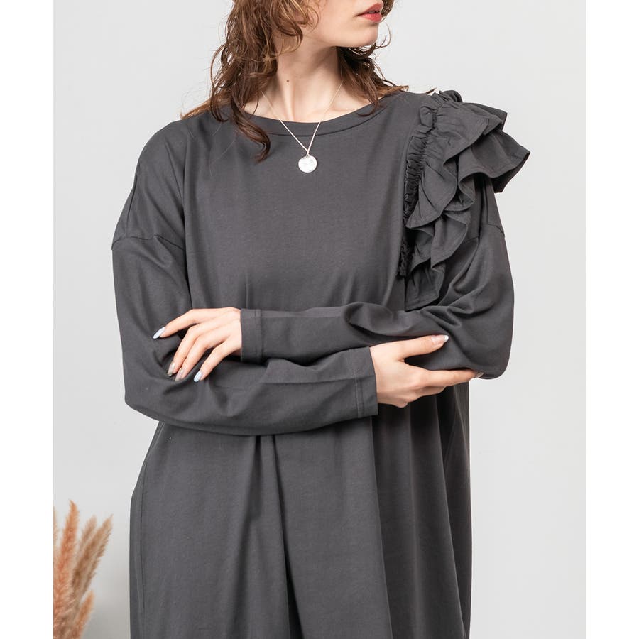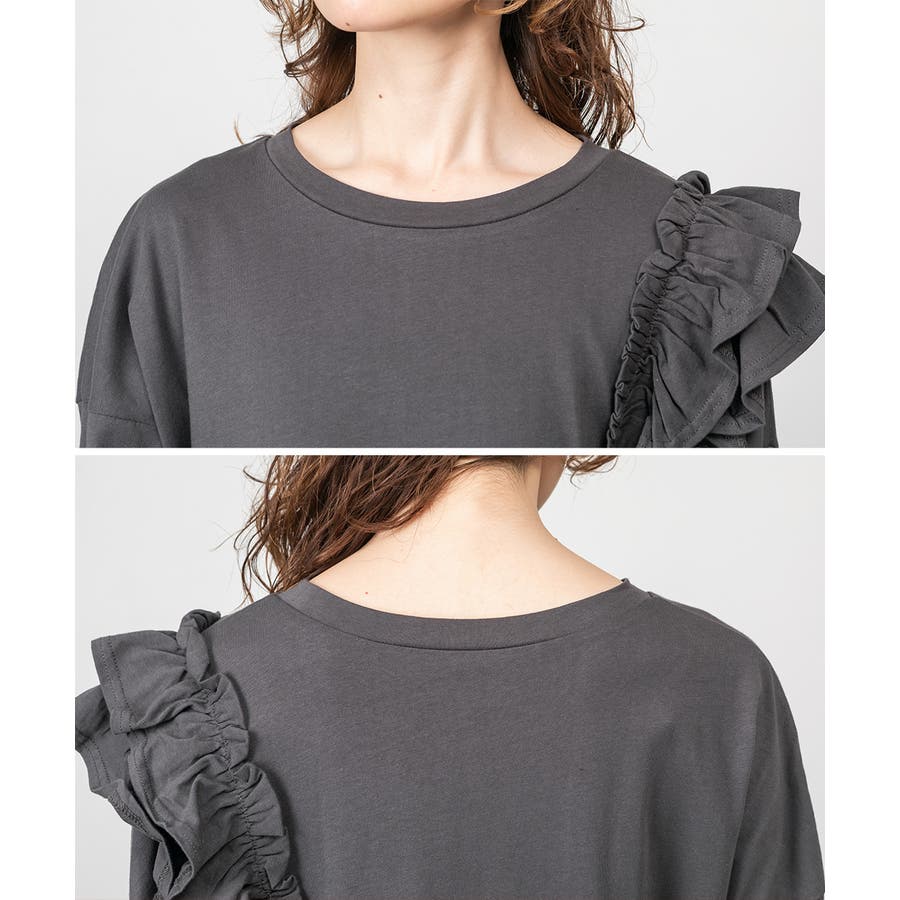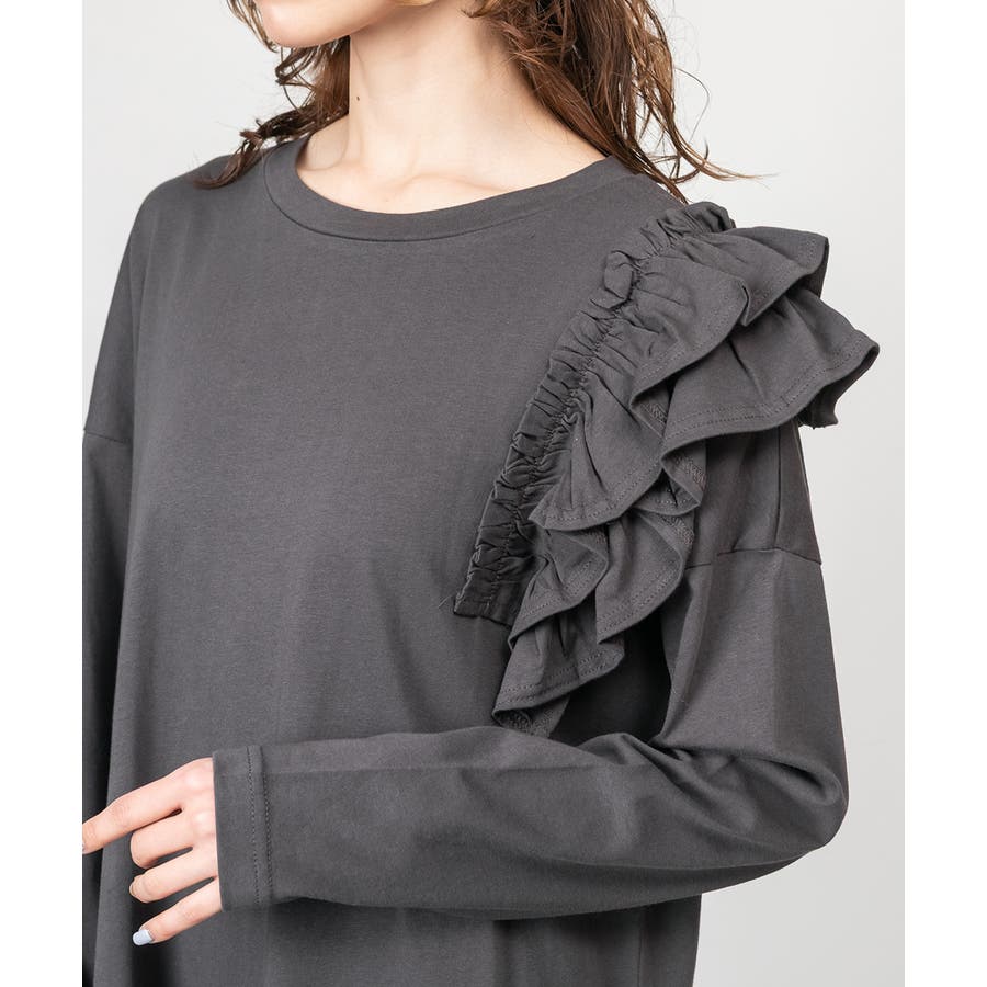 ゆったりとしたリラックスシルエットに、片側だけのフリルが立体感を生み、自然に体型をカバー。