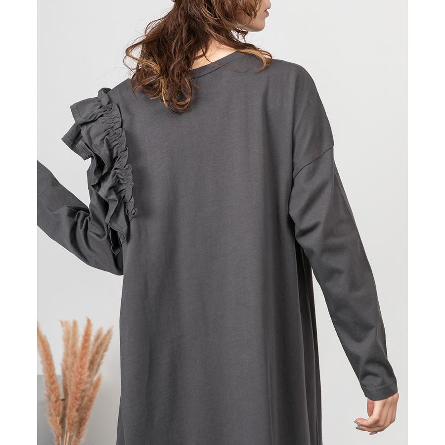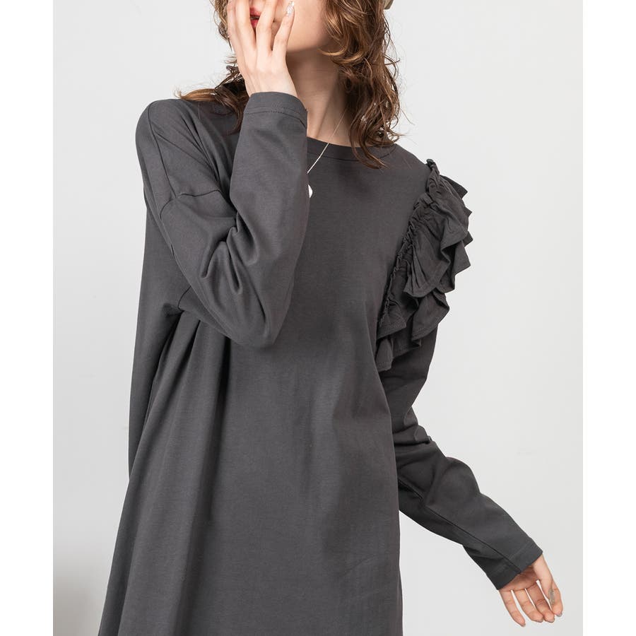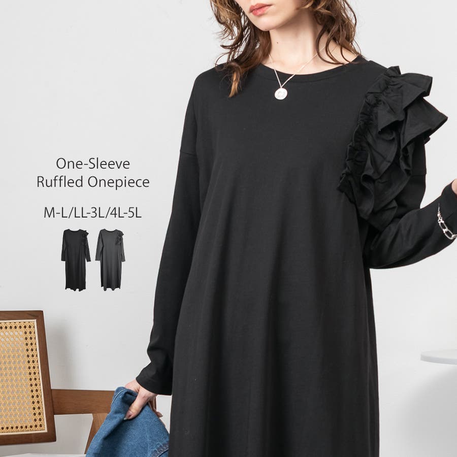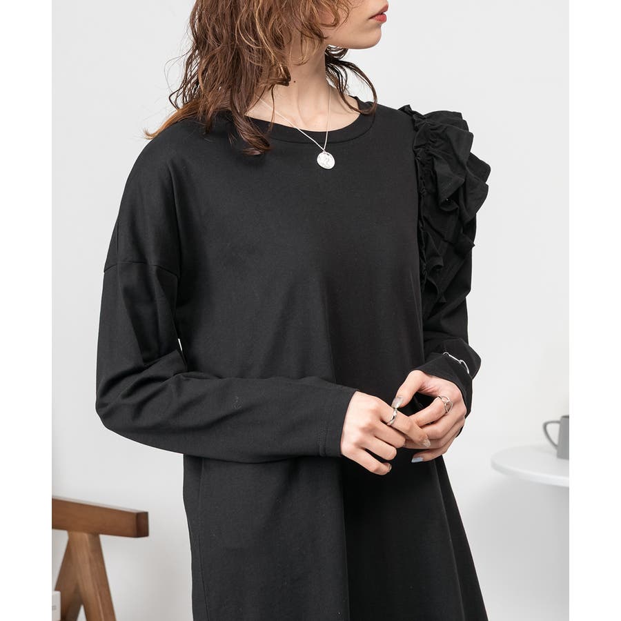 大人気の片袖フリル長袖カットソー(WK-0362)のシルエットをベースにした、片袖フリルワンピース。
