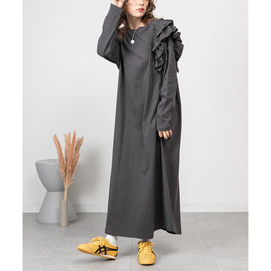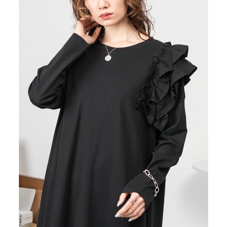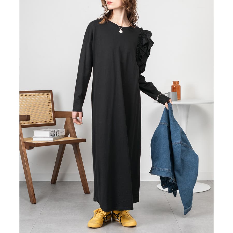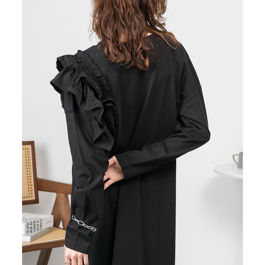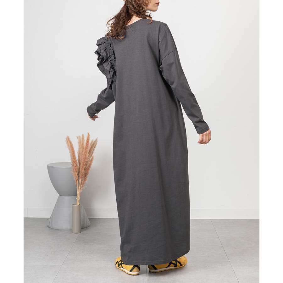 大人気の片袖フリル長袖カットソー(WK-0362)のシルエットをベースにした、片袖フリルワンピース。