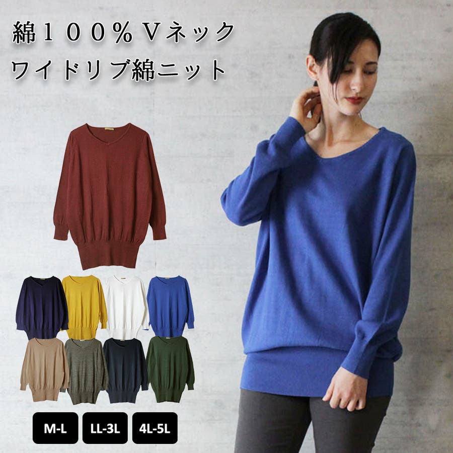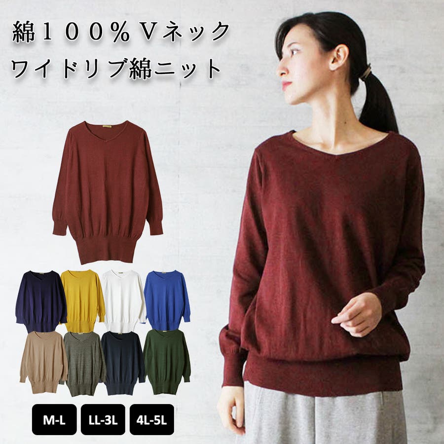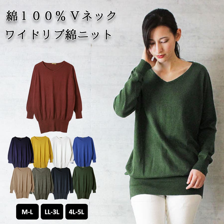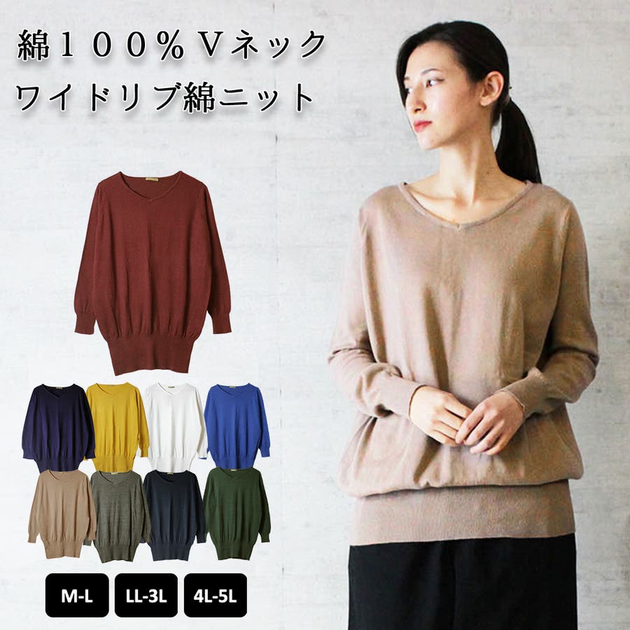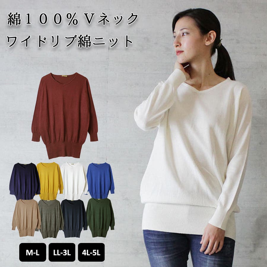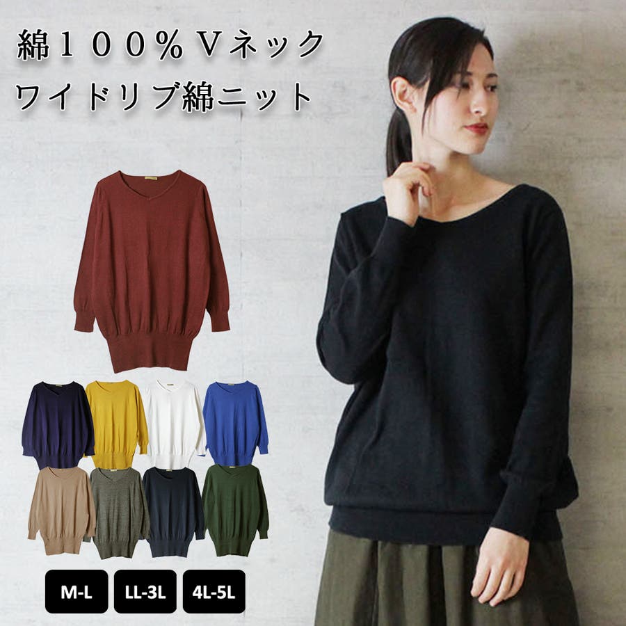 Vネックワイドリブ綿ニット