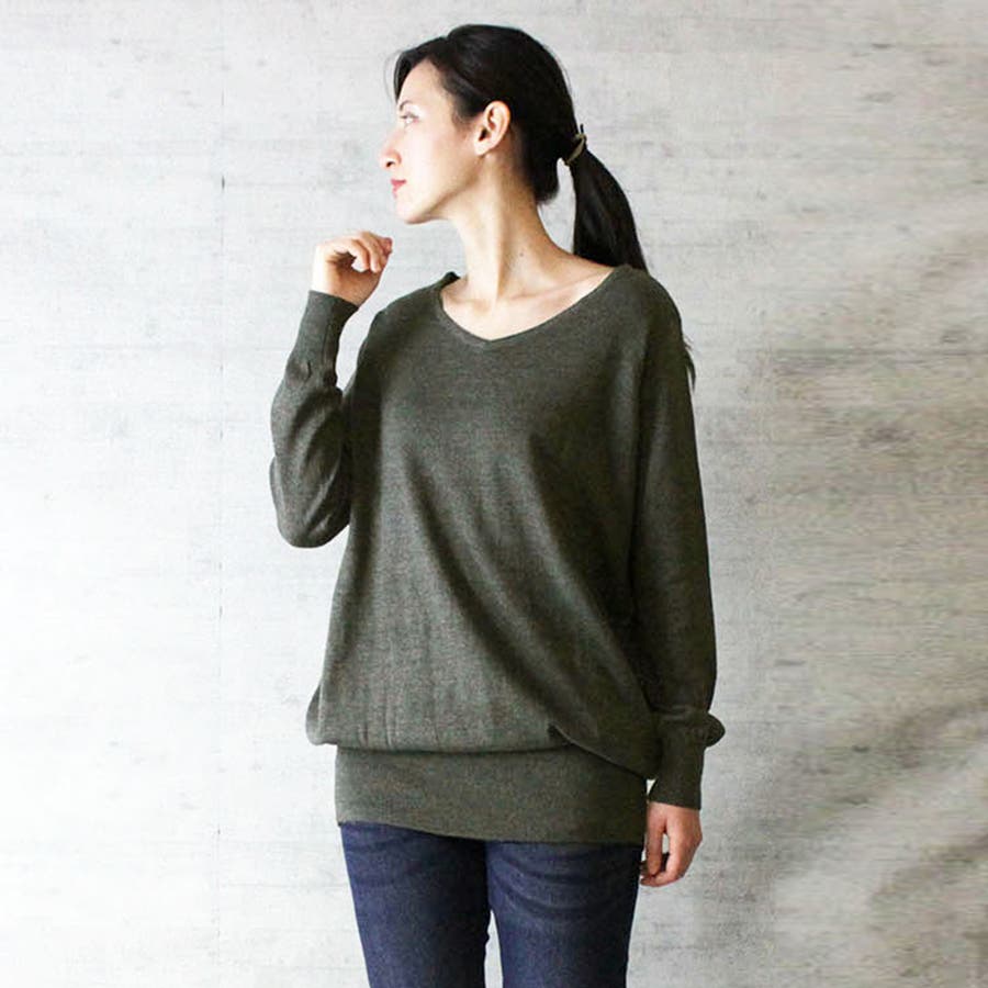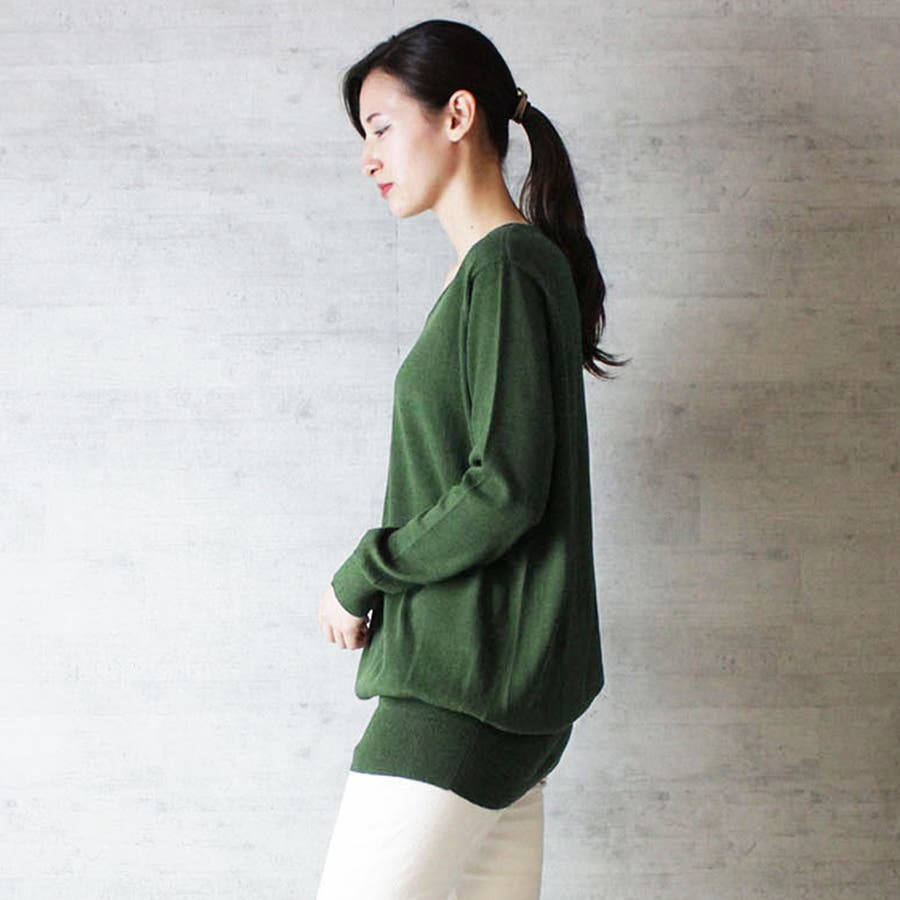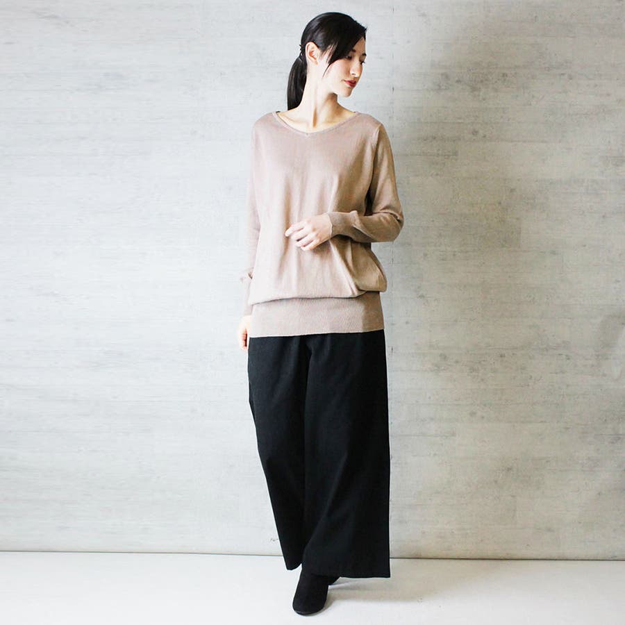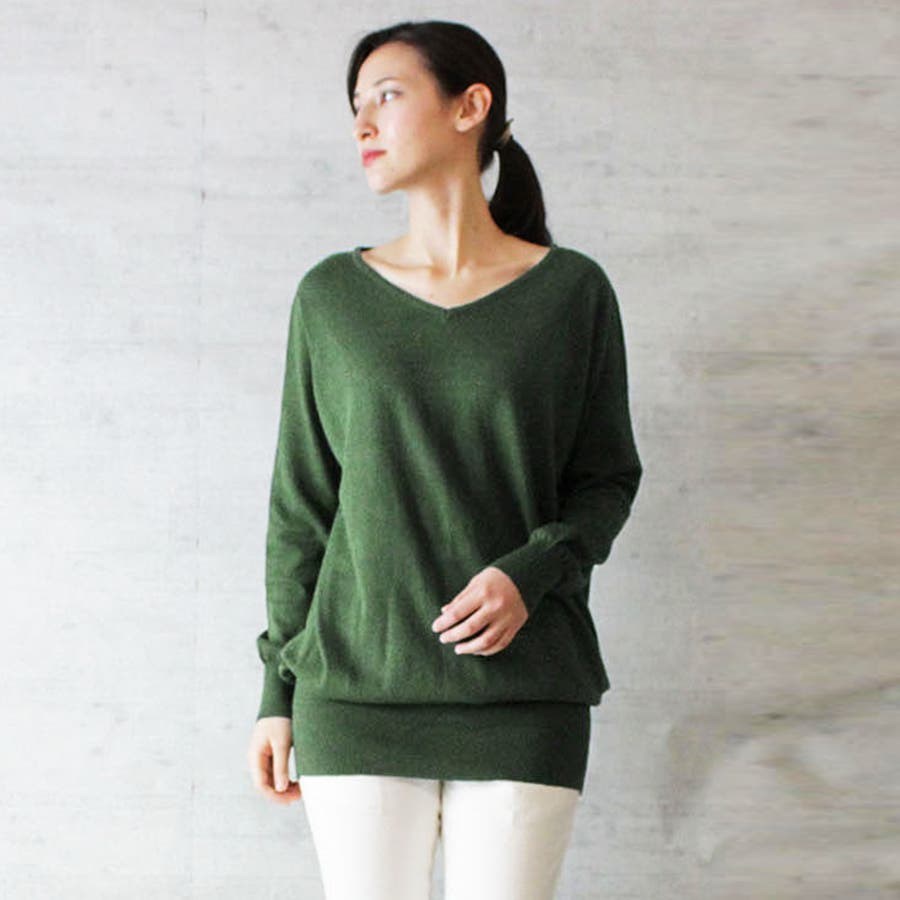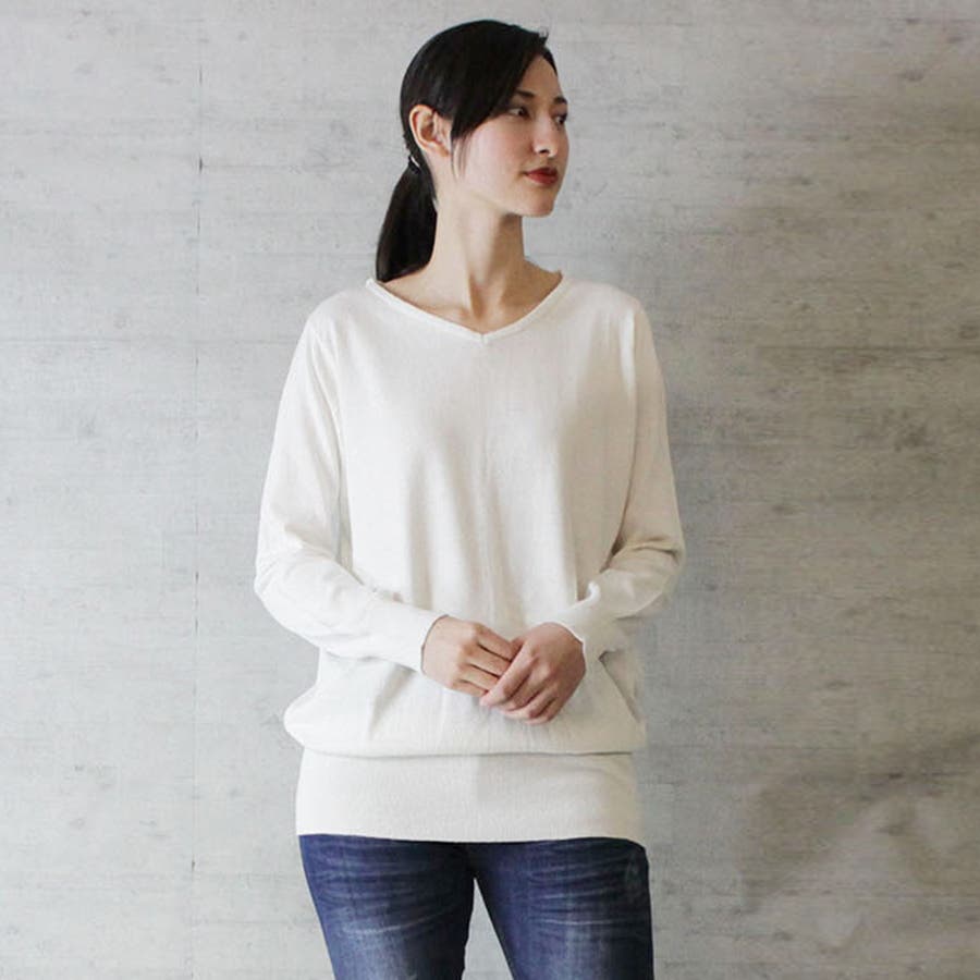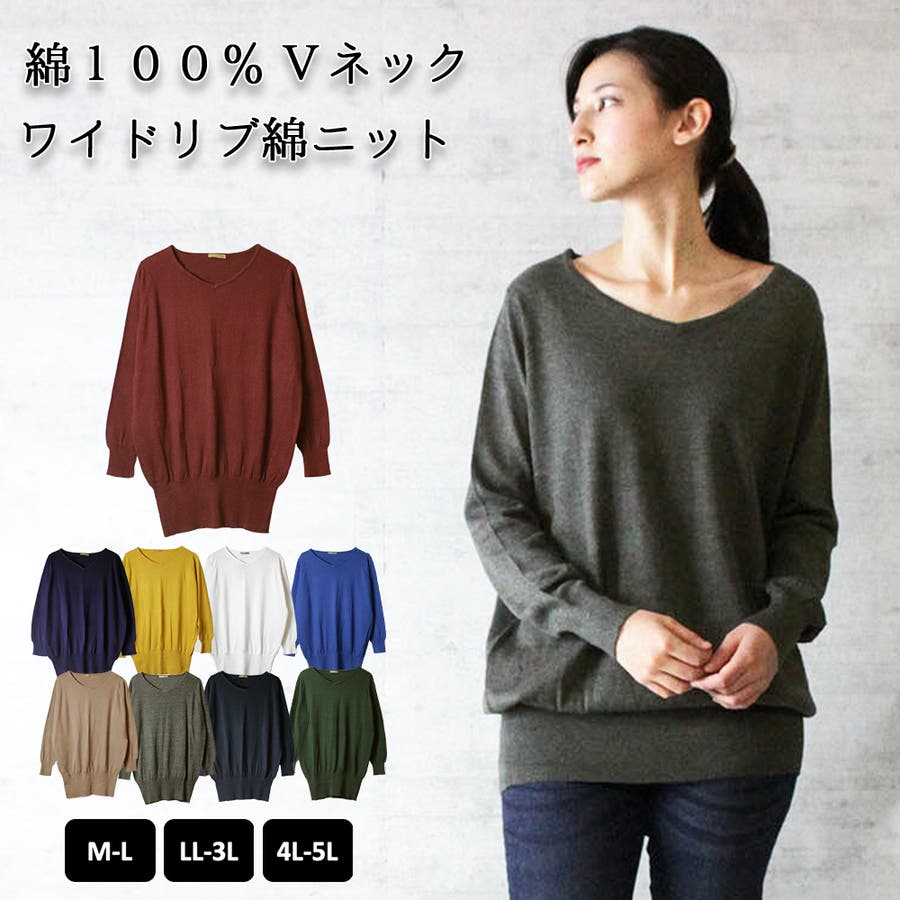 Vネックワイドリブ綿ニット