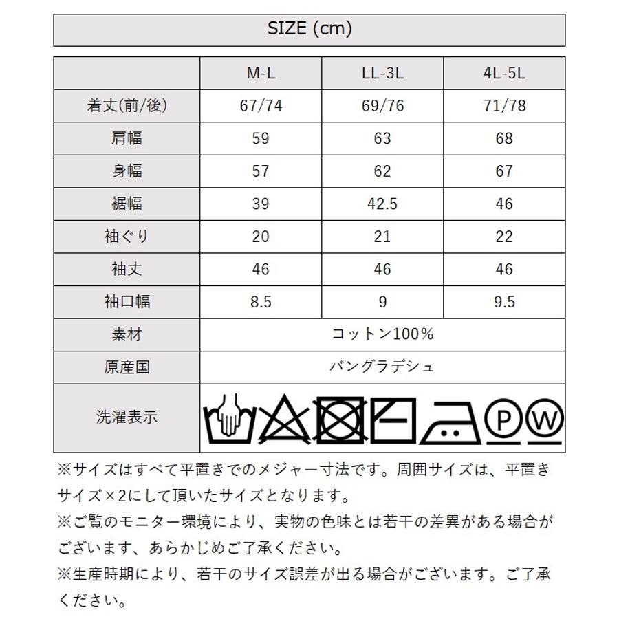 [LL-3Lサイズ]着丈(前/後):69cm/76cm、肩幅:63cm、身幅:62cm、袖幅:20cm、袖丈:46cm