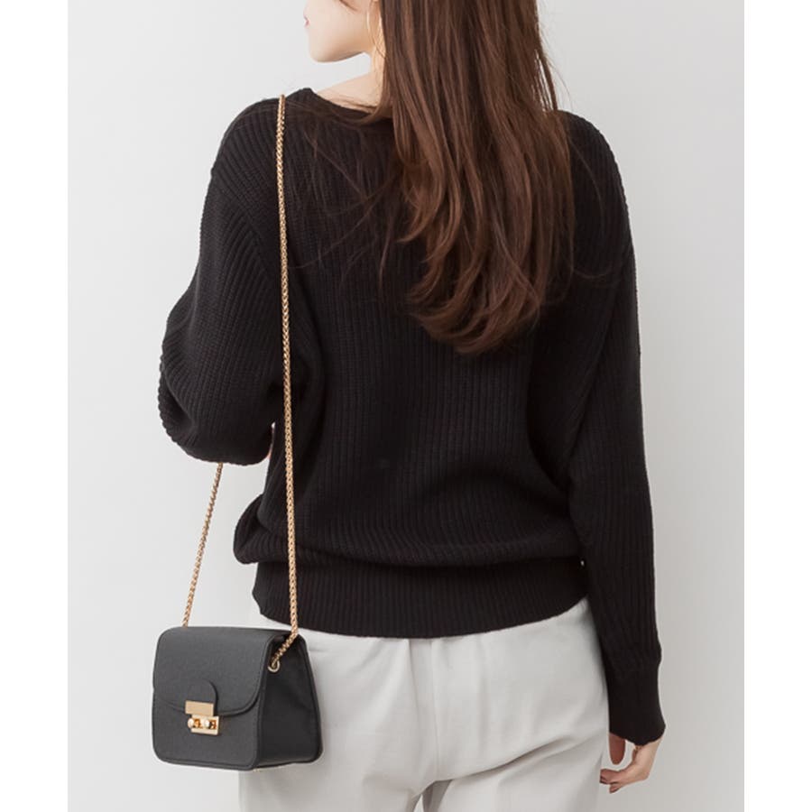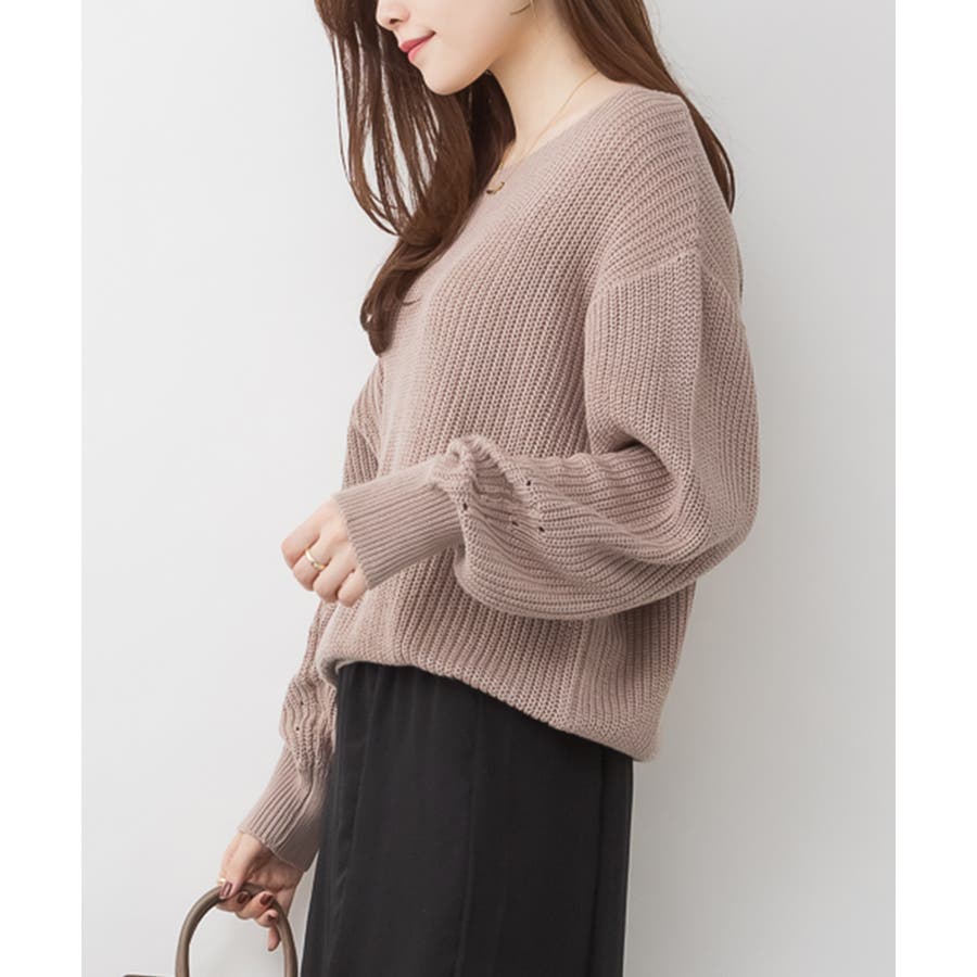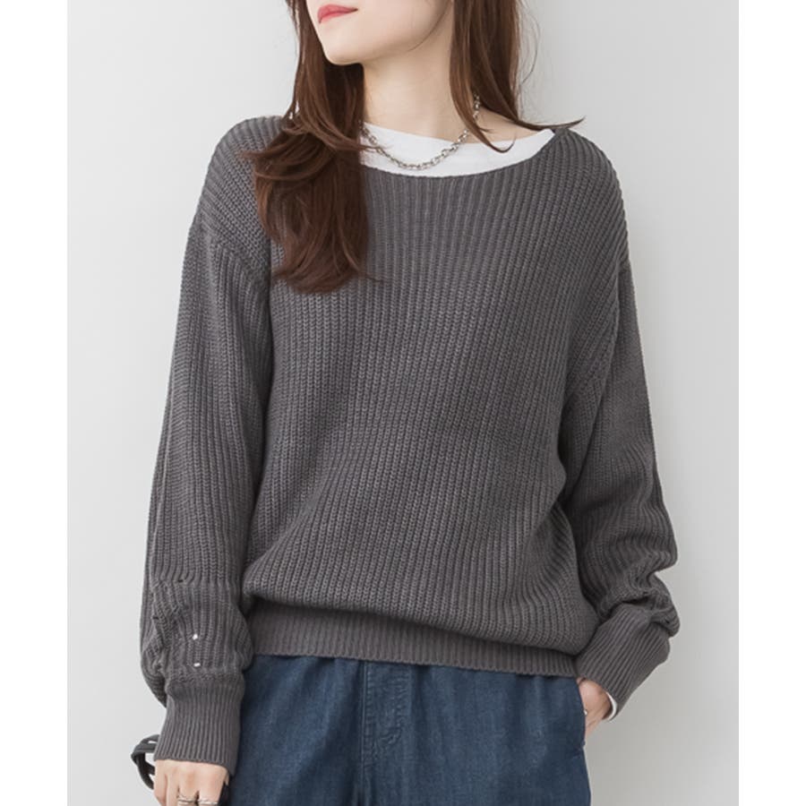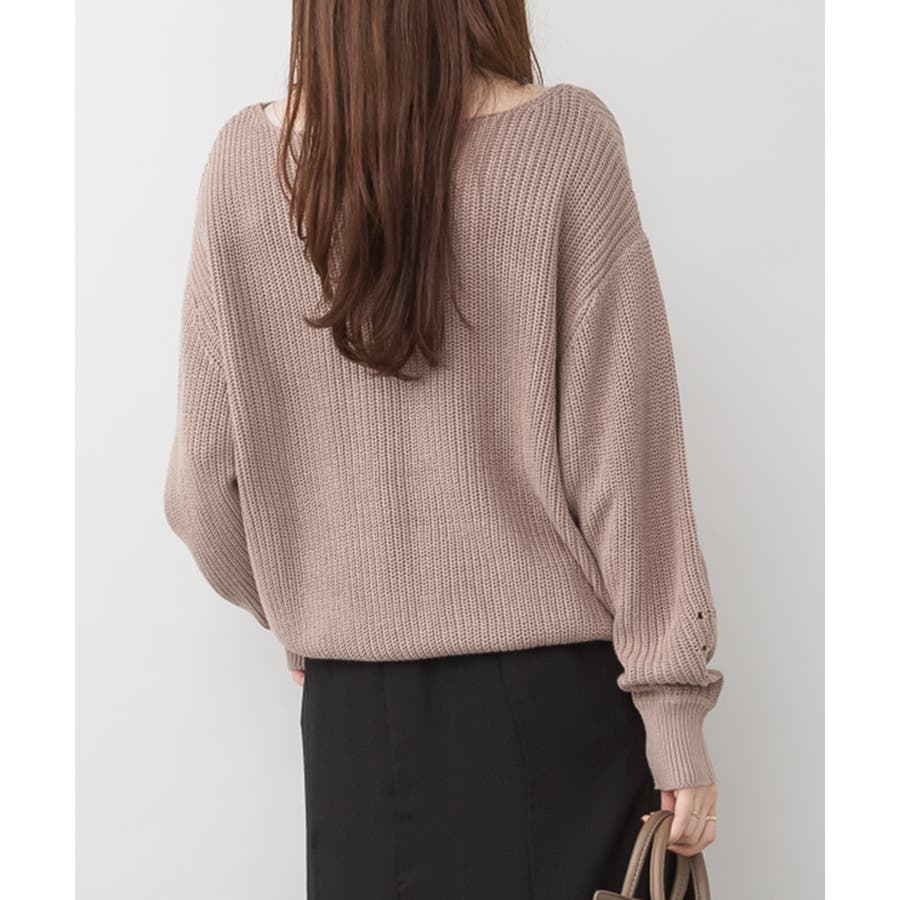 広めのネックラインが洗練された印象を与え、畔編みの独特なテクスチャーがスタイリッシュな雰囲気を演出します。