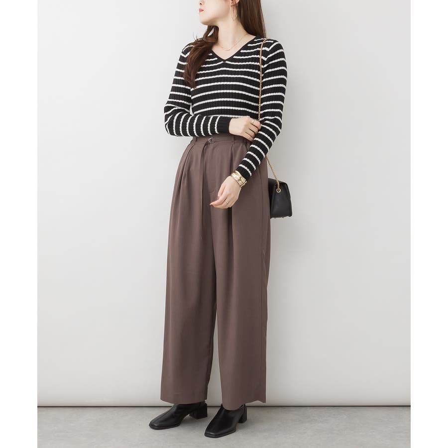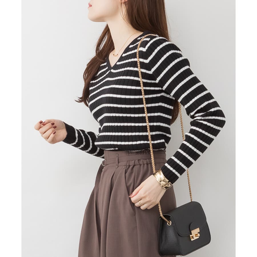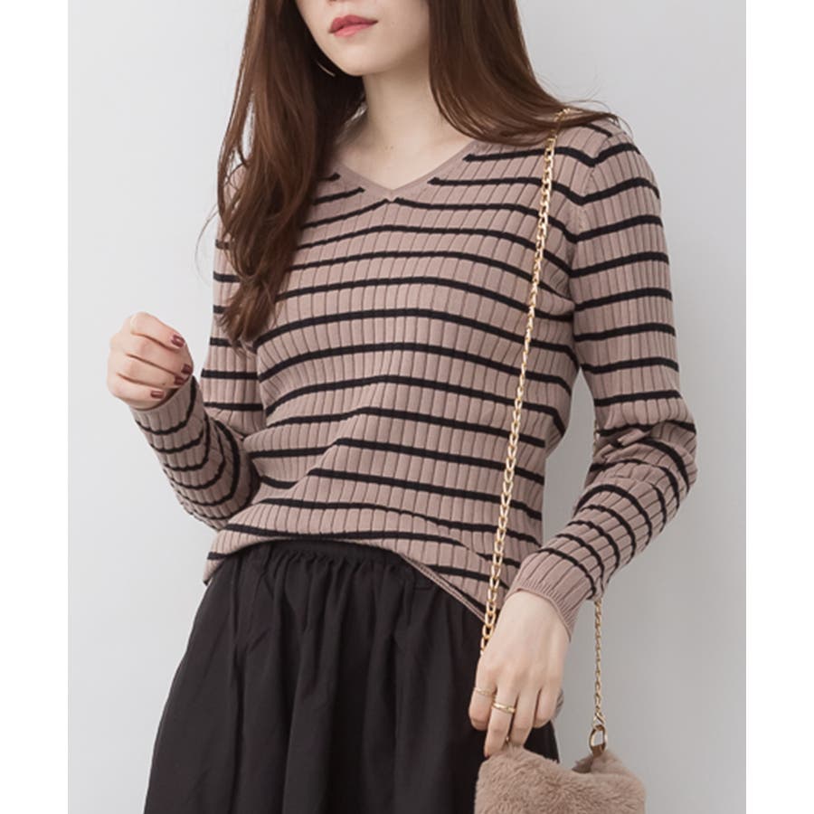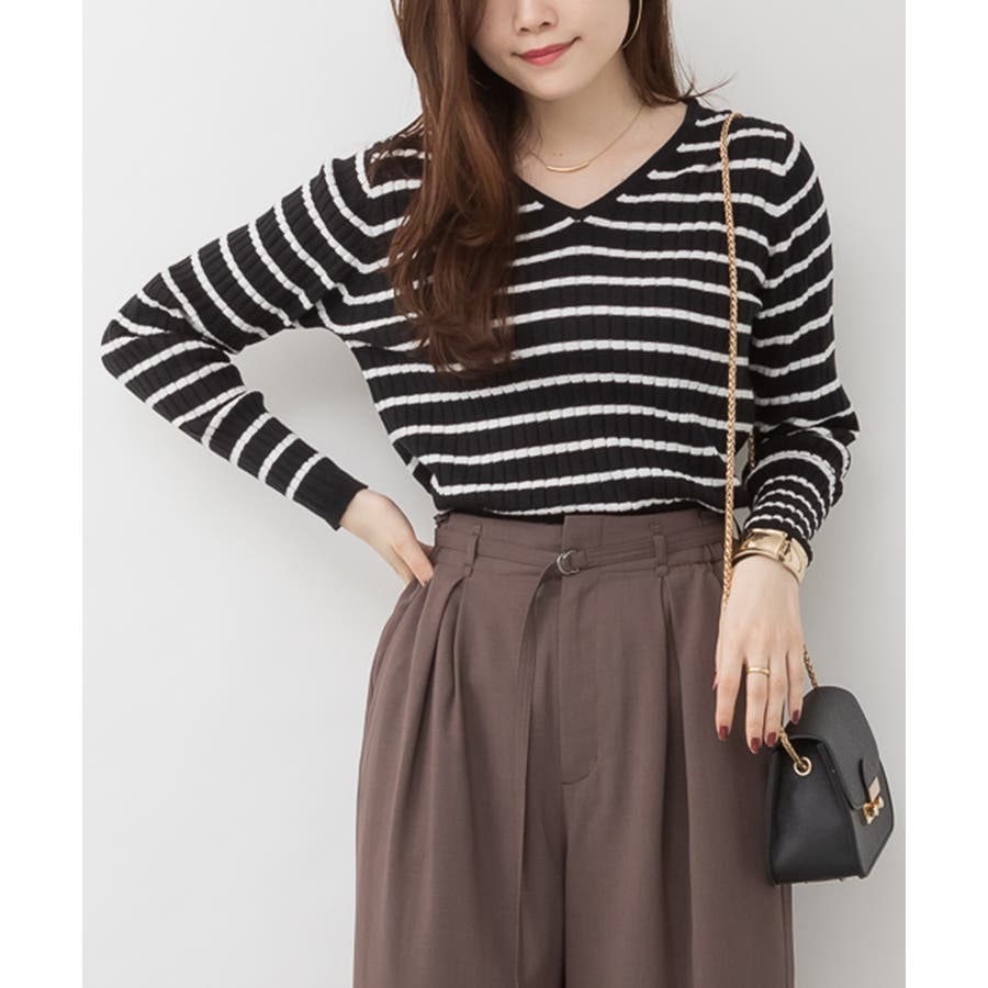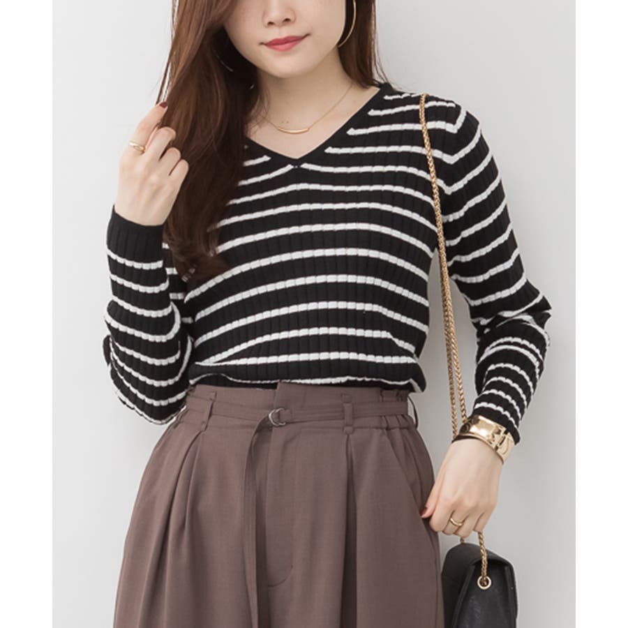クラシックなボーダーデザインがカジュアルながら洗練されたスタイルを演出し、Vネックラインが顔周りをすっきりと見せます。